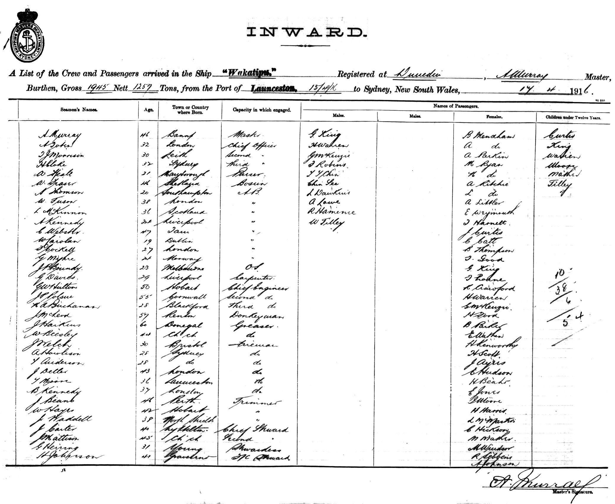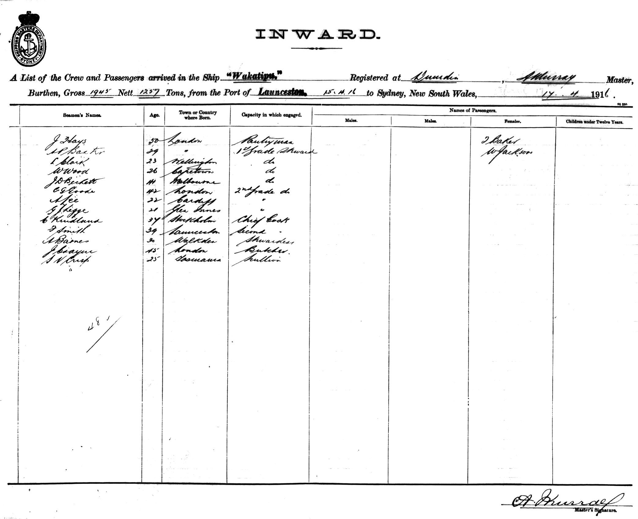 WAKATIPUOF DUNEDIN, A. MURRAY, MASTER, BURTHEN 1945/1257 TONS FROM THE PORT OF LAUNCESTON TO SYDNEY, NEW SOUTH WALES, 17TH APRIL 1916 |