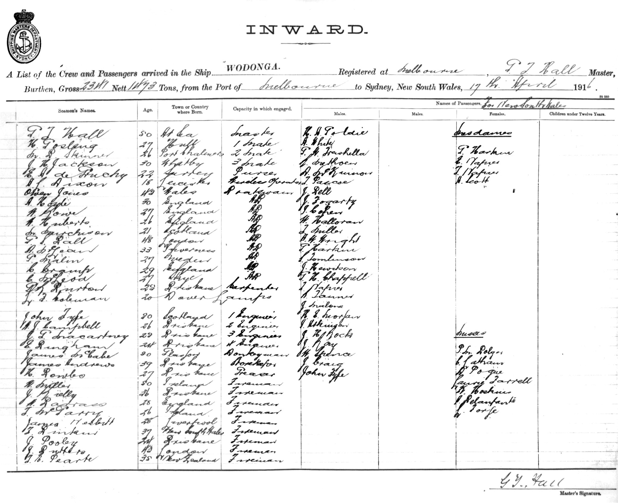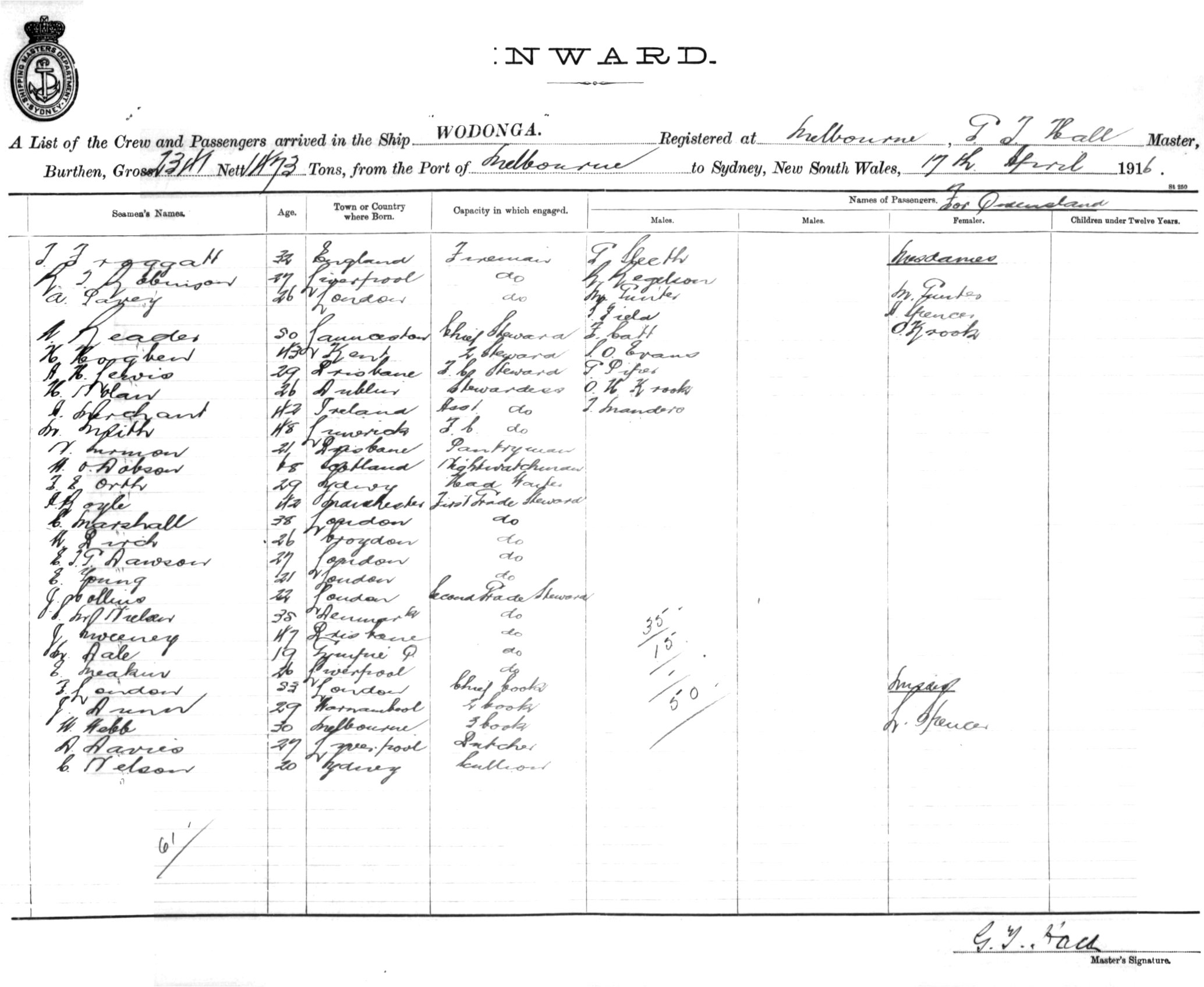 WODONGAOF MELBOURNE, G. T. HALL, MASTER, BURTHEN 2341/1473 TONS FROM THE PORT OF MELBOURNE TO SYDNEY, NEW SOUTH WALES, 17TH APRIL 1916 |