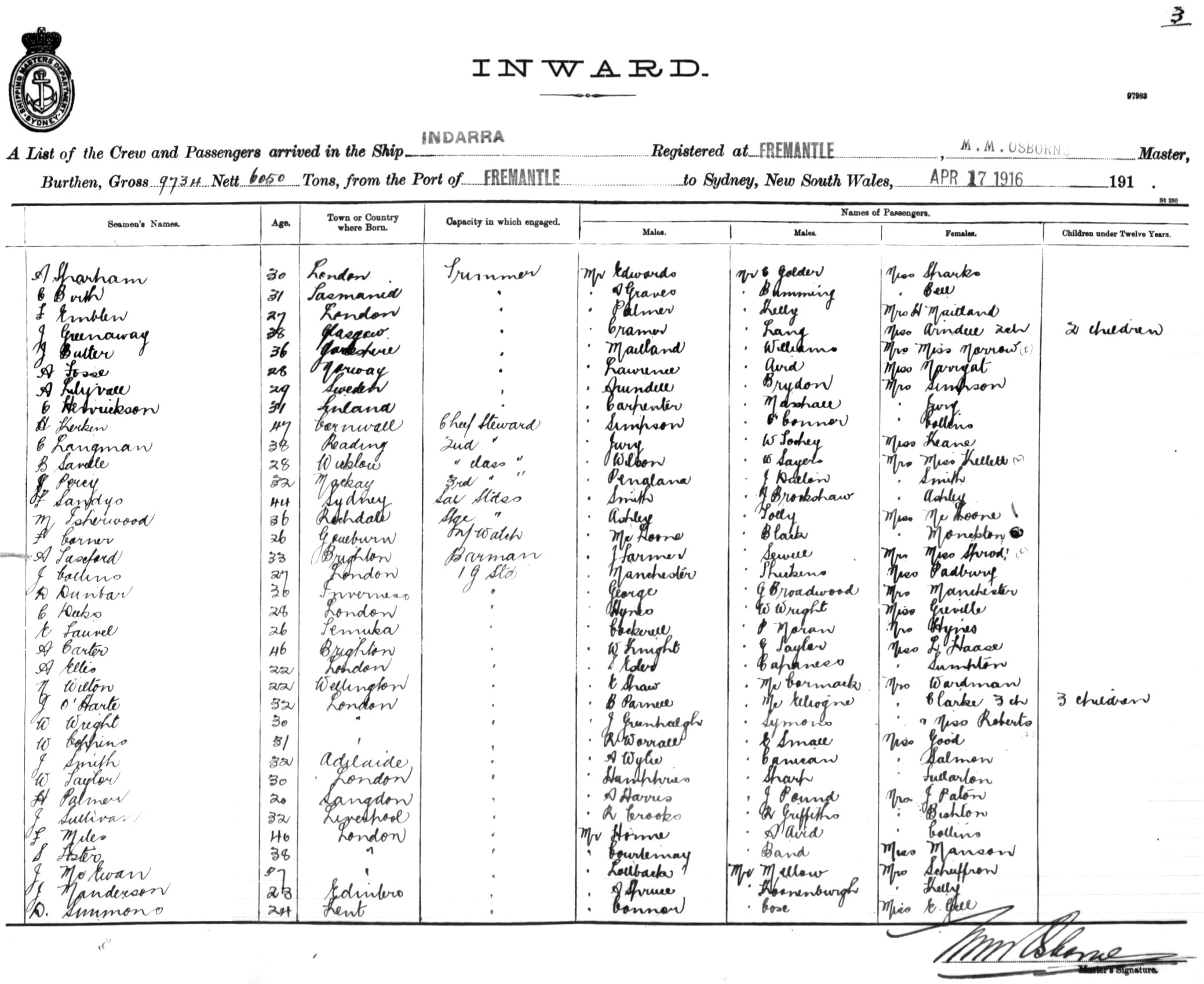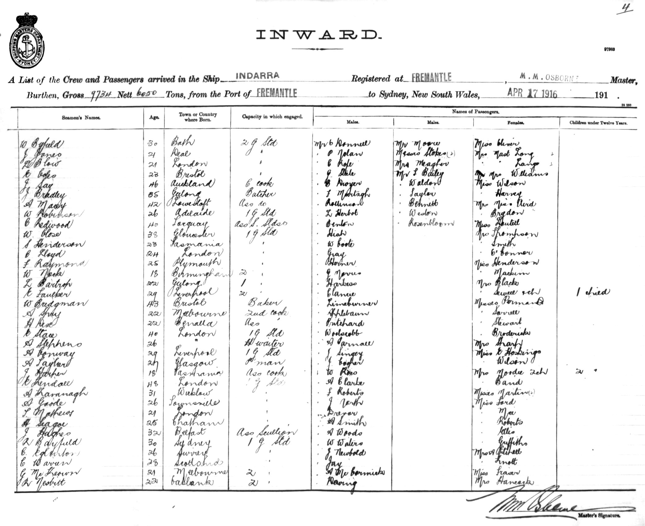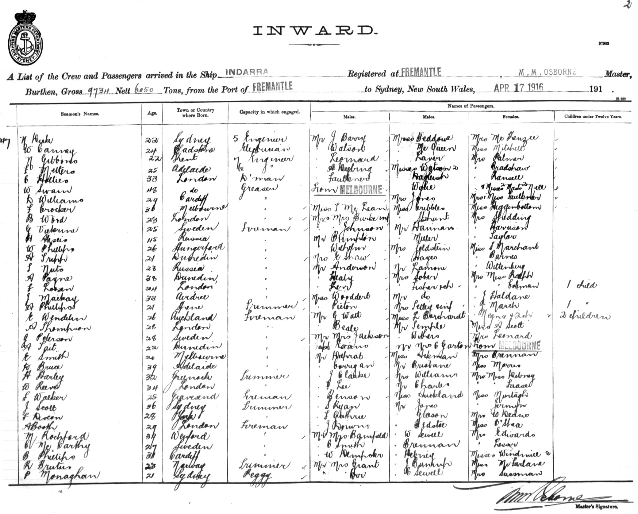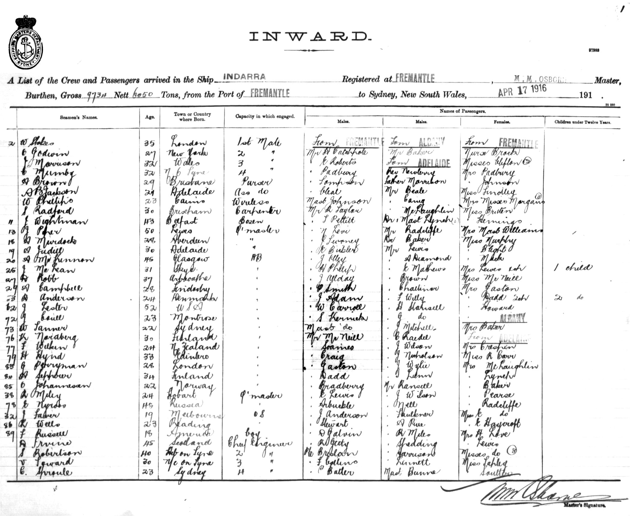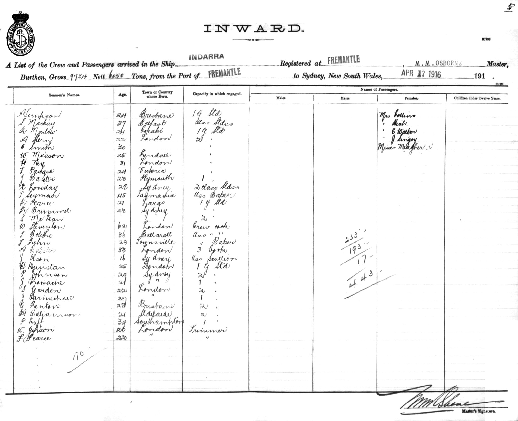 Mariners and ships in Australian Waters | INDARRAOF FREMANTLE, M. M. OSBORNE, MASTER, BURTHEN 9734/6050 TONS FROM THE PORT OF FREMANTLE TO SYDNEY, NEW SOUTH WALES, 17TH APRIL 1916 |