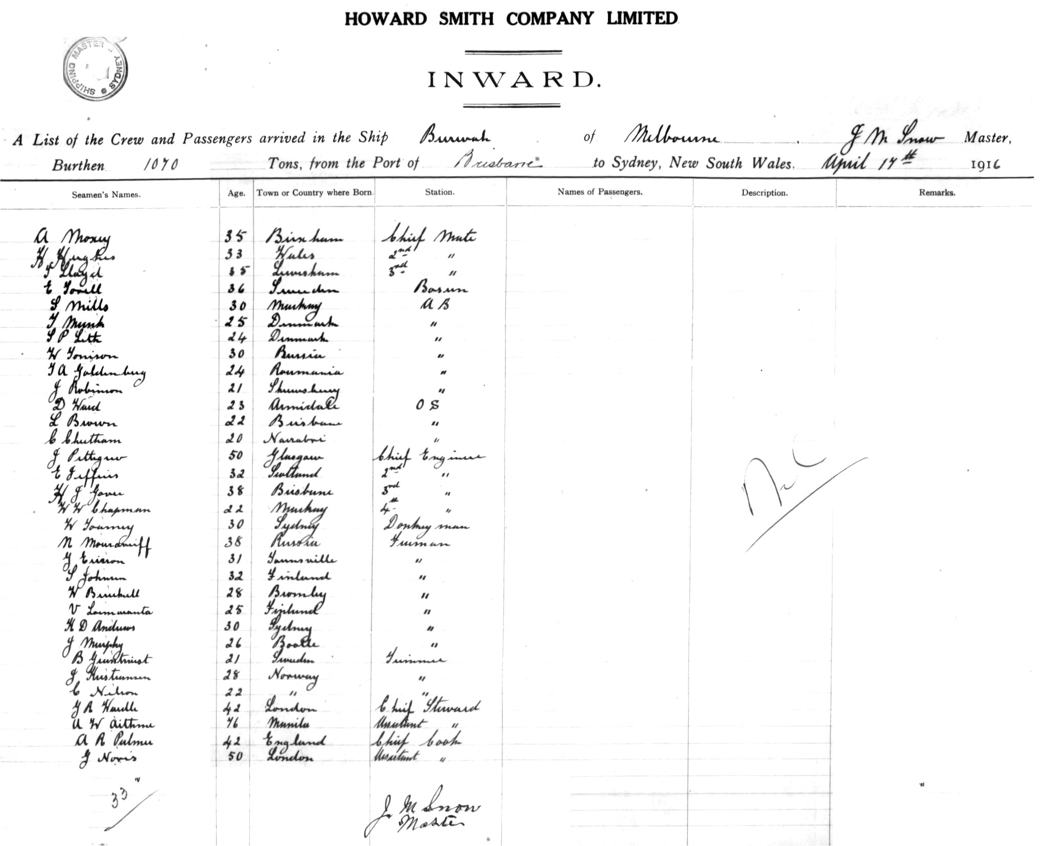 BURWAHOF MELBOURNE, J. M. SNOW, MASTER, BURTHEN 1070 TONS FROM THE PORT OF BRISBANE TO SYDNEY, NEW SOUTH WALES, 17TH APRIL 1916 |