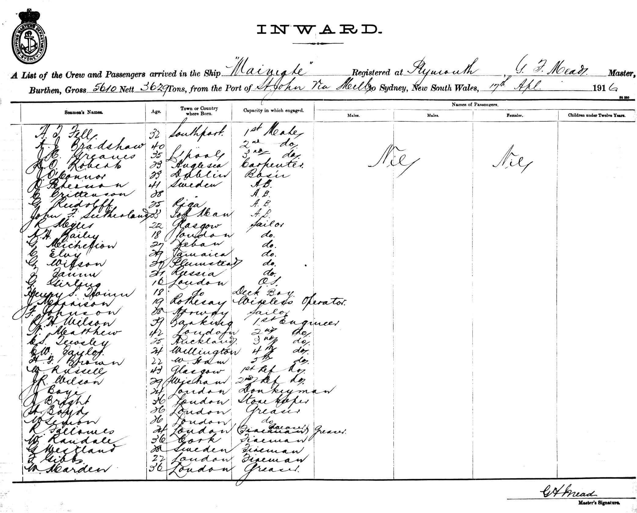 Source: State Records Authority of New South Wales: Shipping Master's Office; Passengers Arriving 1855 - 1922; NRS13278, [X410] reels 2091 & 2092. Transcribed by Margaret Shand. Proofread by Lyn & Maurie. You may view/print a scan of the original list - a monitor set to high resolution is recommended for clarity. Use your back button to return. |