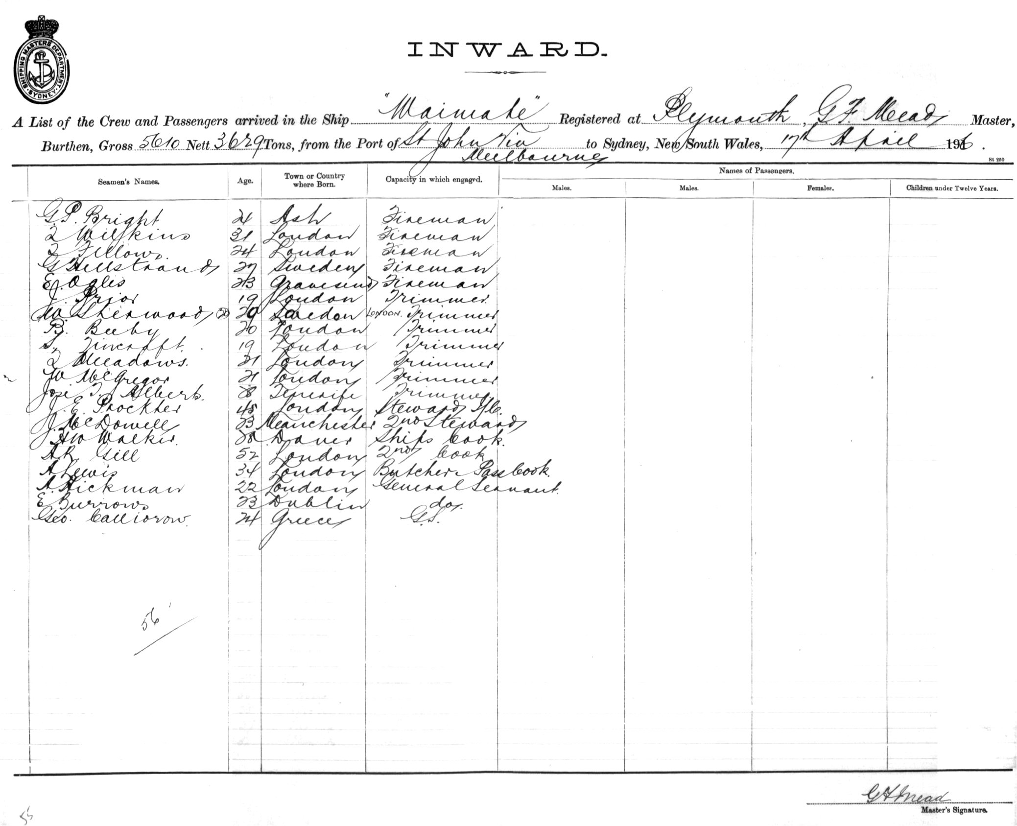 WAIMATEOF PLYMOUTH, G. F. MEAD, MASTER, BURTHEN 5610/3629 TONS FROM THE PORT OF ST JOHN VIA MELBOURNE TO SYDNEY, NEW SOUTH WALES, 17TH APRIL 1916 |