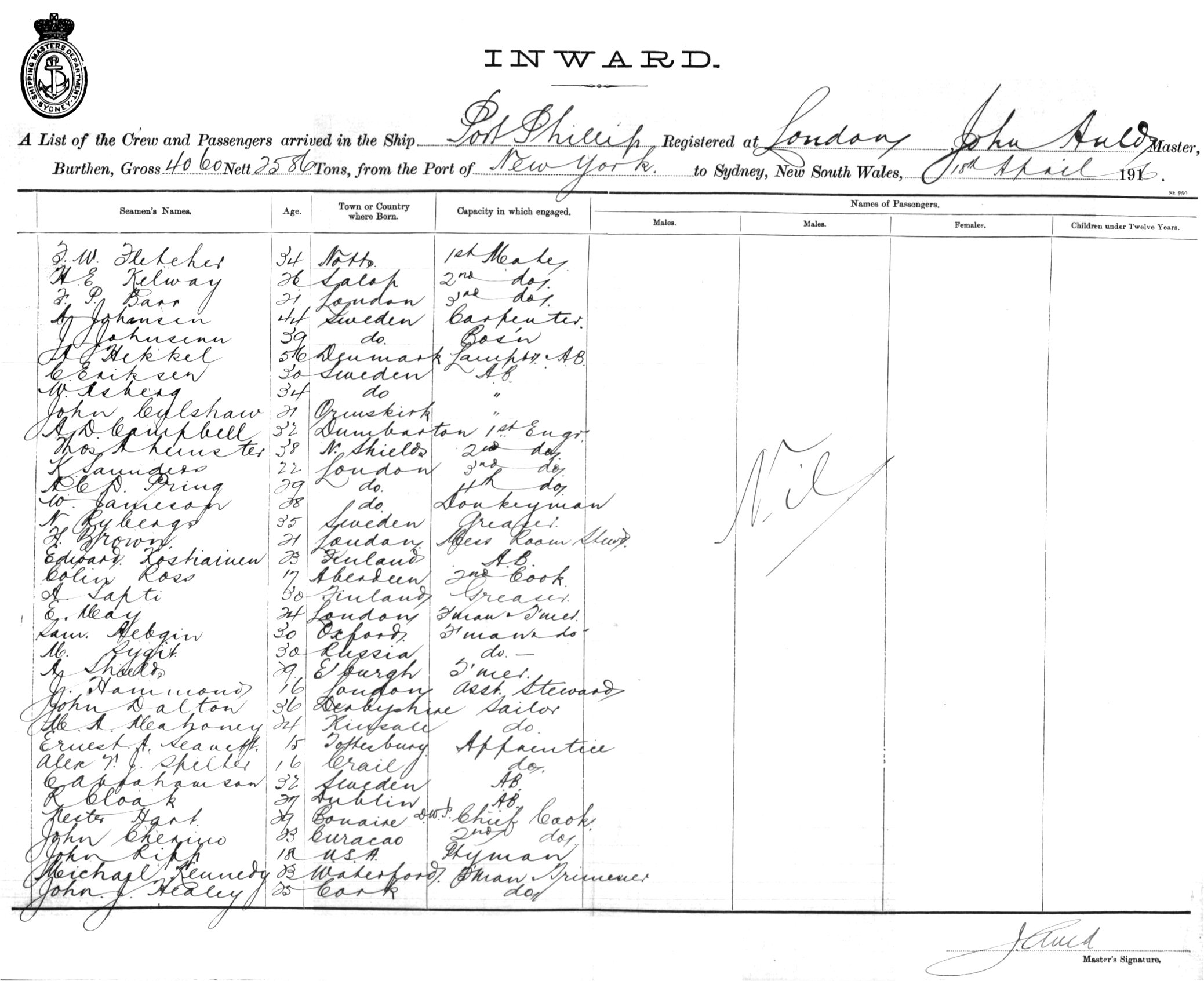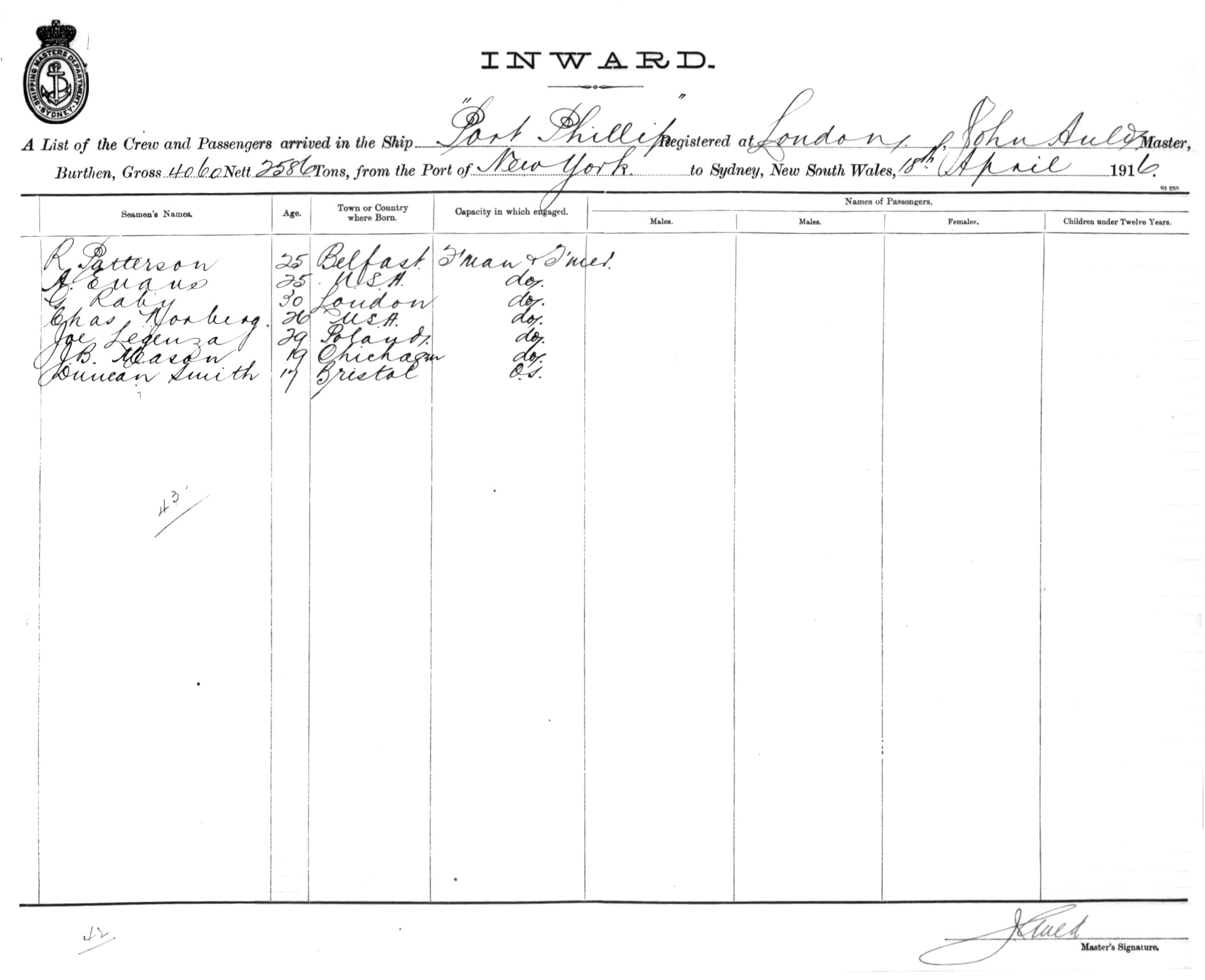PORT PHILLIPOF LONDON, JOHN AULD, MASTER, BURTHEN 4060/2586 TONS FROM THE PORT OF NEW YORK TO SYDNEY, NEW SOUTH WALES, 18TH APRIL 1916 |