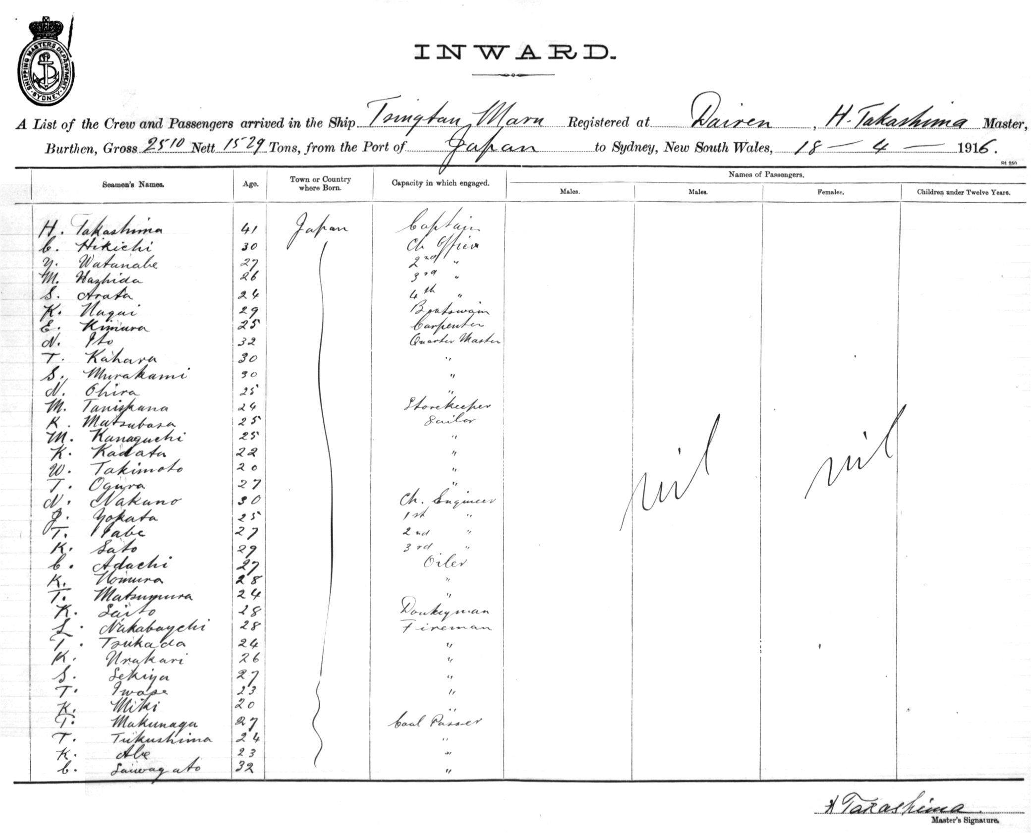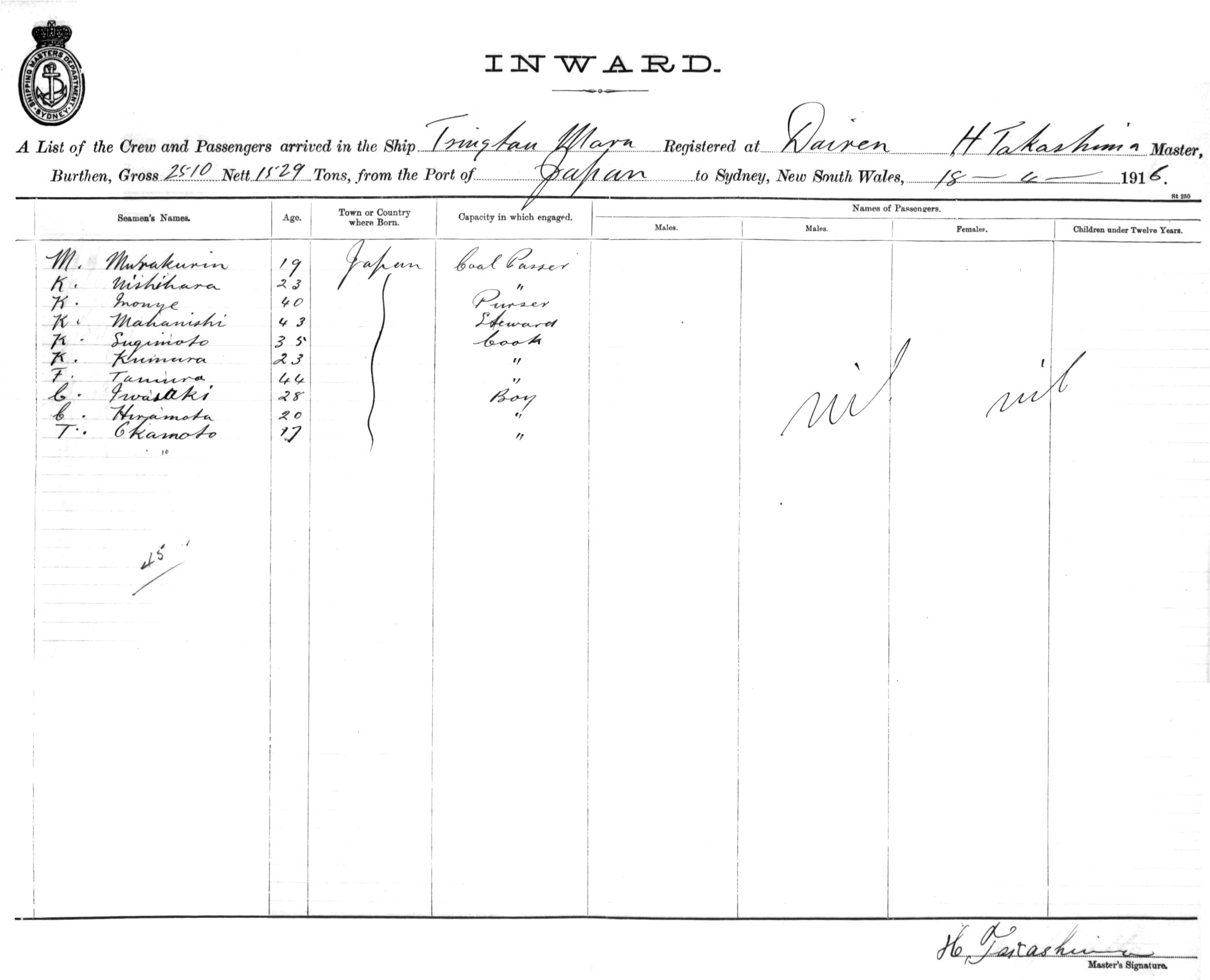 TSINGTAU MARUOF DAIREN, H. TAKASHIMA, MASTER, BURTHEN 2510/1529 TONS FROM THE PORT OF JAPAN TO SYDNEY, NEW SOUTH WALES, 18TH APRIL 1916 |