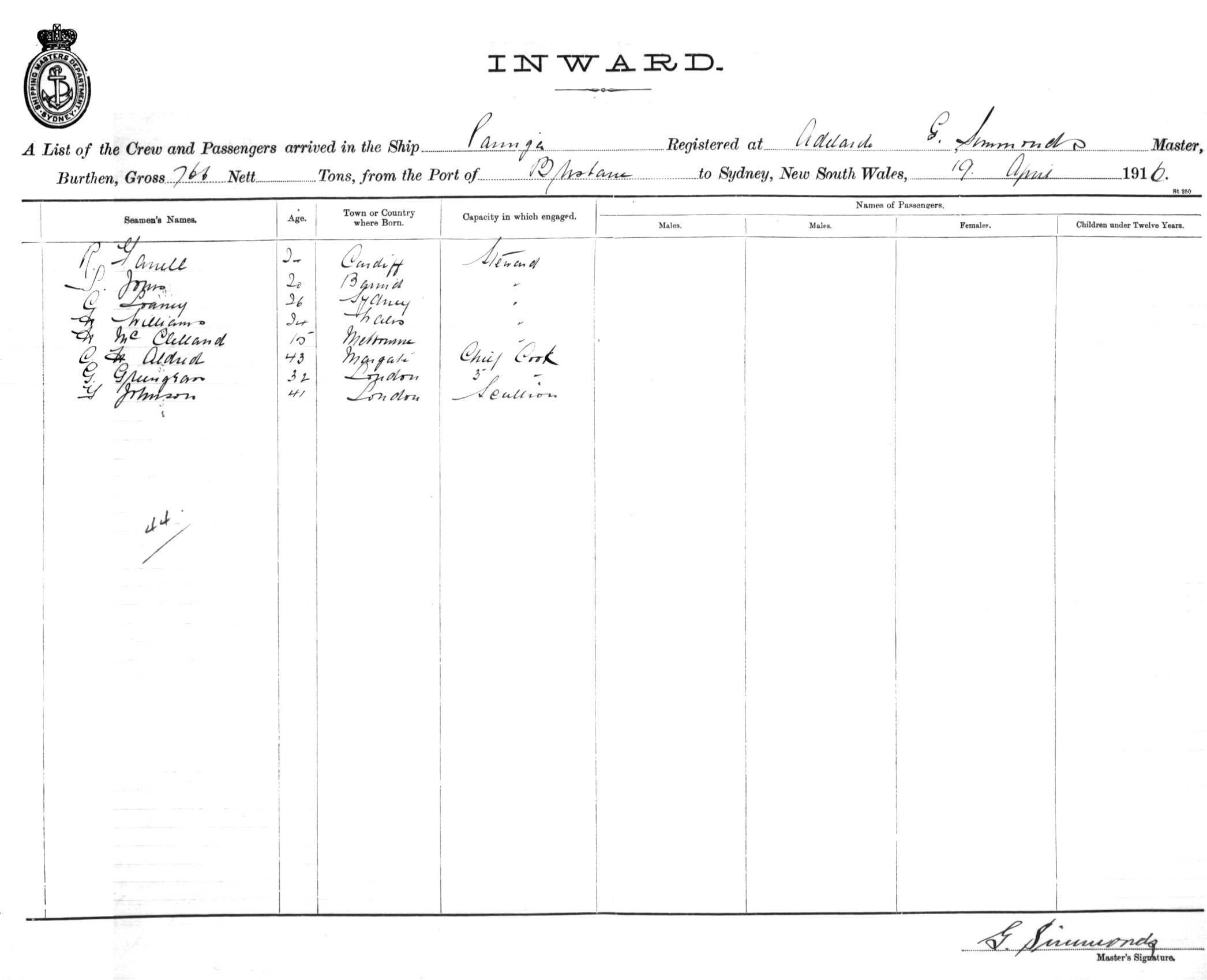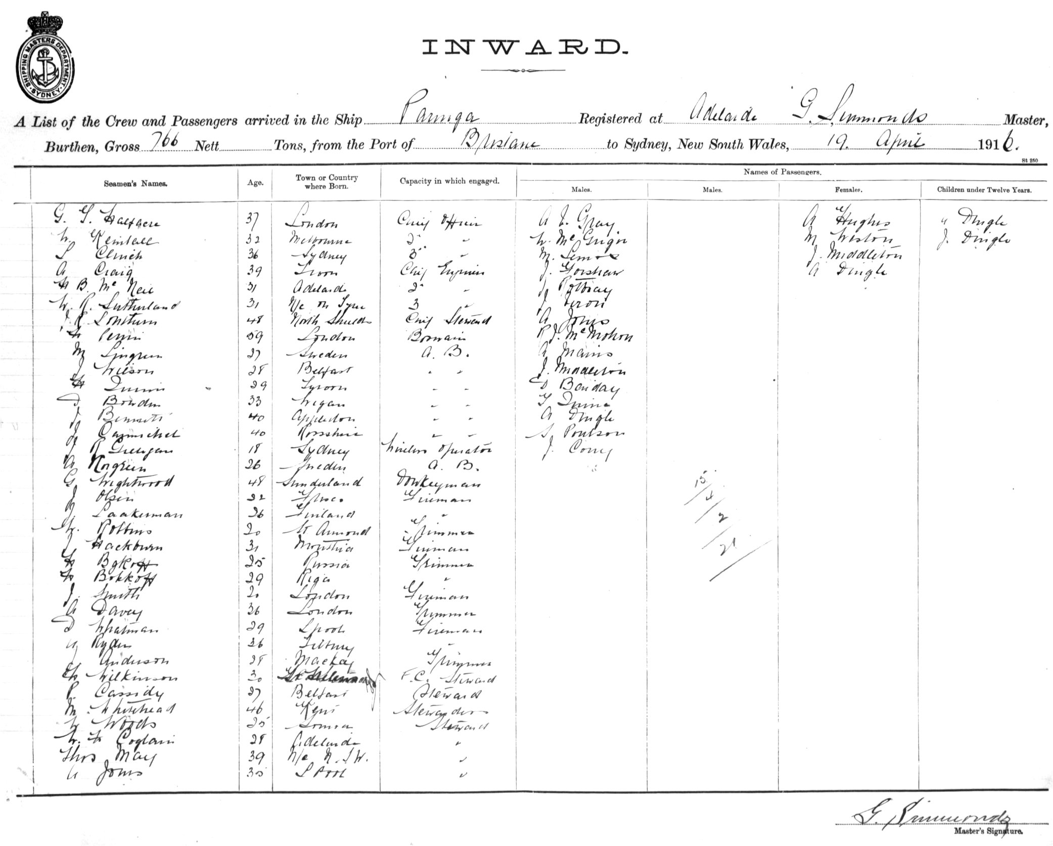 PARINGAOF ADELAIDE, G. SIMMONDS, MASTER, BURTHEN 766 TONS FROM THE PORT OF BRISBANE TO SYDNEY, NEW SOUTH WALES, 19TH APRIL 1916 |