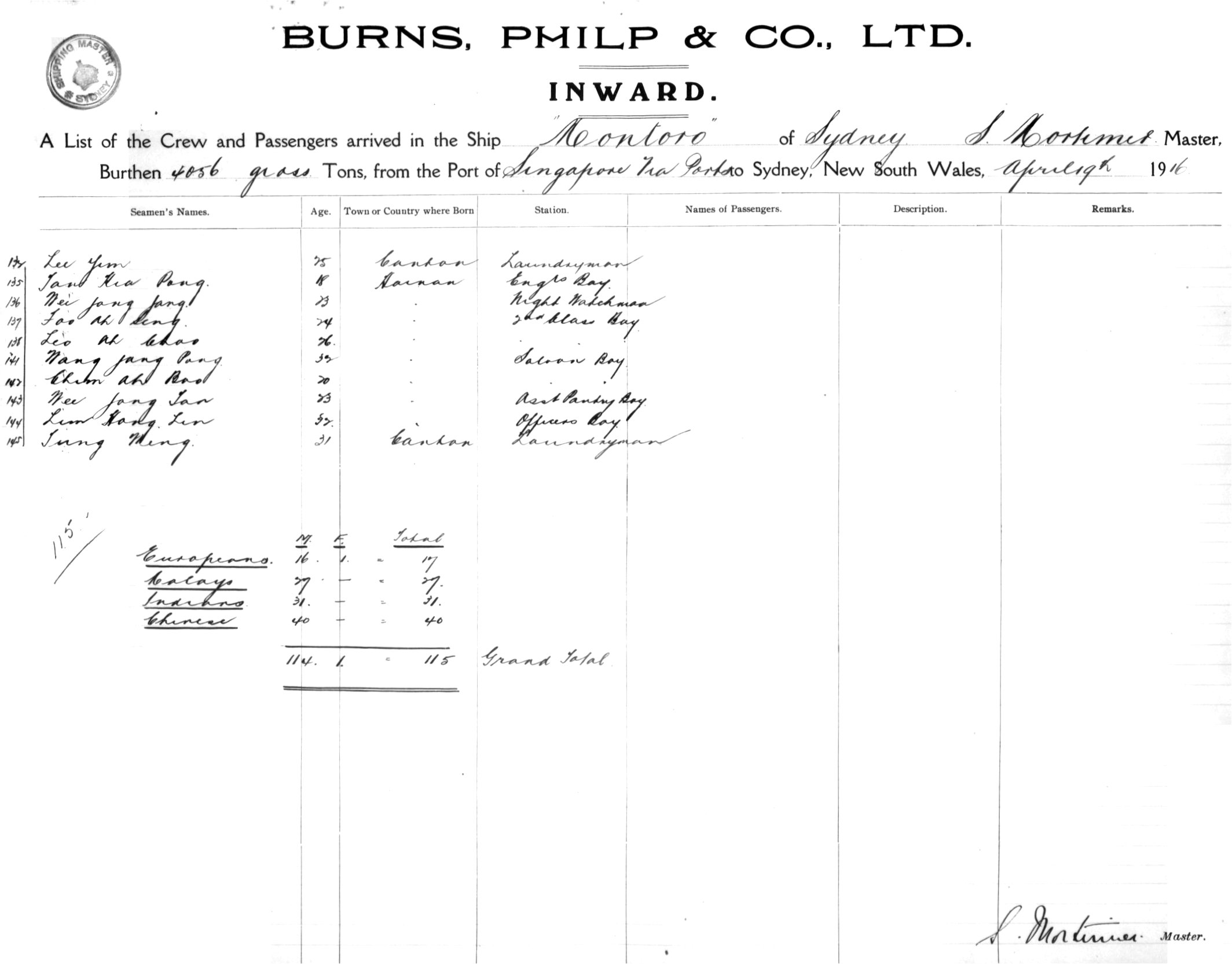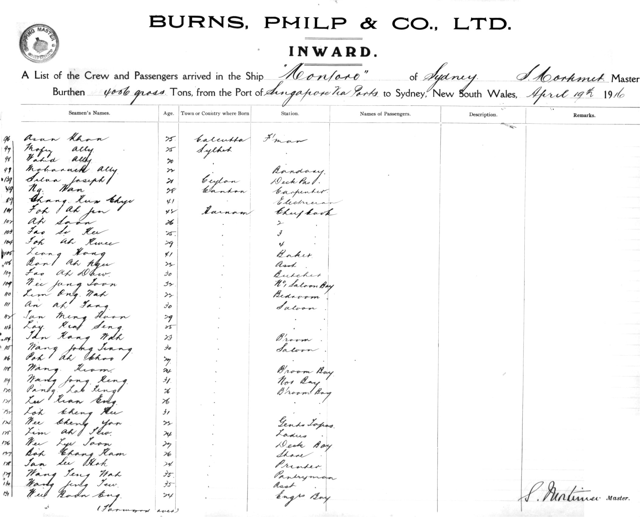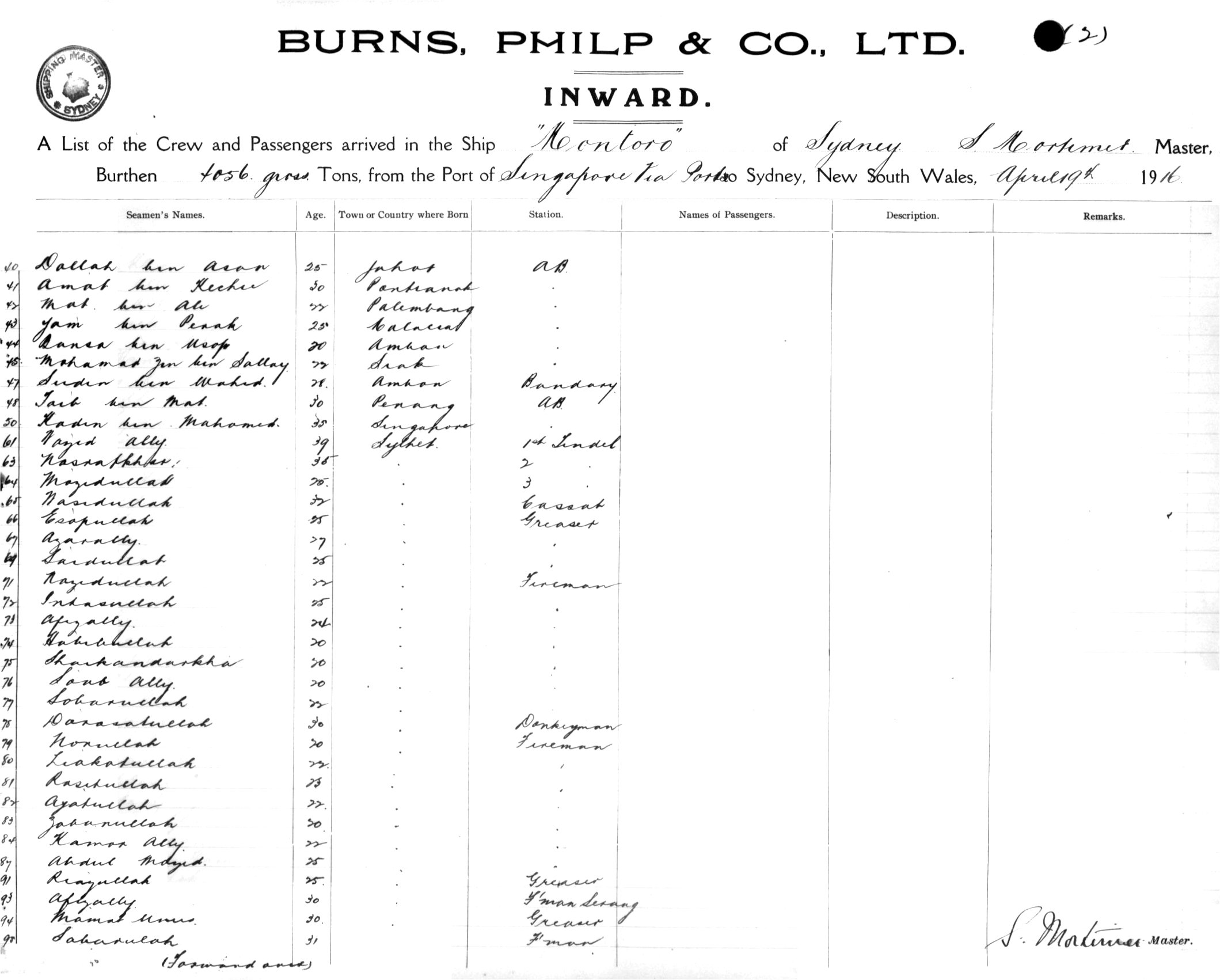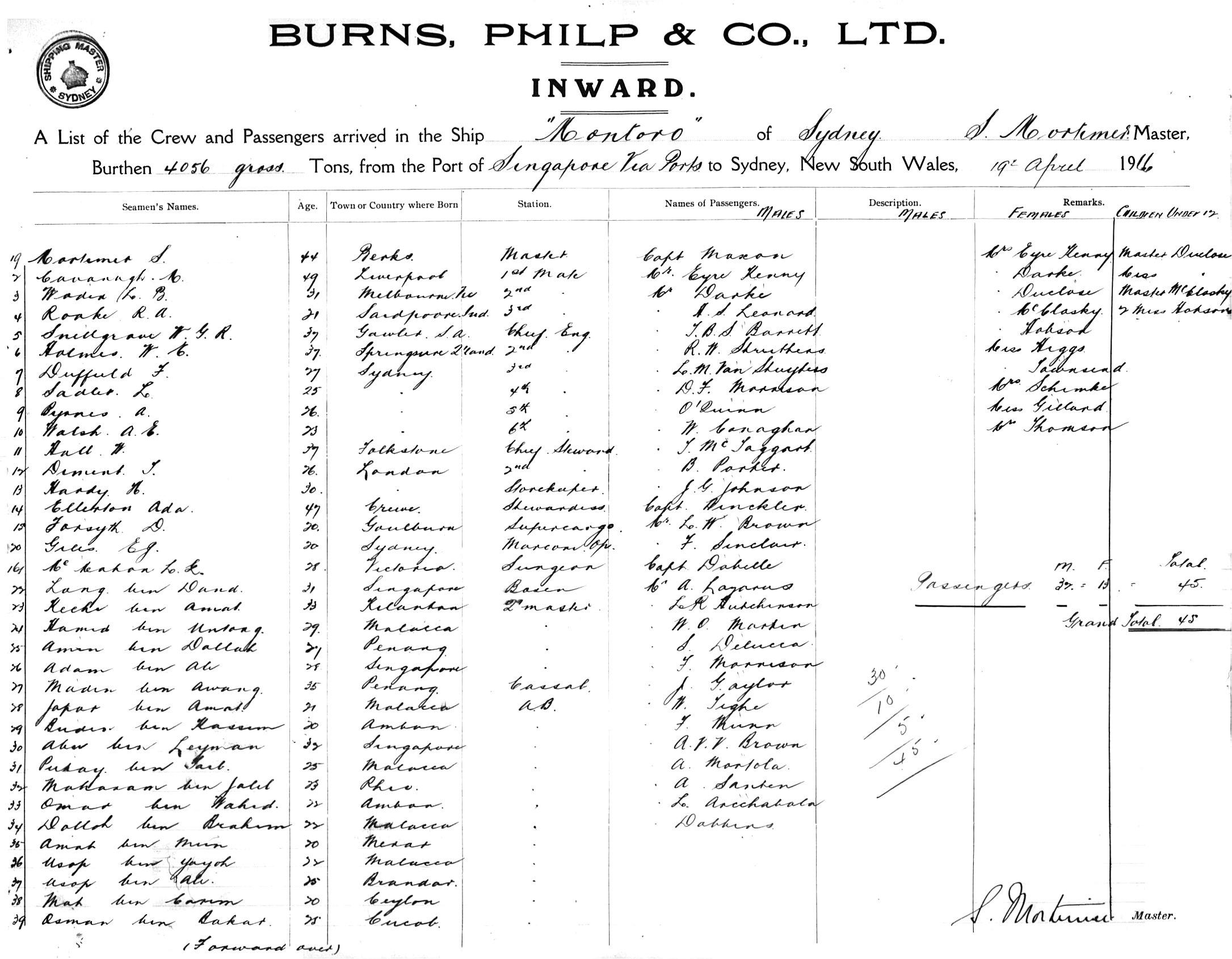 Mariners and ships in Australian Waters | MONTOROOF SYDNEY, S. MORTIMER, MASTER, BURTHEN 4056 TONS FROM THE PORT OF SINGAPORE via PORTS TO SYDNEY, NEW SOUTH WALES, 19TH APRIL 1916 |