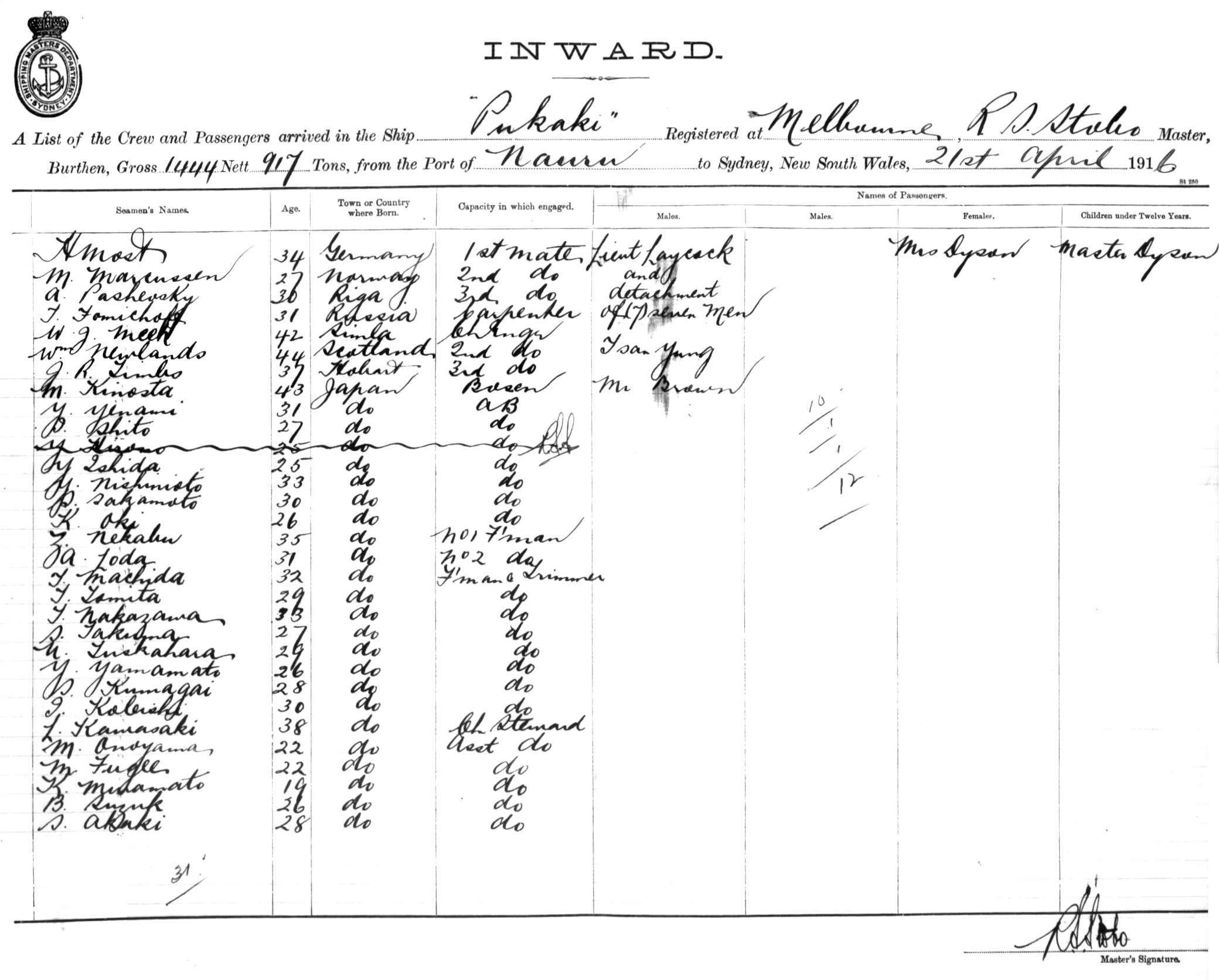 PUKAKIOF MELBOURNE, R. S. STOBO, MASTER, BURTHEN 1444/917 TONS FROM THE PORT OF NAURU TO SYDNEY, NEW SOUTH WALES, 21ST APRIL 1916 |