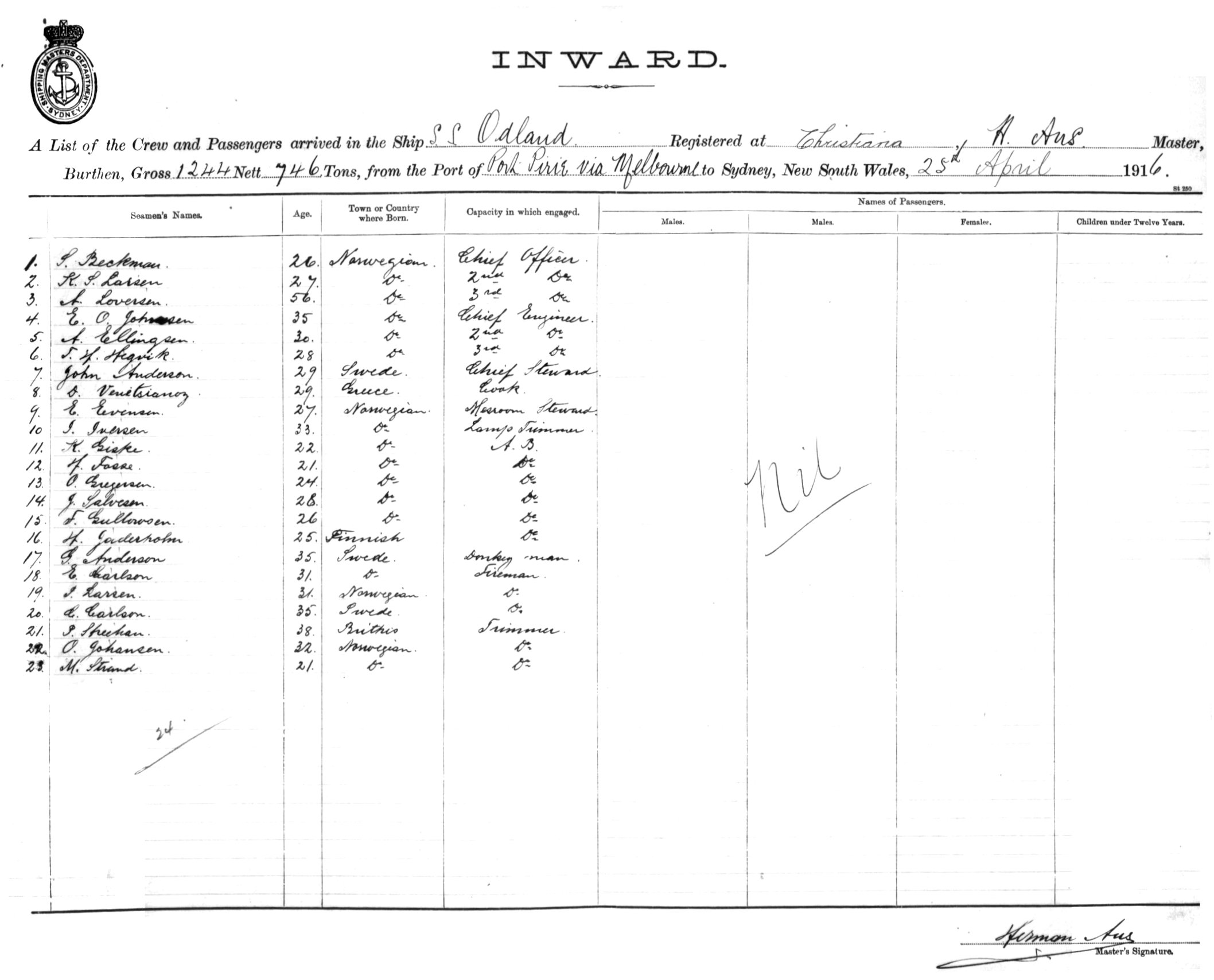 ODLANDOF KRISTIANIA, H. AUS, MASTER, BURTHEN 1244/746 TONS FROM THE PORT OF PORT PIRIE via MELBOURNE TO SYDNEY, NEW SOUTH WALES, 25TH APRIL 1916 |