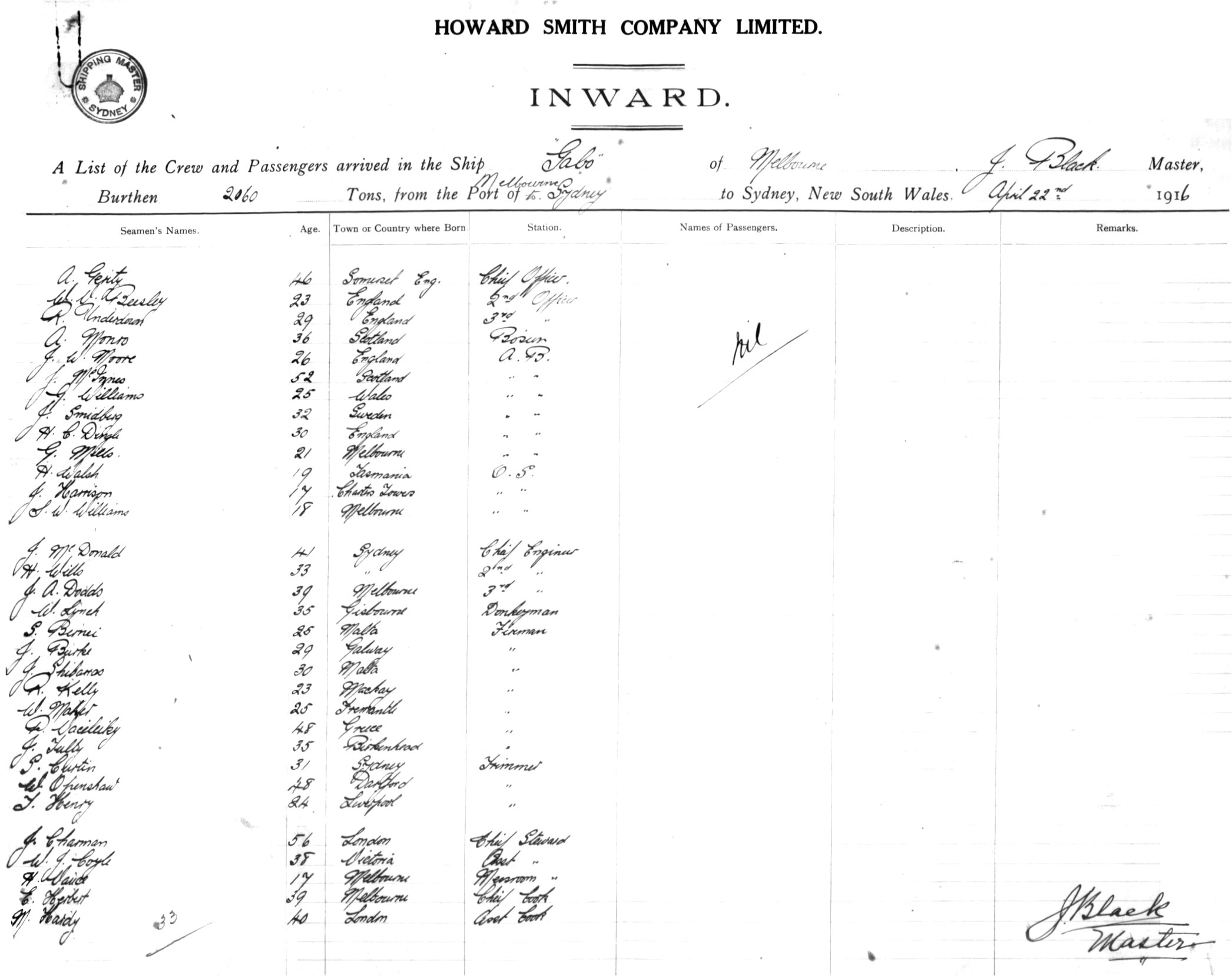 Mariners and ships in Australian Waters | GABOOF MELBOURNE, J. BLACK, MASTER, BURTHEN 2060 TONS FROM THE PORT OF MELBOURNE TO SYDNEY, NEW SOUTH WALES, 22ND APRIL 1916 |