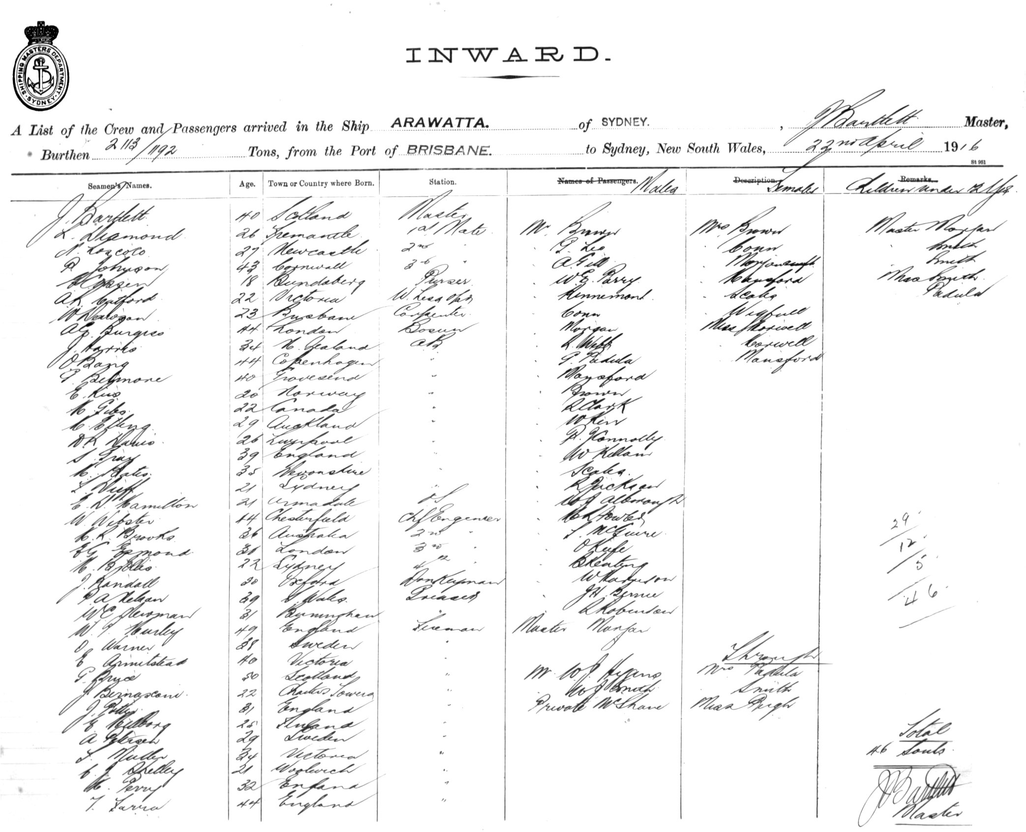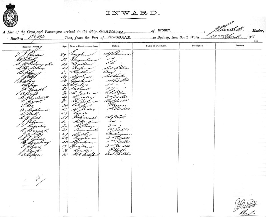 ARAWATTAOF SYDNEY, J. BARTLETT, MASTER, BURTHEN 2113/1192 TONS FROM THE PORT OF BRISBANE TO SYDNEY, NEW SOUTH WALES, 22ND APRIL 1916 |