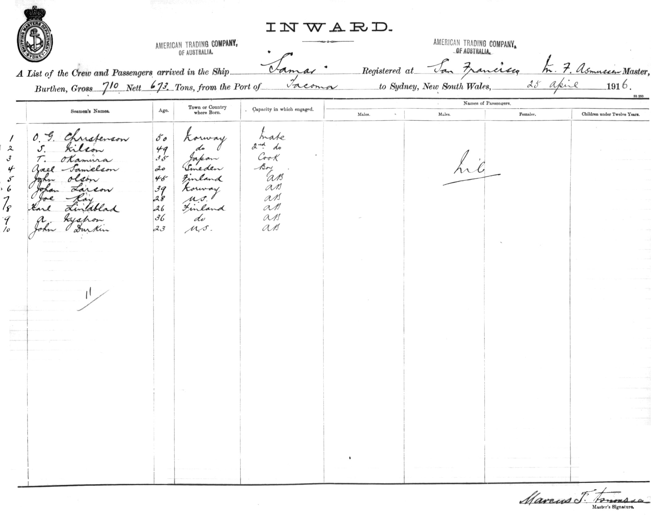 SAMAROF SAN FRANCISCO, M. F. ASMUSSEN, MASTER, BURTHEN 710/673 TONS FROM THE PORT OF TACOMA TO SYDNEY, NEW SOUTH WALES, 25TH APRIL 1916 |