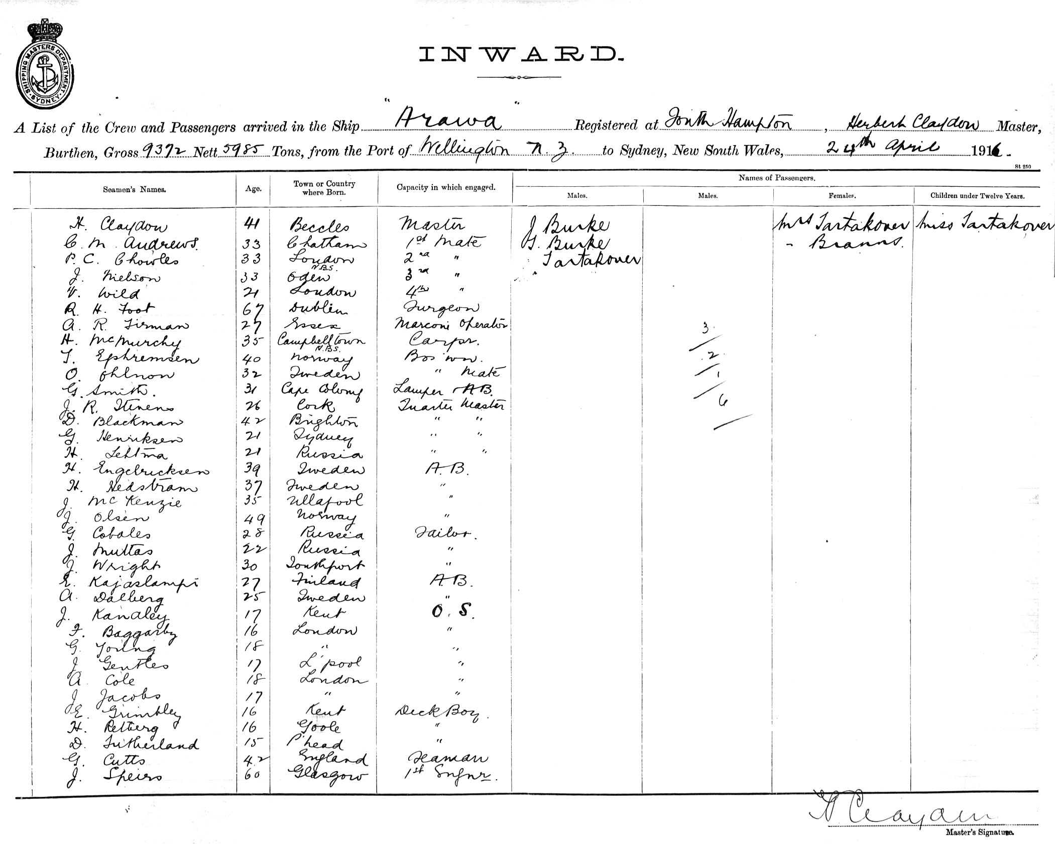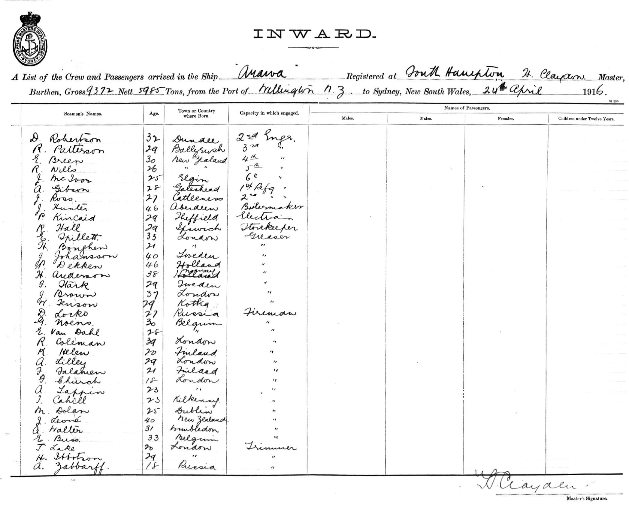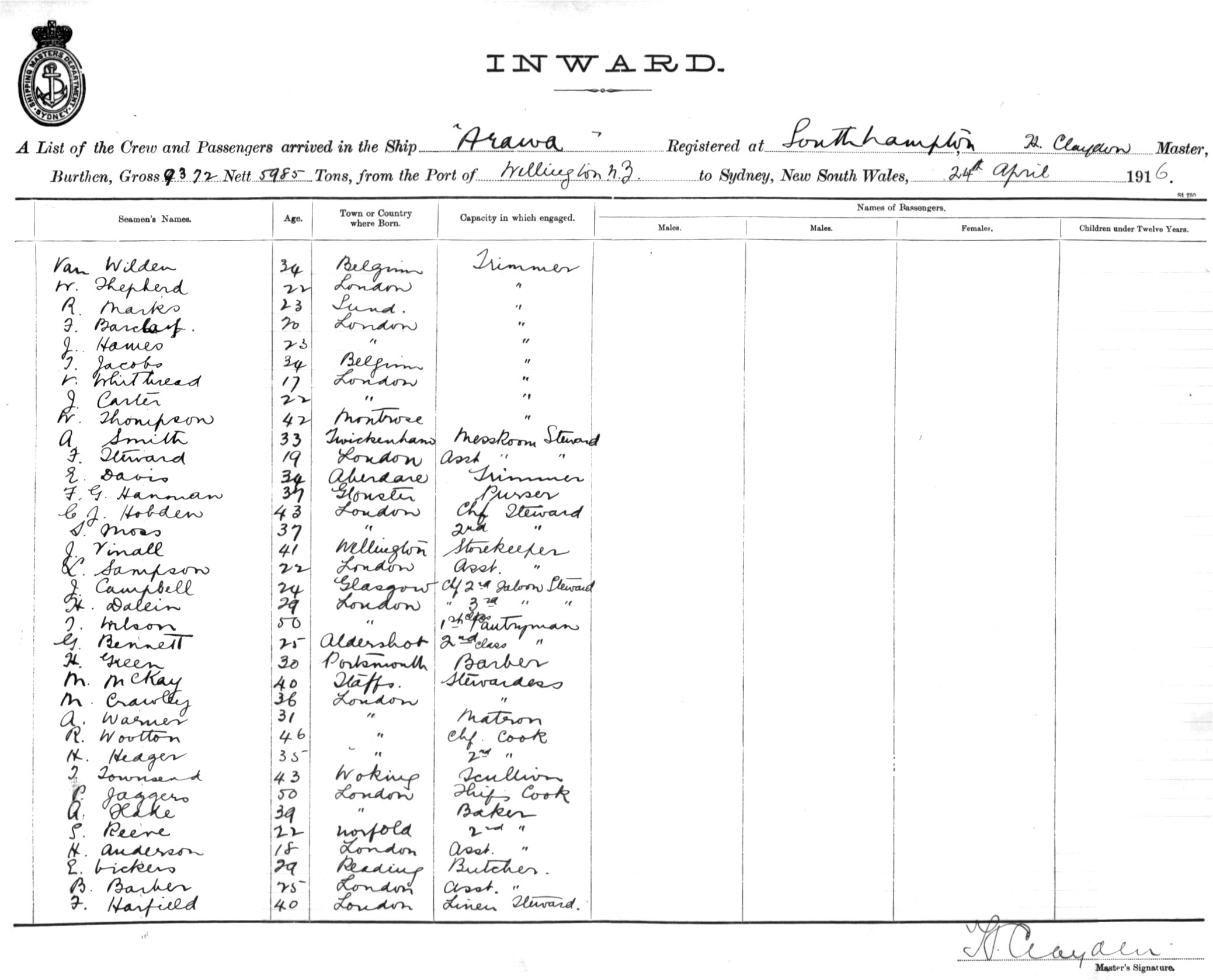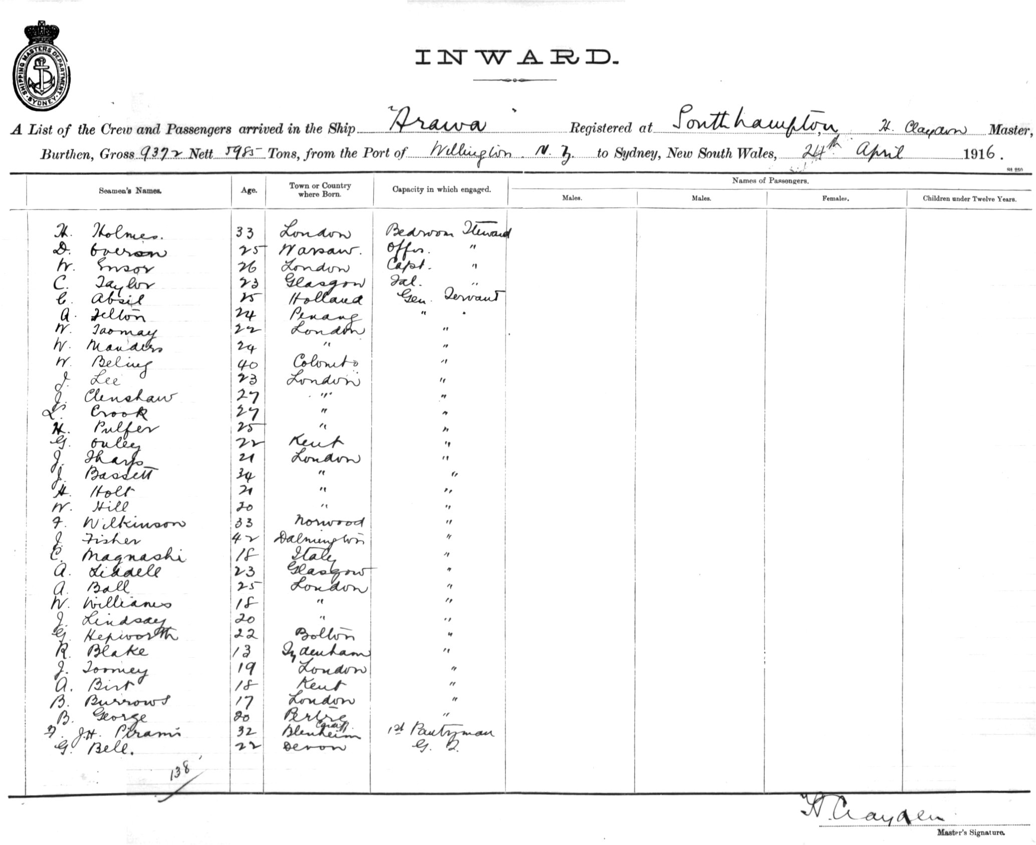 ARAWAOF SOUTHAMPTON, HERBERT CLAYDEN, MASTER, BURTHEN 9372/5985 TONS FROM THE PORT OF WELLINGTON TO SYDNEY, NEW SOUTH WALES, 24TH APRIL 1916 |