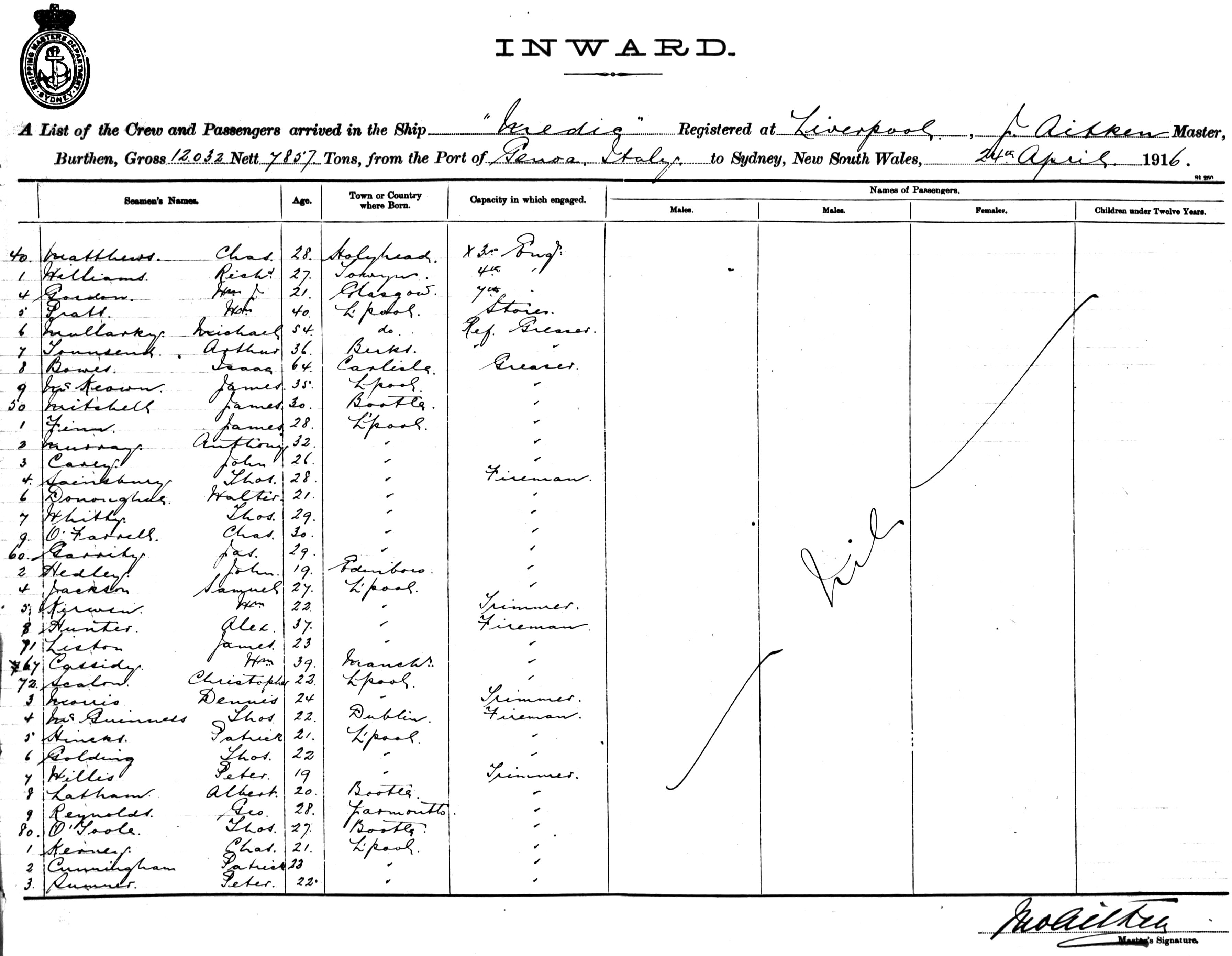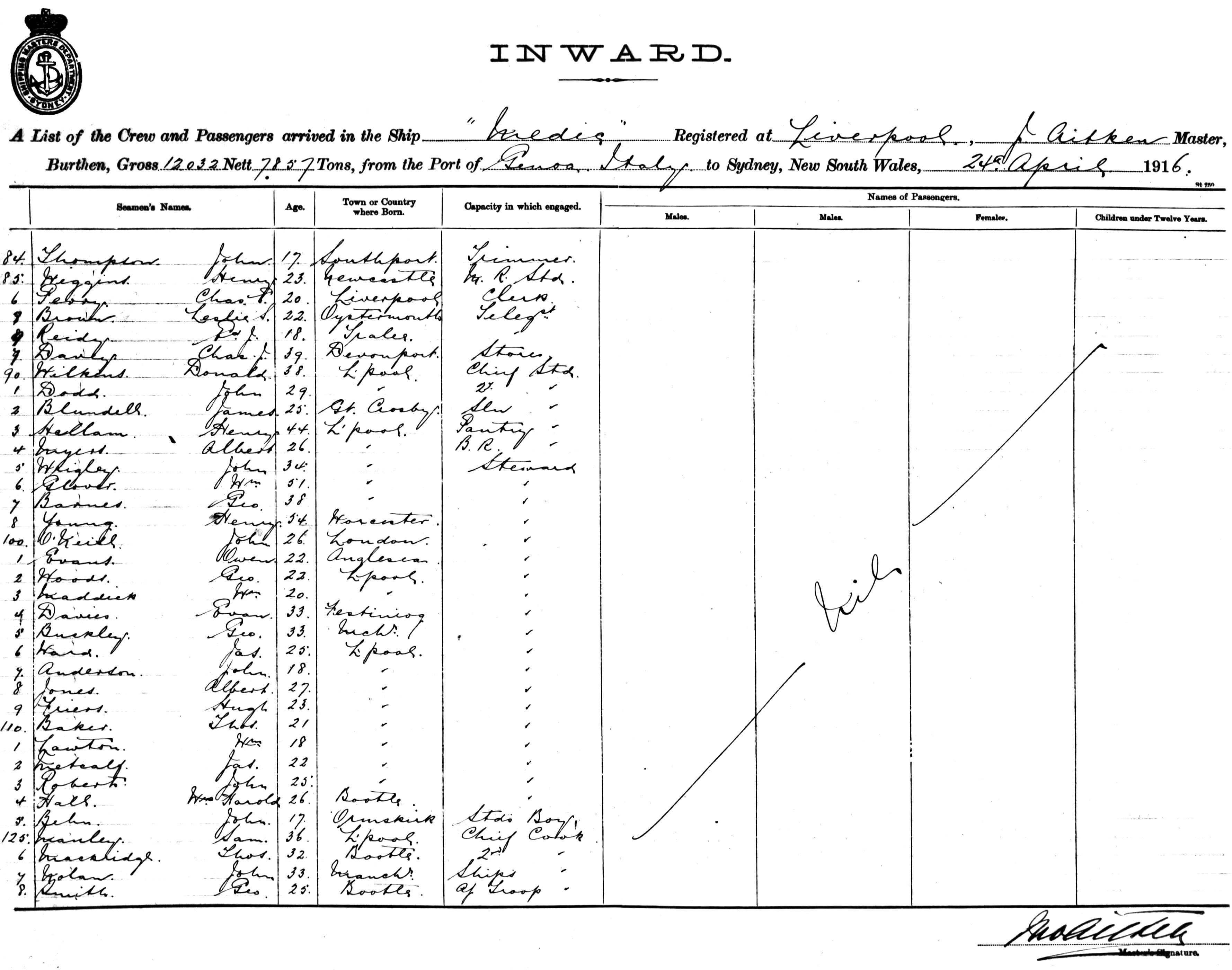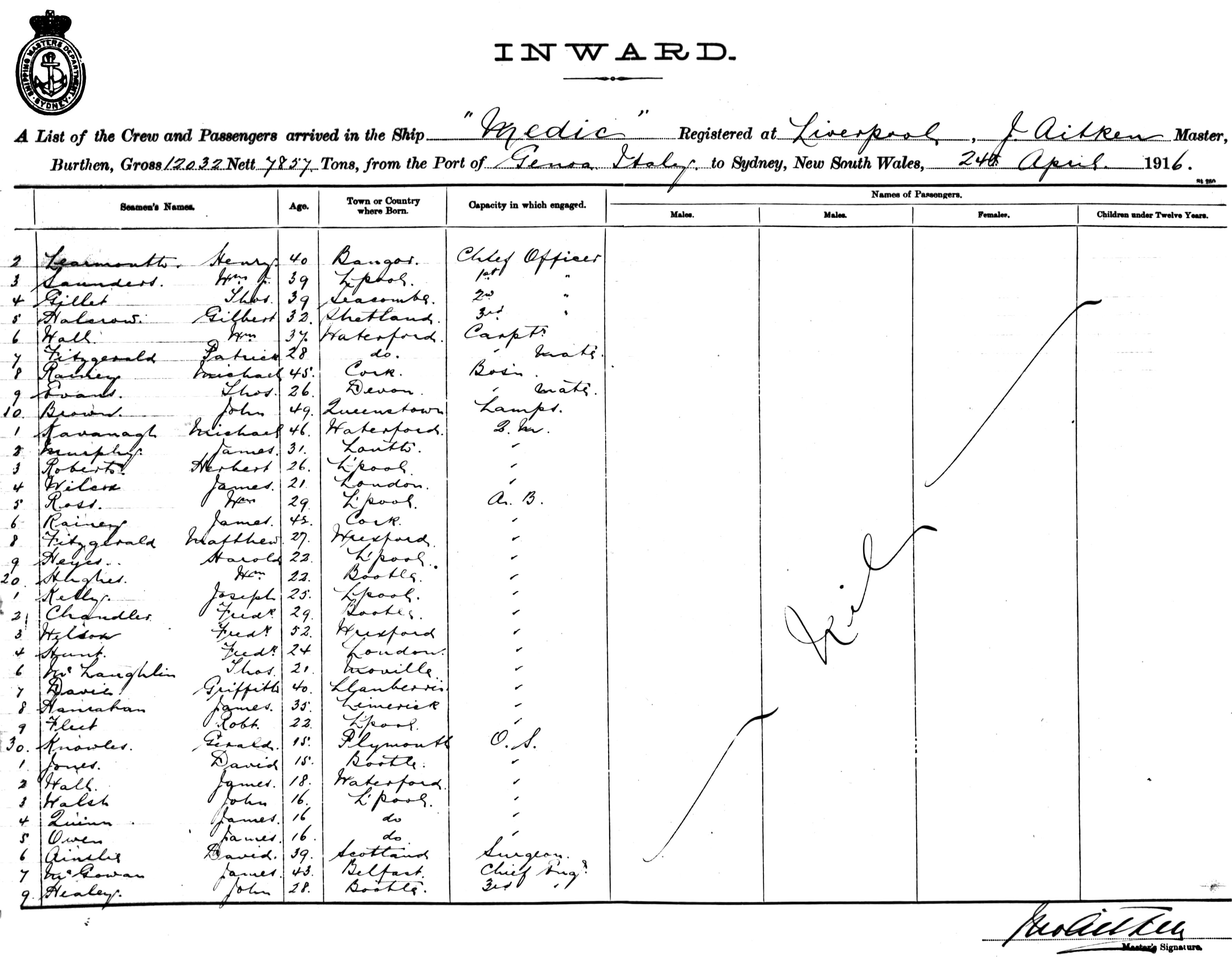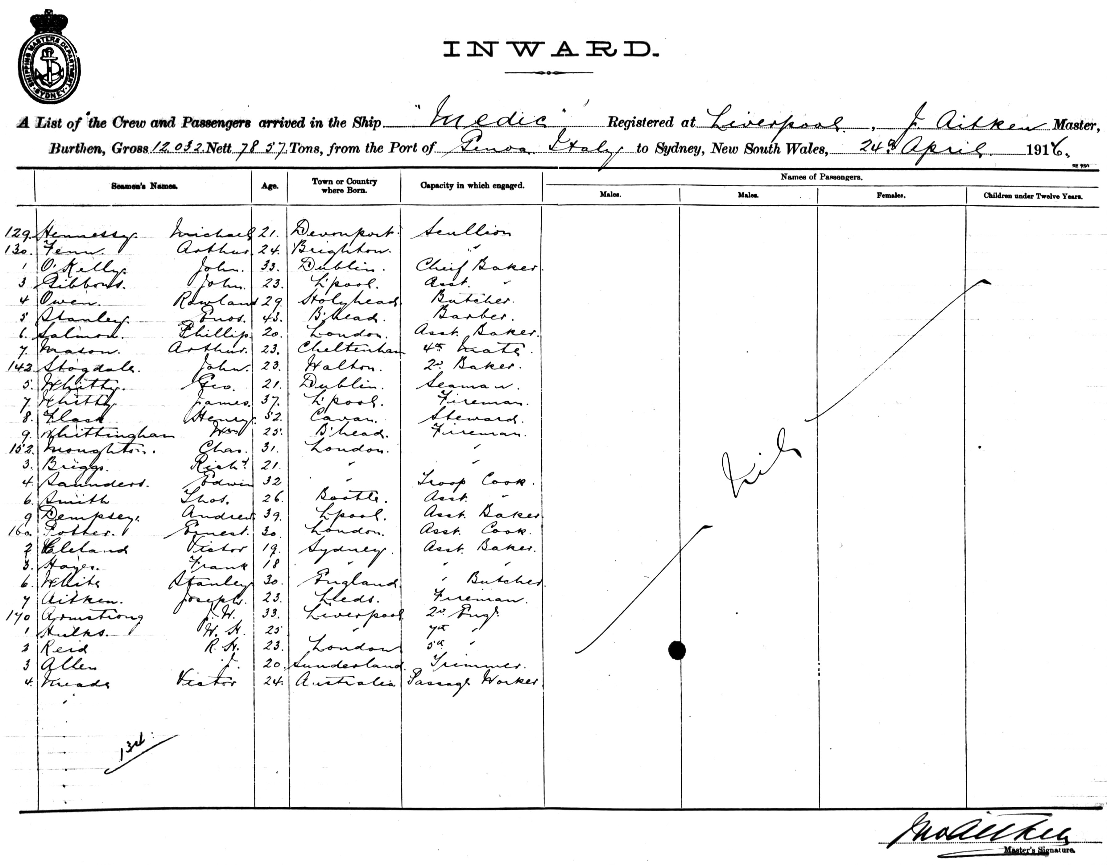 MEDICOF LIVERPOOL, J. AITKEN, MASTER, BURTHEN 12,032/7857 TONS FROM THE PORT OF GENOA, ITALY TO SYDNEY, NEW SOUTH WALES, 24TH APRIL 1916 |