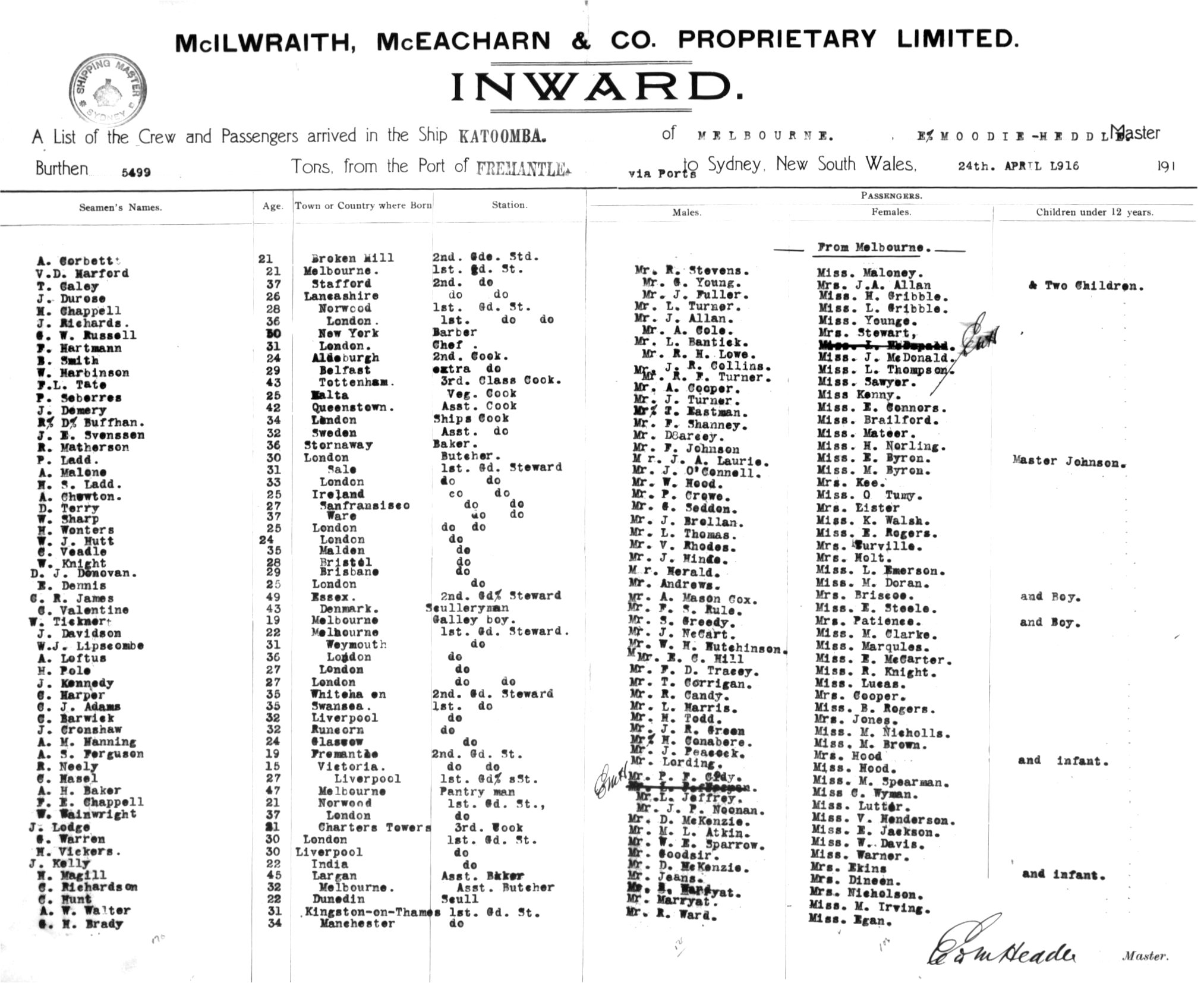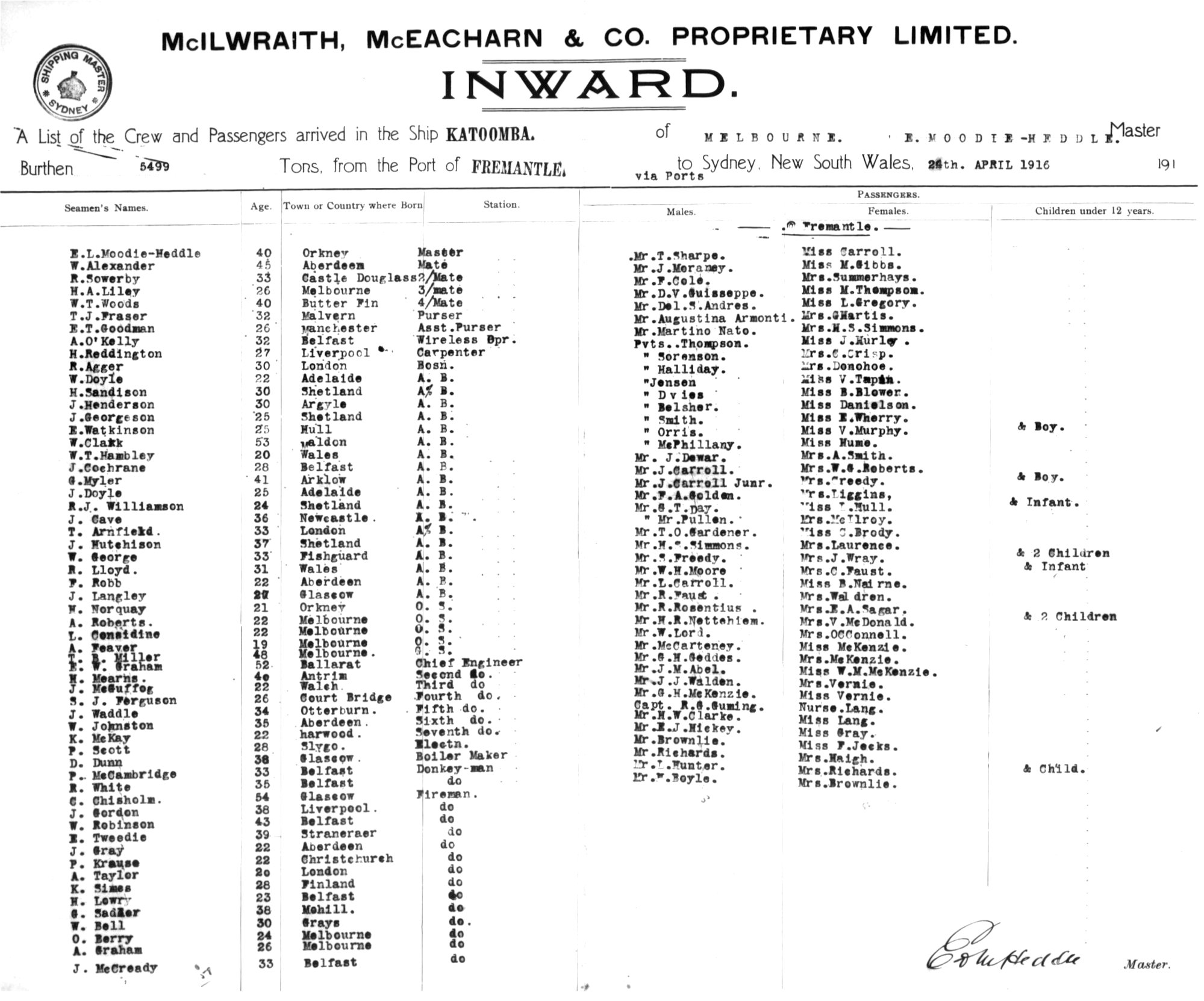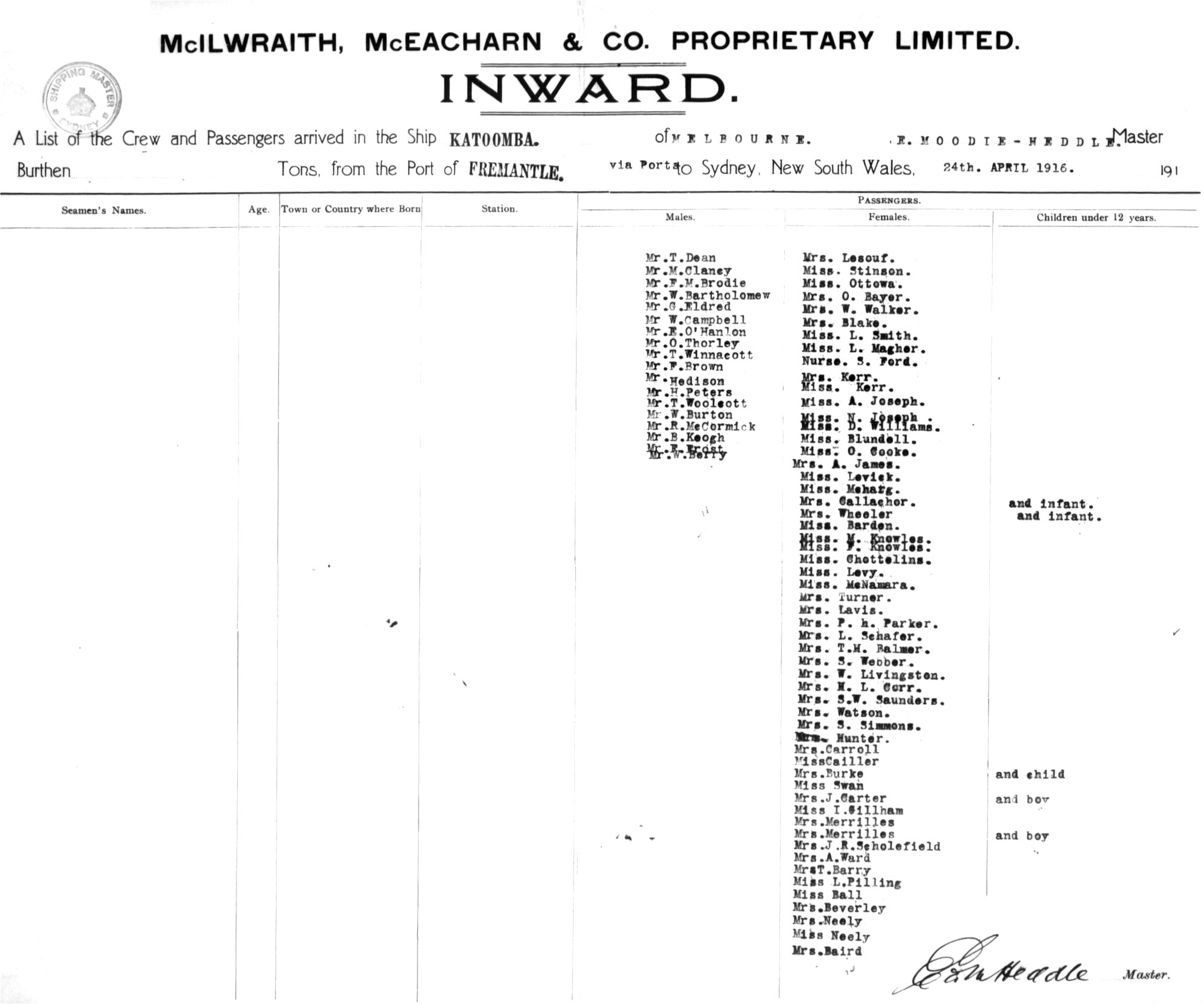 KATOOMBAOF MELBOURNE, E. L. MOODIE-HEDDLE, MASTER, BURTHEN 5499 TONS FROM THE PORT OF FREMANTLE VIA PORTS TO SYDNEY, NEW SOUTH WALES, 24TH APRIL 1916 |