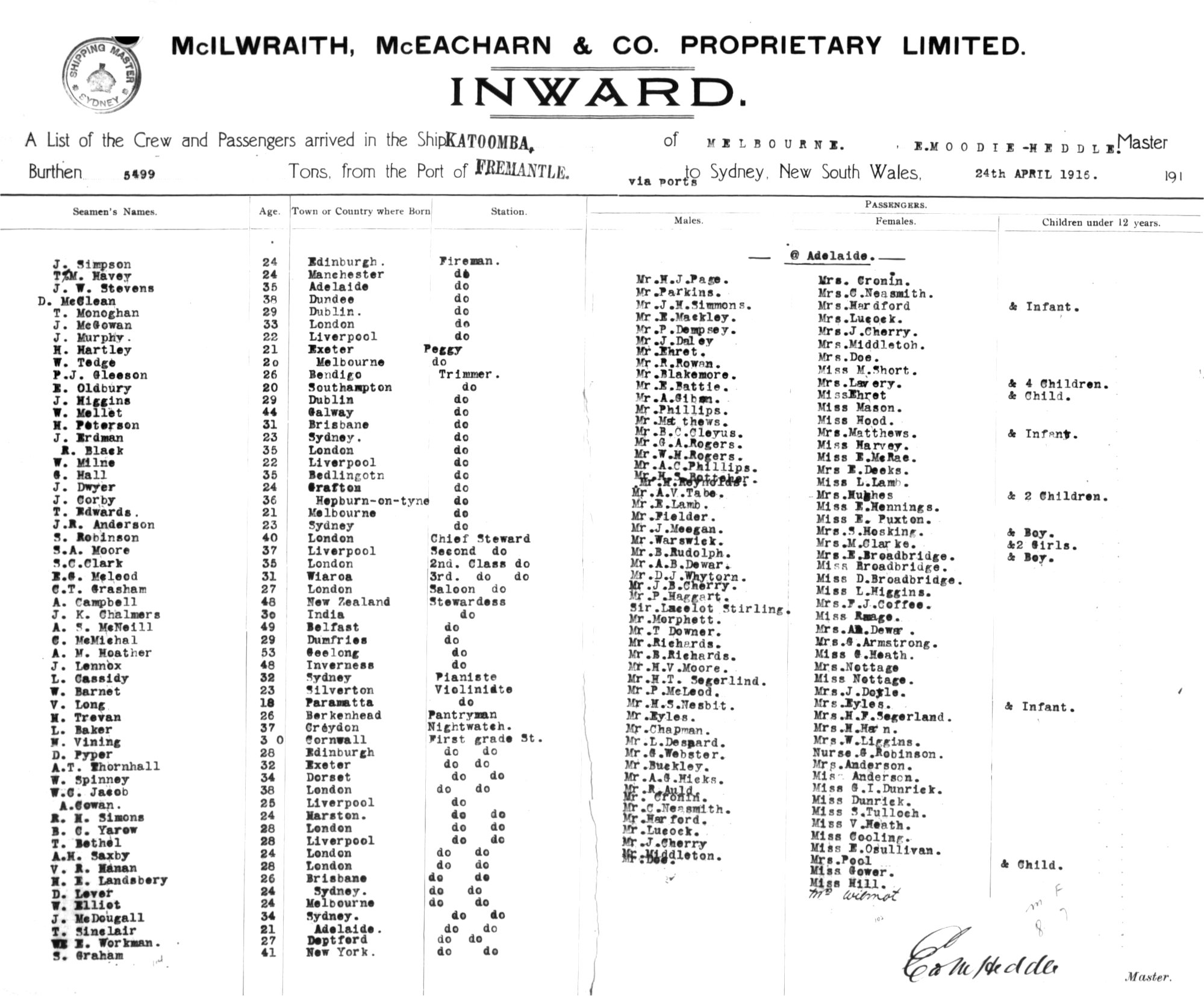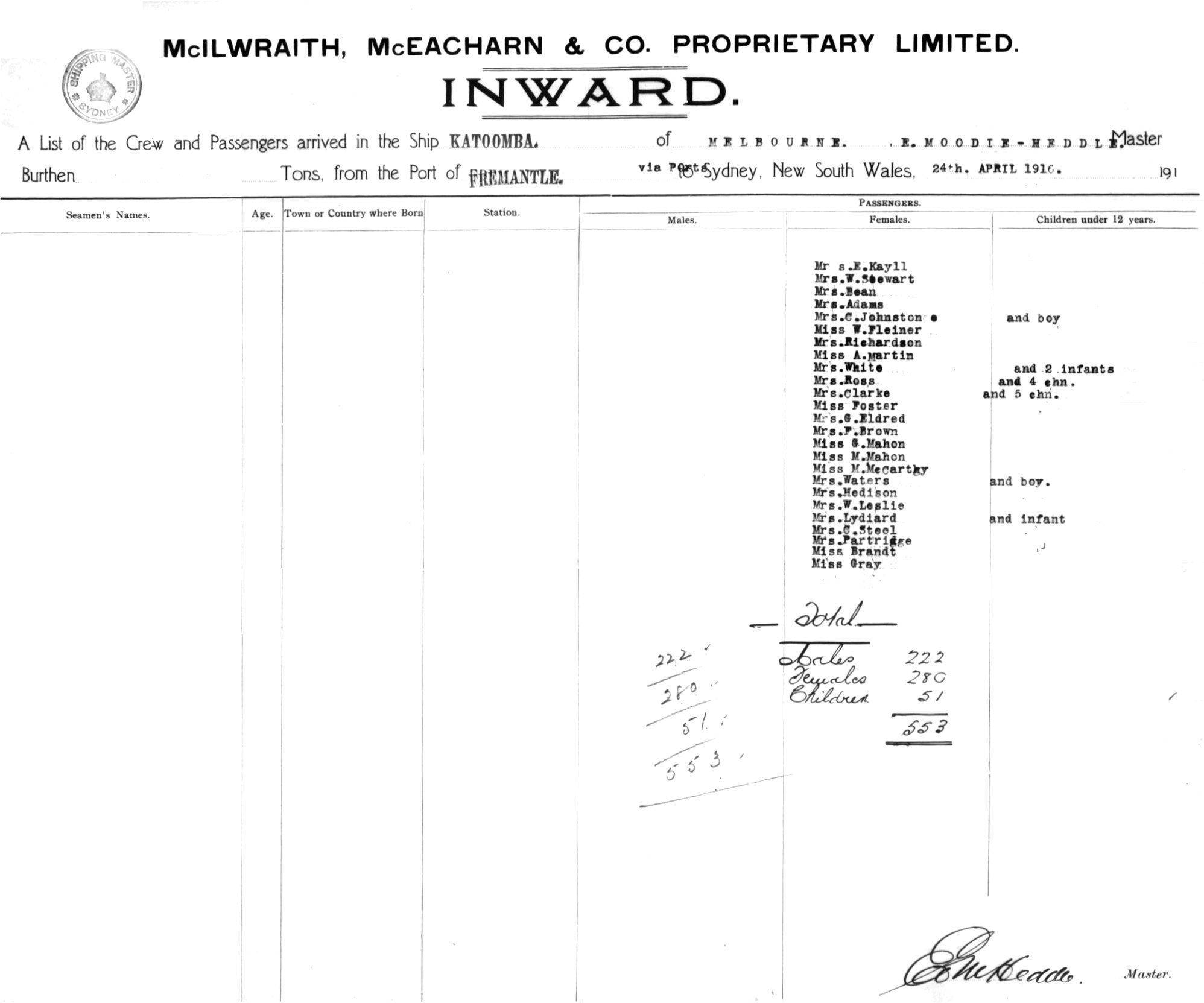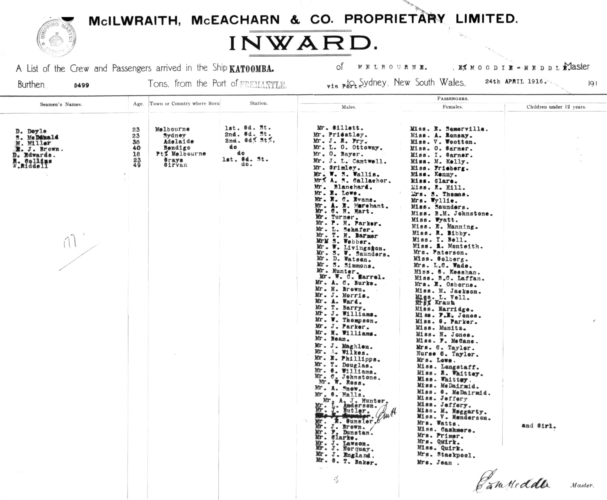 KATOOMBAOF MELBOURNE, E. L. MOODIE-HEDDLE, MASTER, BURTHEN 5499 TONS FROM THE PORT OF FREMANTLE VIA PORTS TO SYDNEY, NEW SOUTH WALES, 24TH APRIL 1916 |