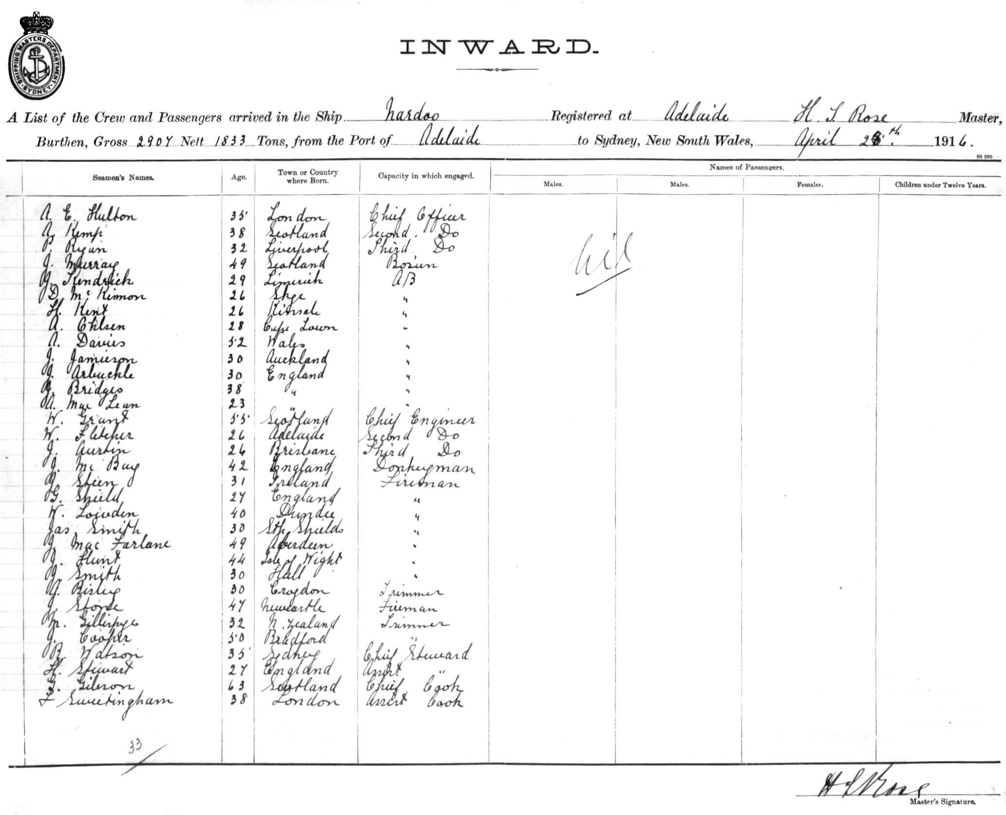 NARDOOOF ADELAIDE, H. T. ROSE, MASTER, BURTHEN 2907/1833 TONS FROM THE PORT OF ADELAIDE TO SYDNEY, NEW SOUTH WALES, 28TH APRIL 1916 |