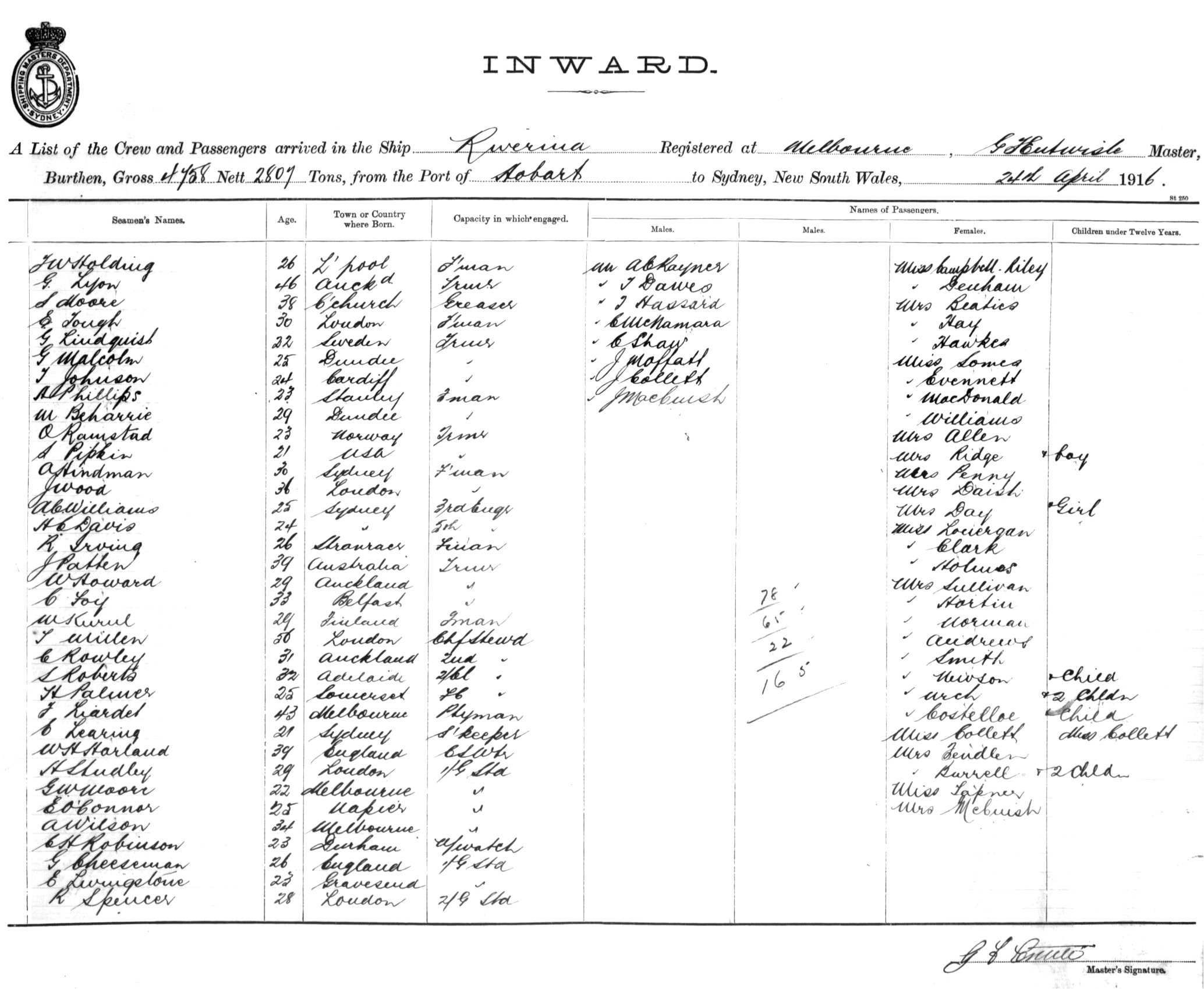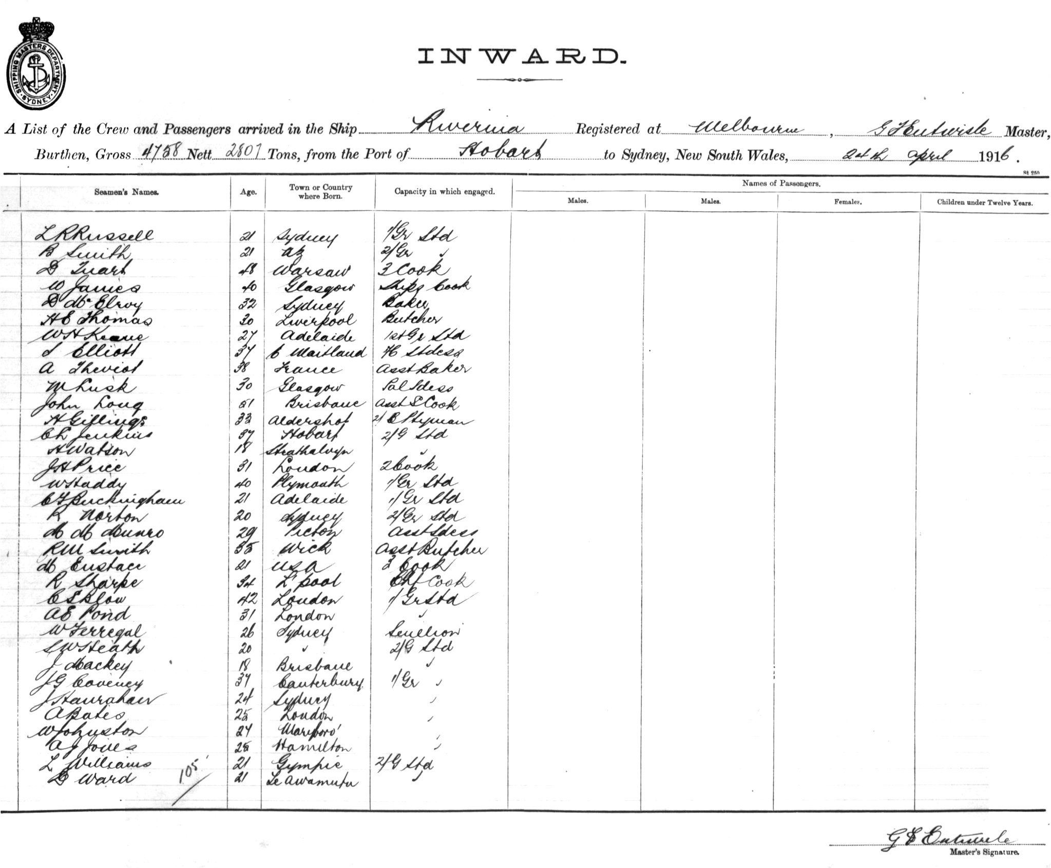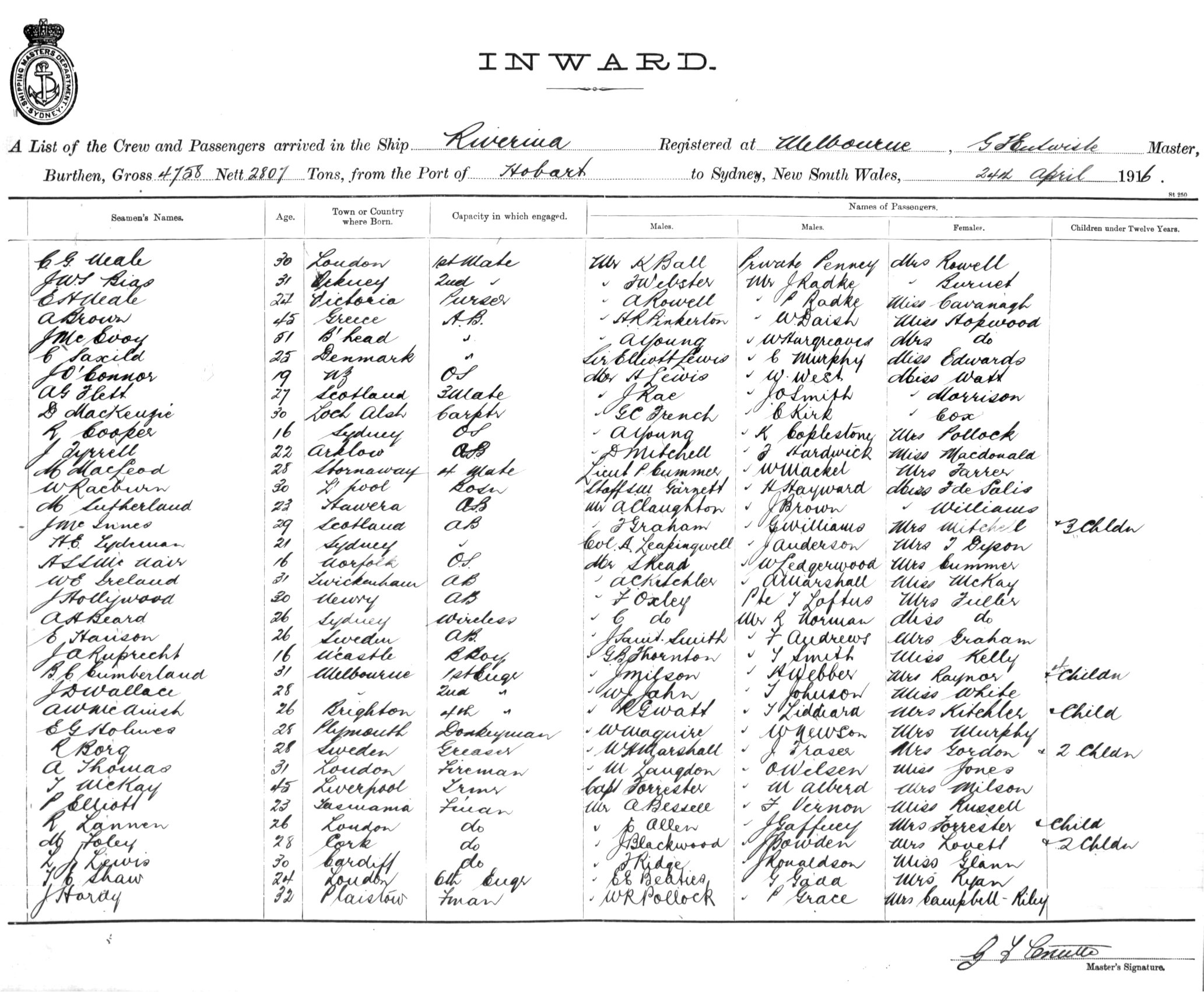 RIVERINAOF MELBOURNE, G. F. ENTWISLE, MASTER, BURTHEN 4758/2807 TONS FROM THE PORT OF HOBART TO SYDNEY, NEW SOUTH WALES, 24TH APRIL 1916 |