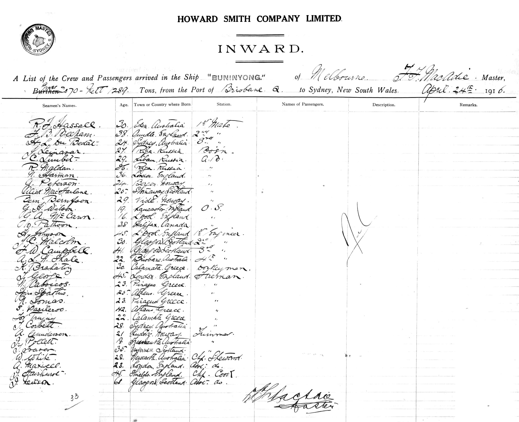 Mariners and ships in Australian Waters | BUNINYONGOF MELBOURNE, T. F. MACADIE, MASTER, BURTHEN 2070/1289 TONS FROM THE PORT OF BRISBANE TO SYDNEY, NEW SOUTH WALES, 24TH APRIL 1916 |