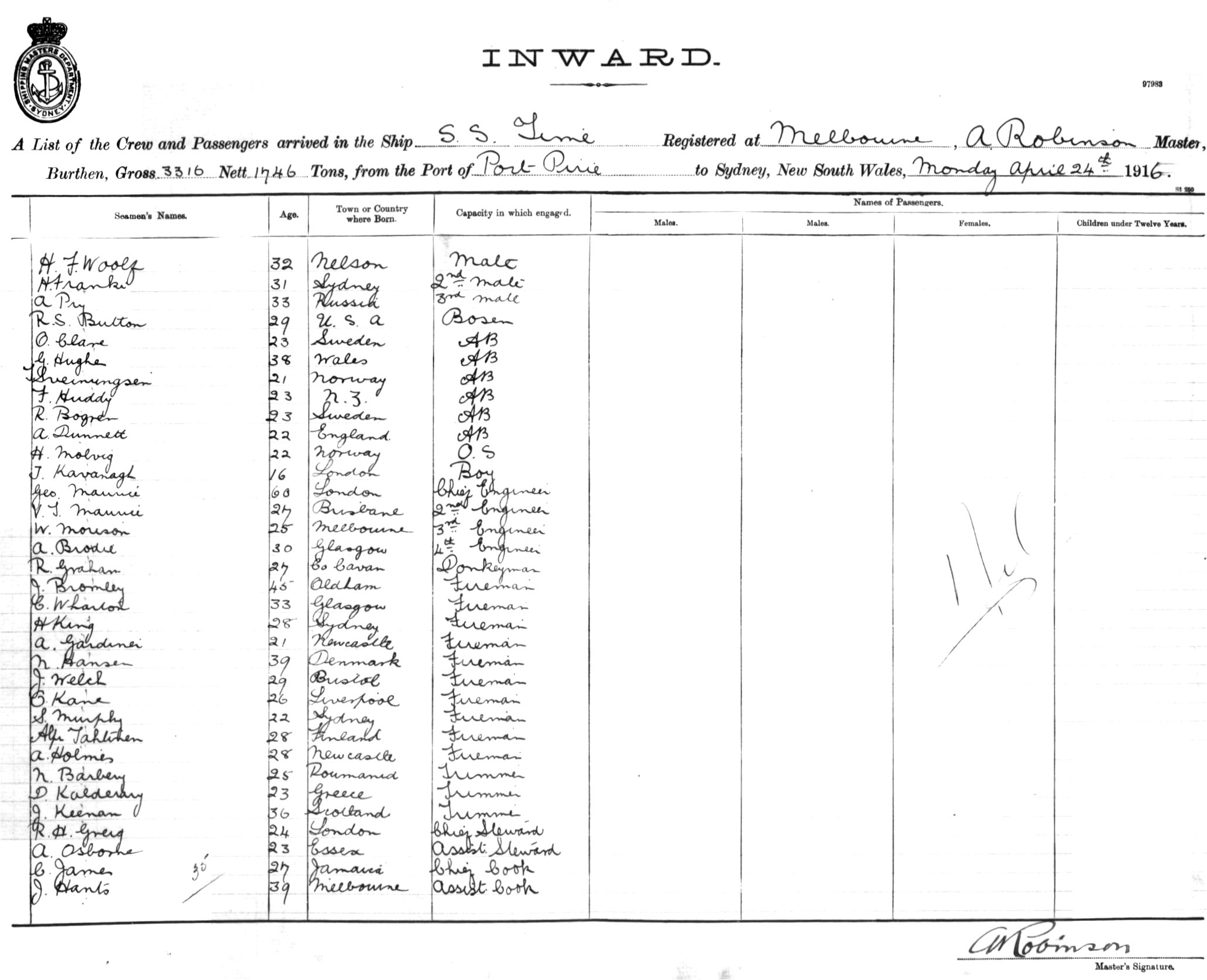 TIMEOF MELBOURNE, A. ROBINSON, MASTER, BURTHEN 3316/1746 TONS FROM THE PORT OF PORT PIRIE TO SYDNEY, NEW SOUTH WALES, 24TH APRIL 1916 |