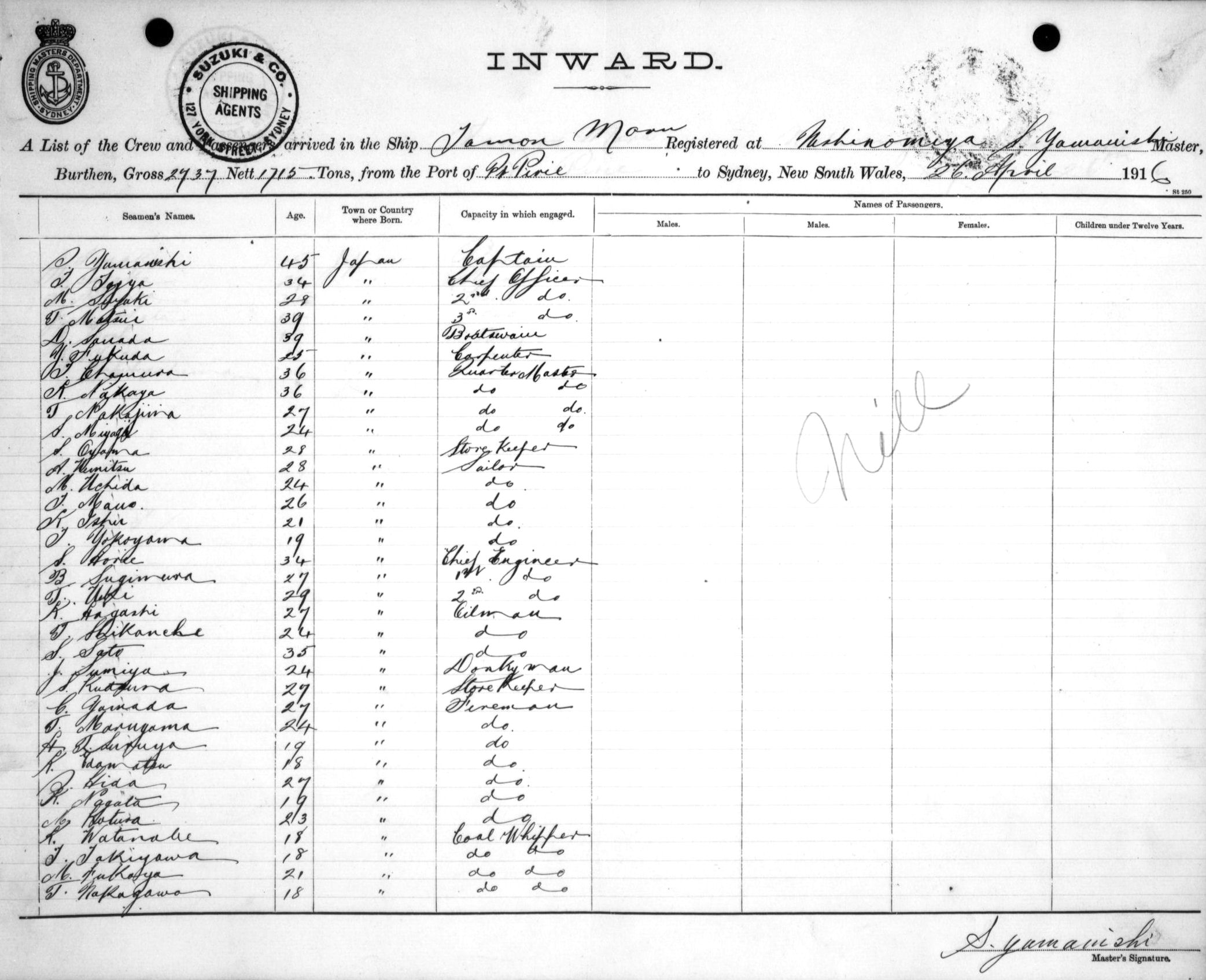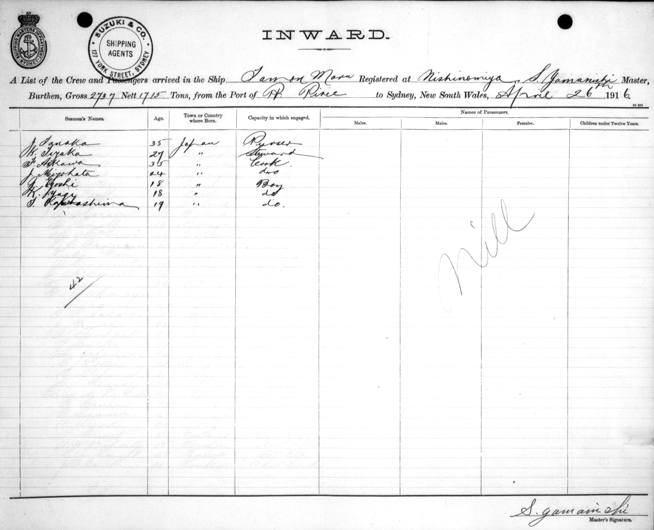 TAMON MARUOF NISHINOMIYA, JAPAN, S. YAMANISHI, MASTER, BURTHEN 2737/1715 TONS FROM THE PORT OF PORT PIRIE TO SYDNEY, NEW SOUTH WALES, 26TH APRIL 1916 |