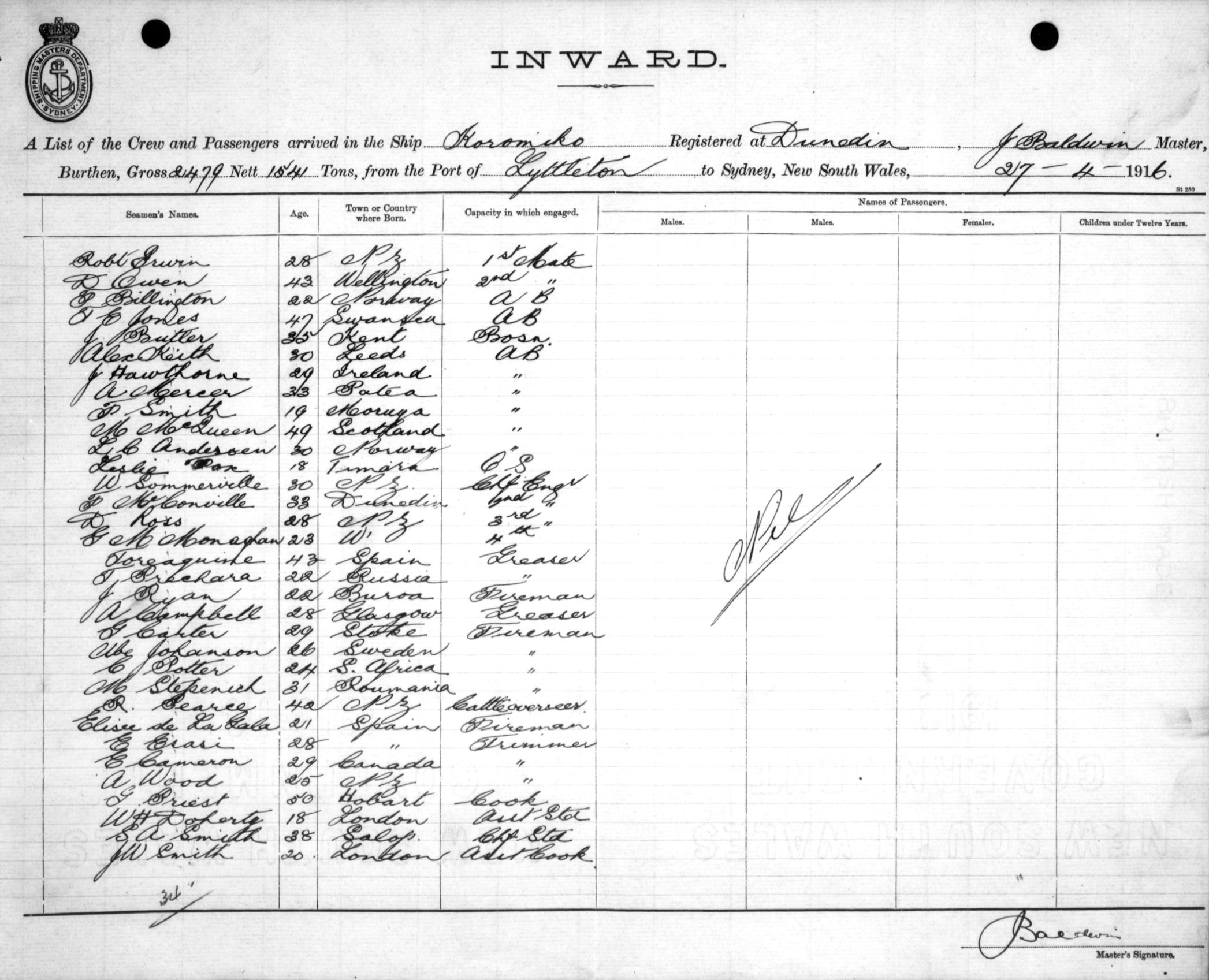 KOROMIKOOF DUNEDIN, J. BALDWIN, MASTER, BURTHEN 2479/1541 TONS FROM THE PORT OF LYTTELTON TO SYDNEY, NEW SOUTH WALES, 27TH APRIL 1916 |