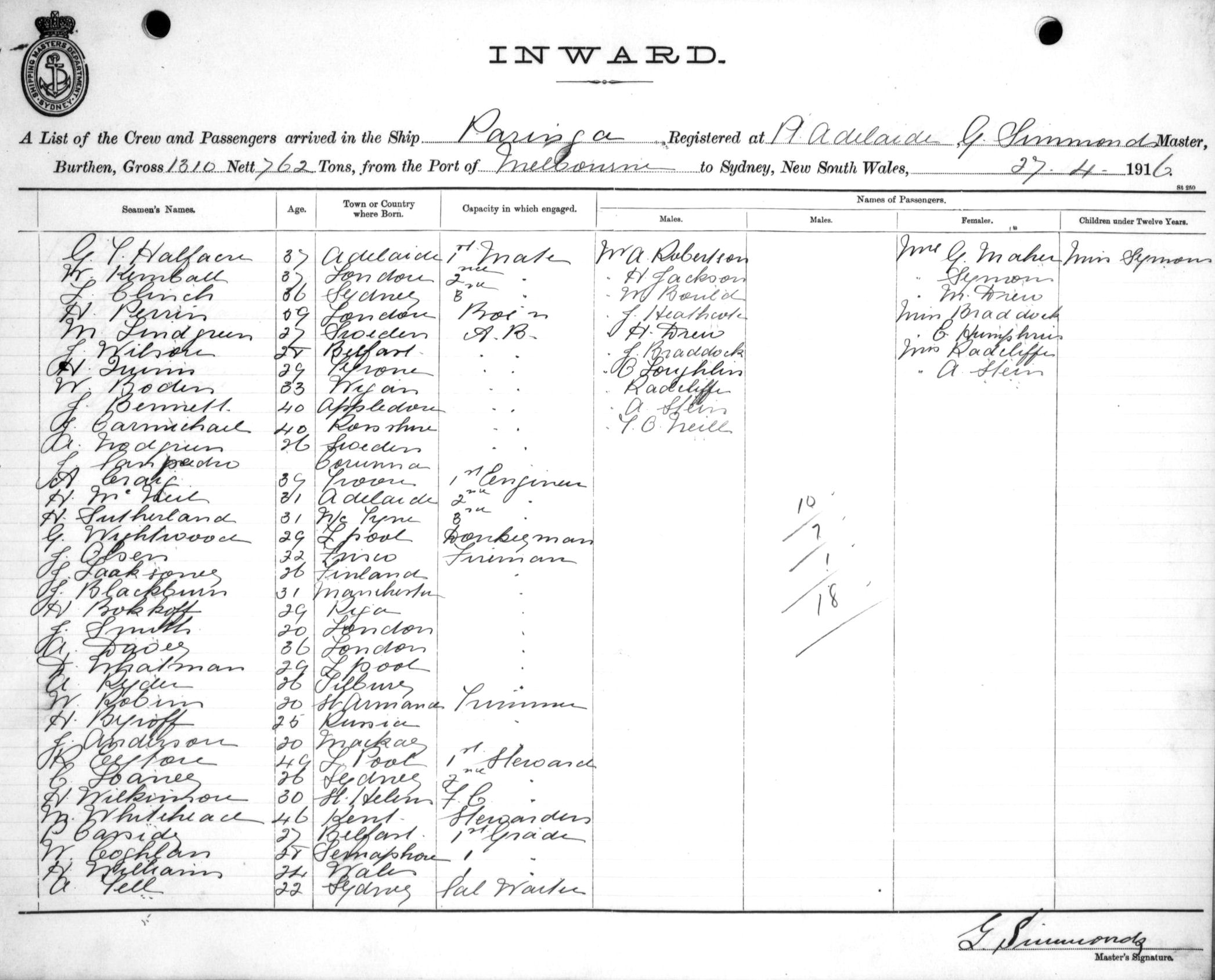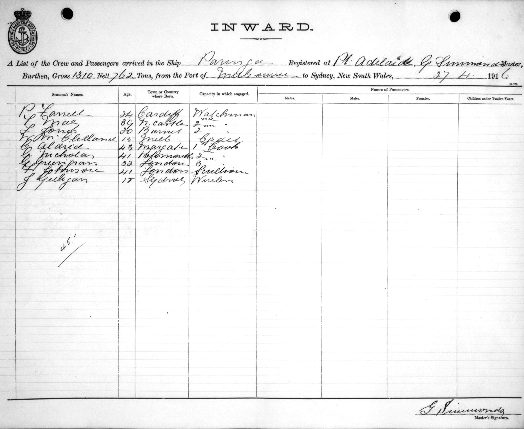 PARINGAOF PORT ADELAIDE, G. SIMMONDS, MASTER, BURTHEN 1310/762 TONS FROM THE PORT OF MELBOURNE TO SYDNEY, NEW SOUTH WALES, 27TH APRIL 1916 |