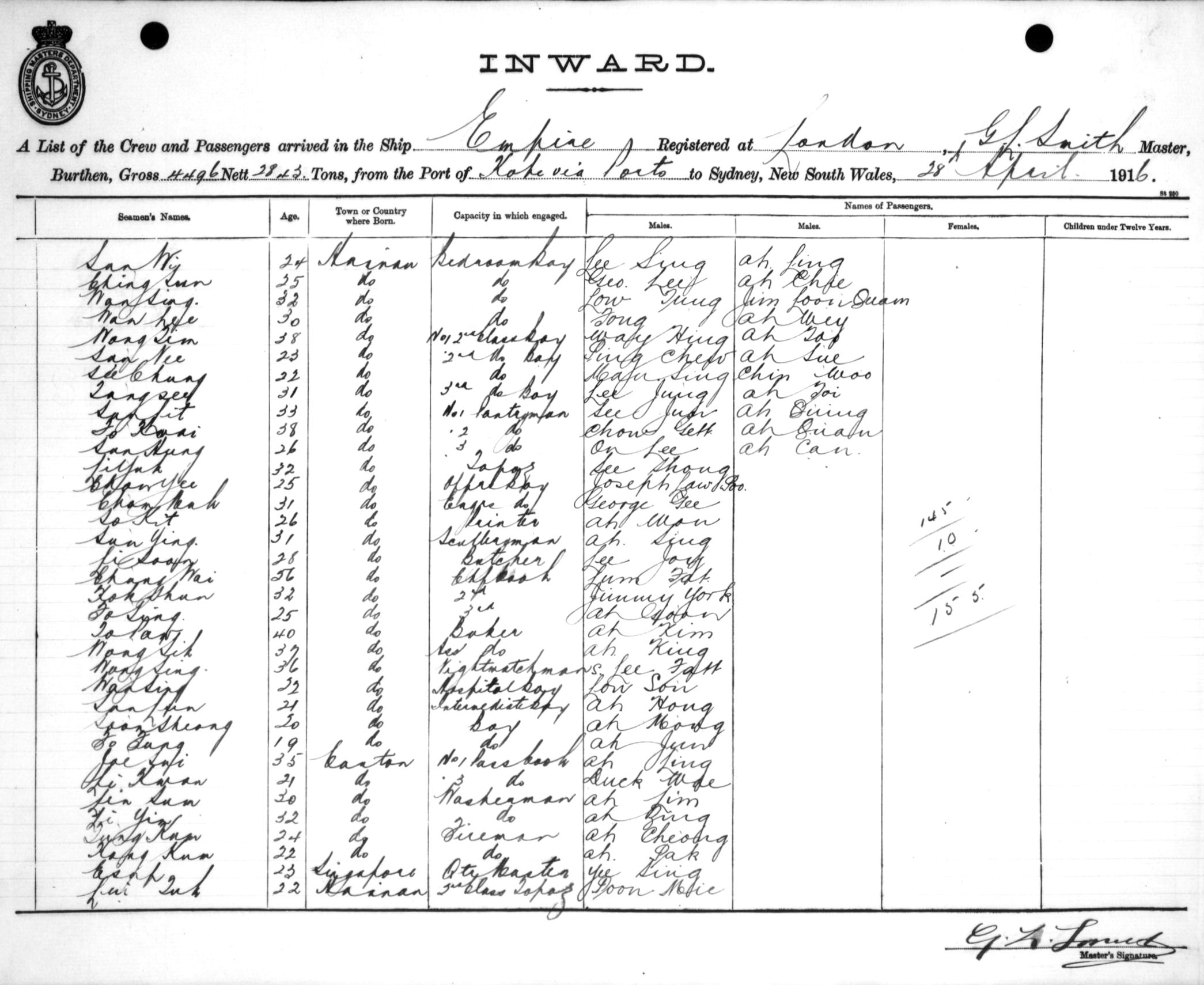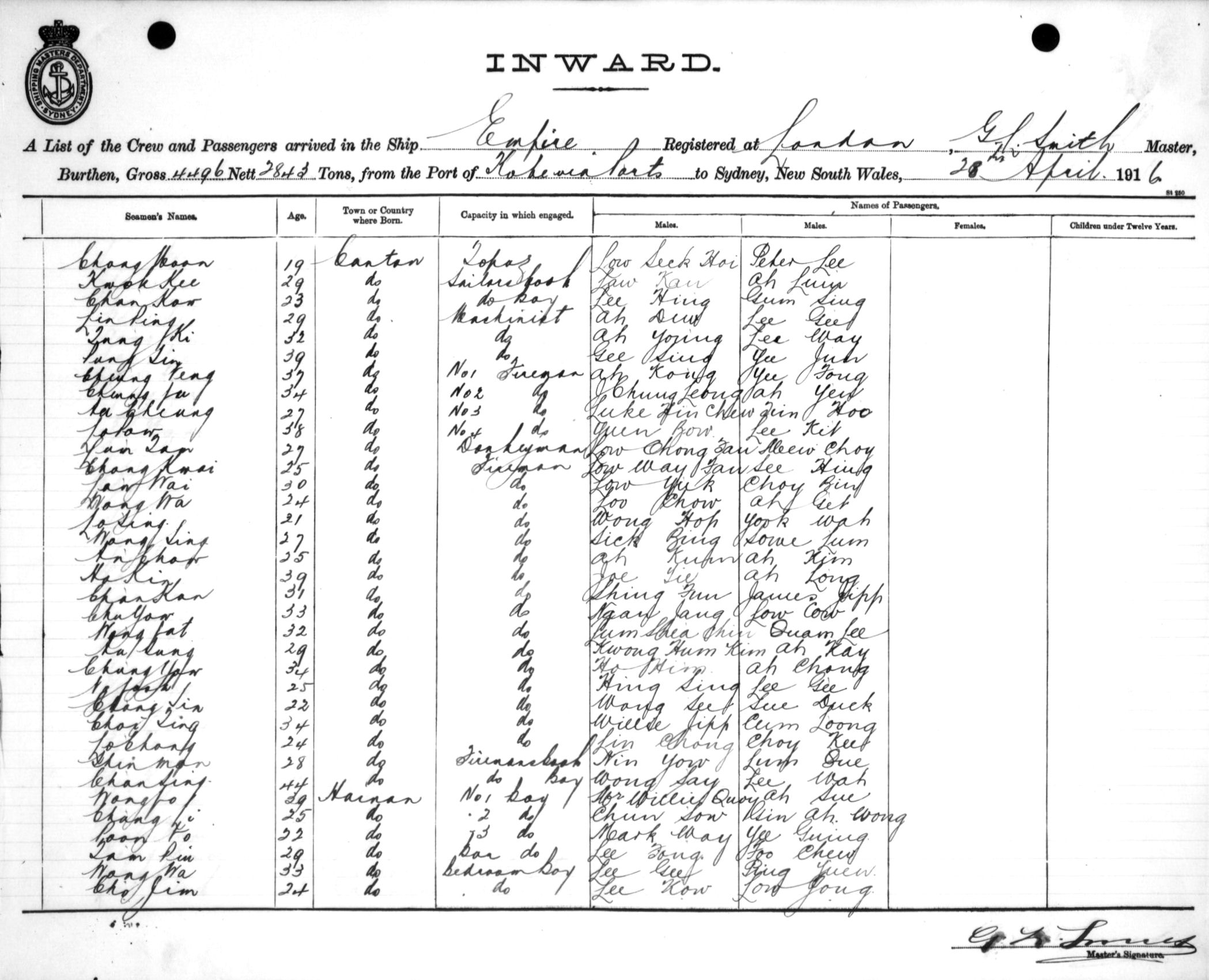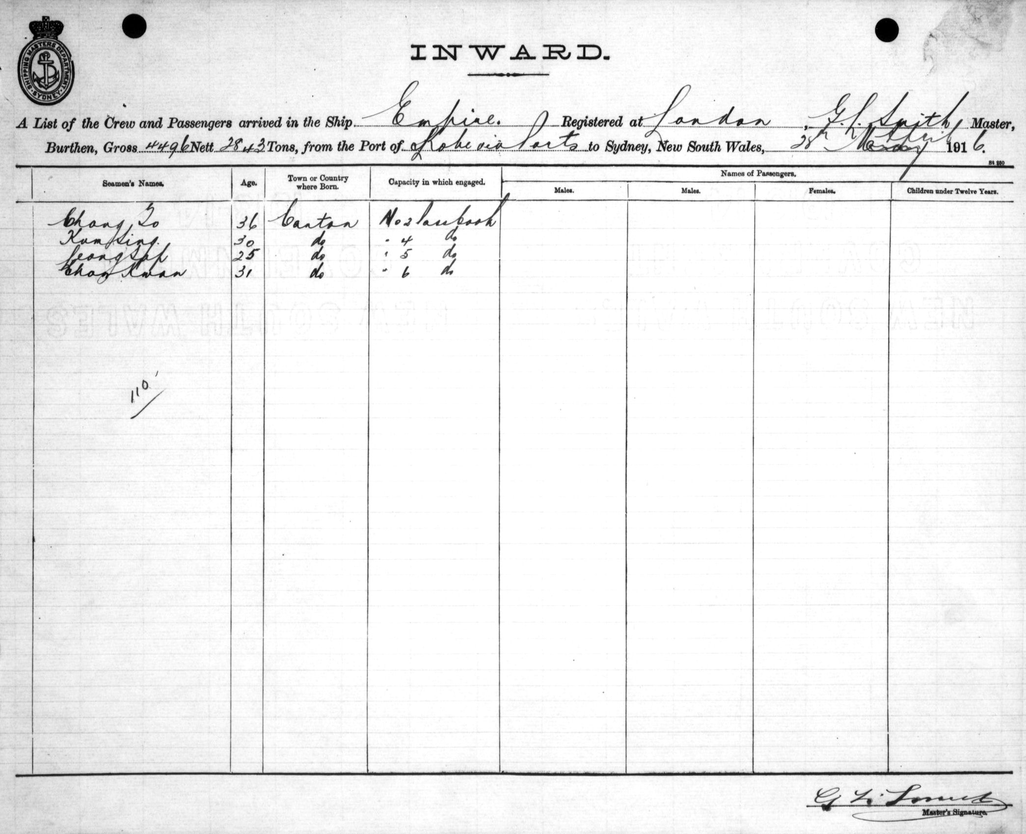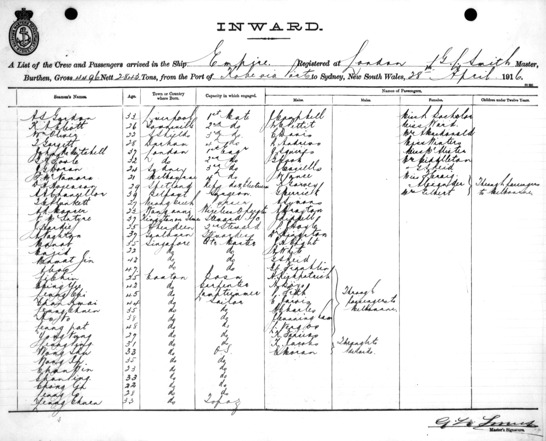 EMPIREOF LONDON, G. L. SMITH, MASTER, BURTHEN 4496/2845 TONS FROM THE PORT OF KPBE via PORTS TO SYDNEY, NEW SOUTH WALES, 28TH APRIL 1916 |
