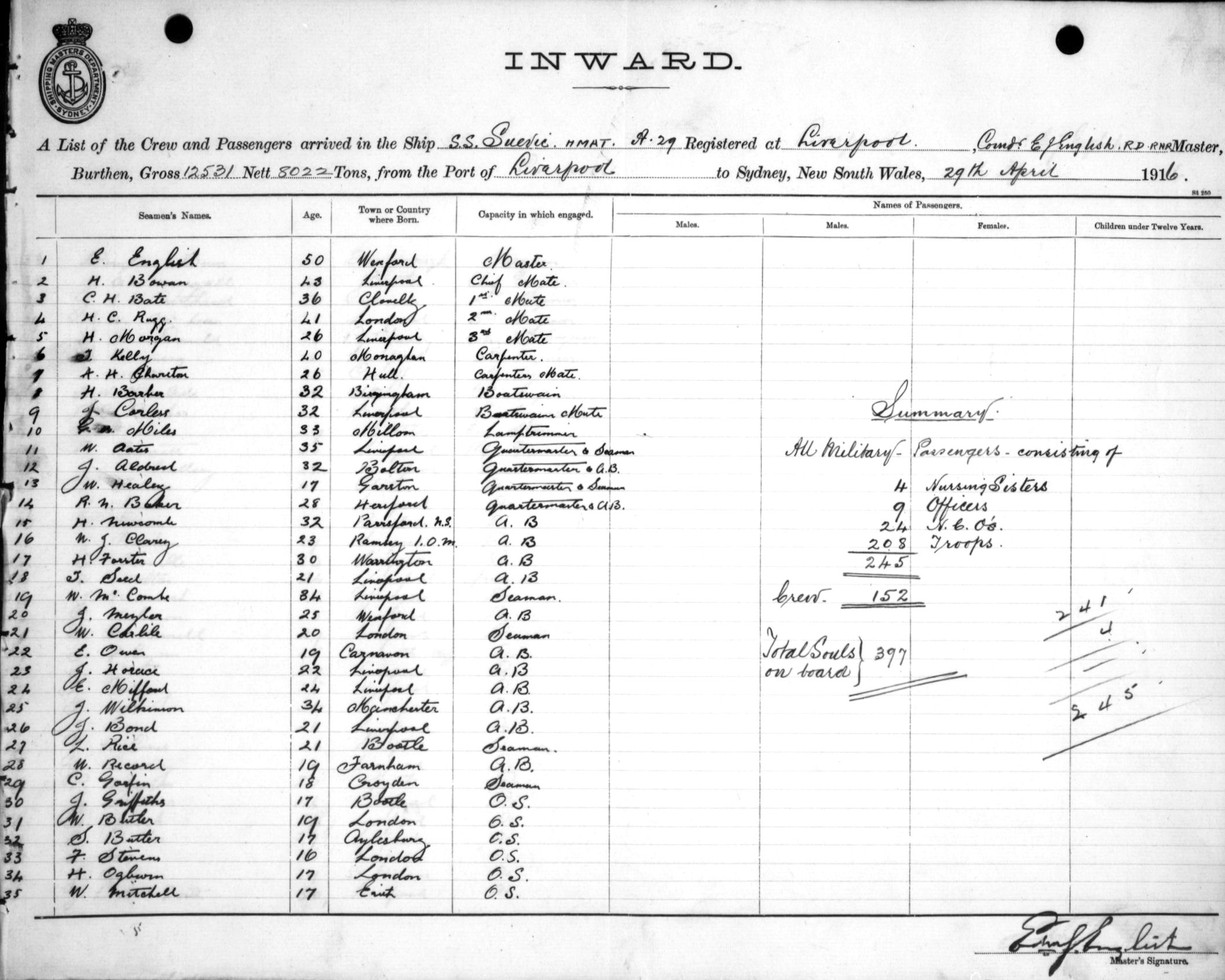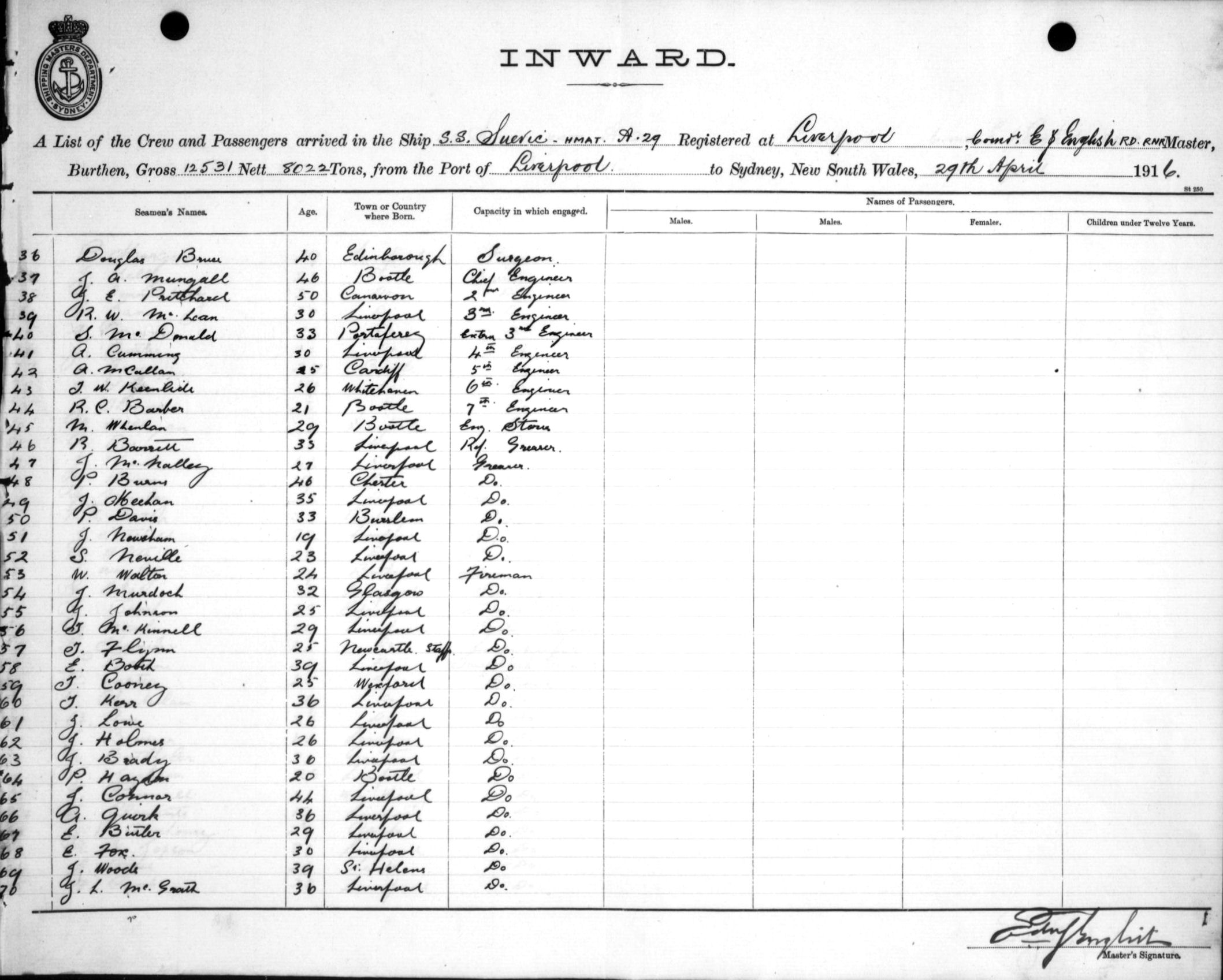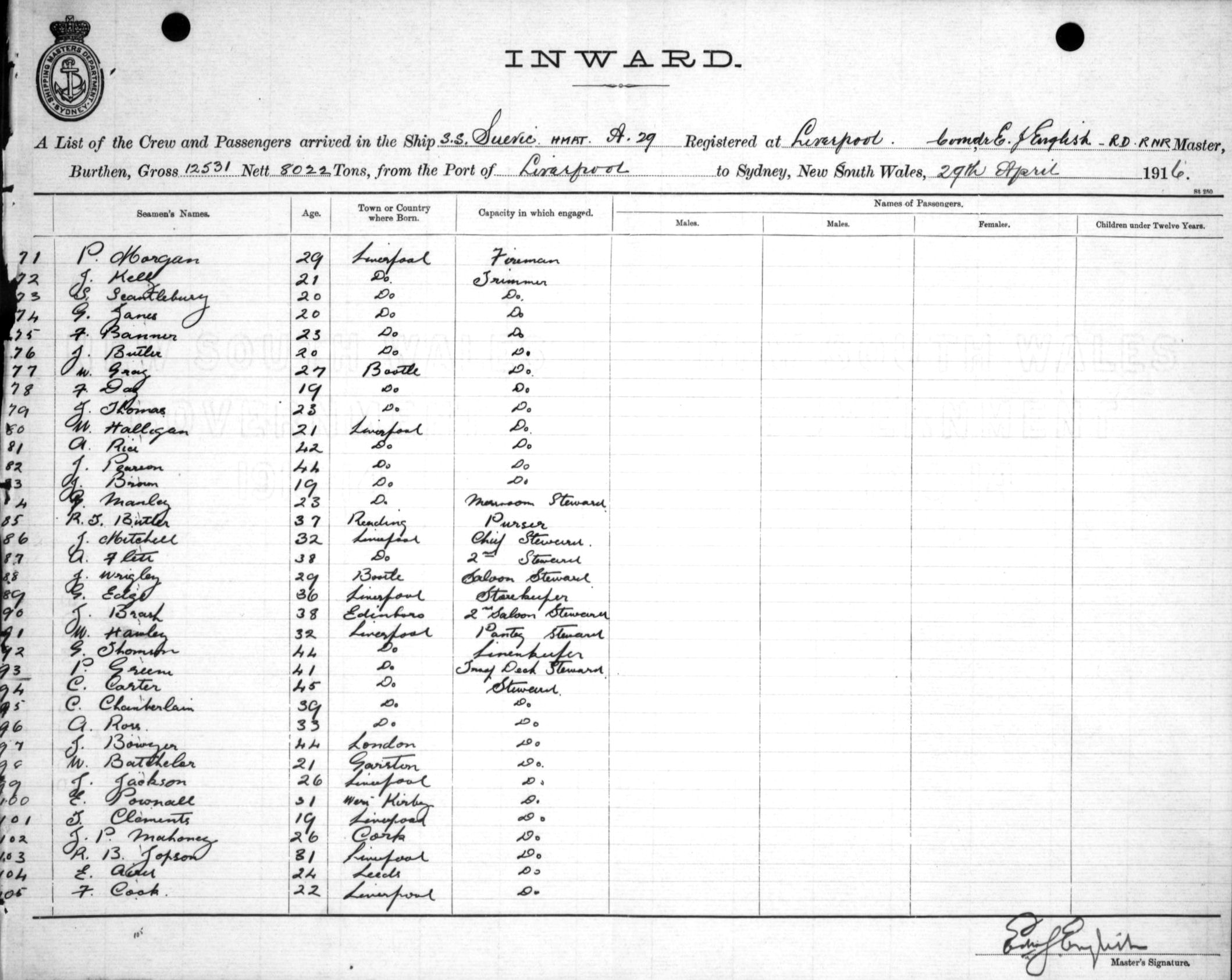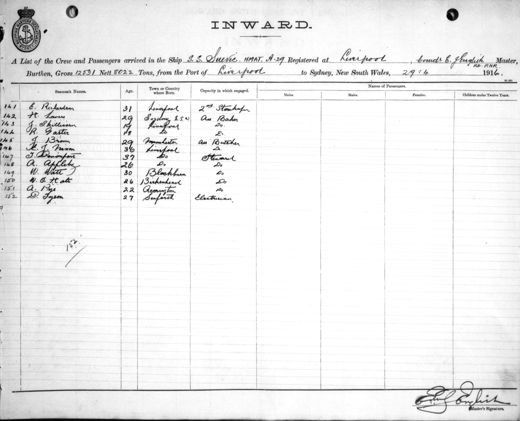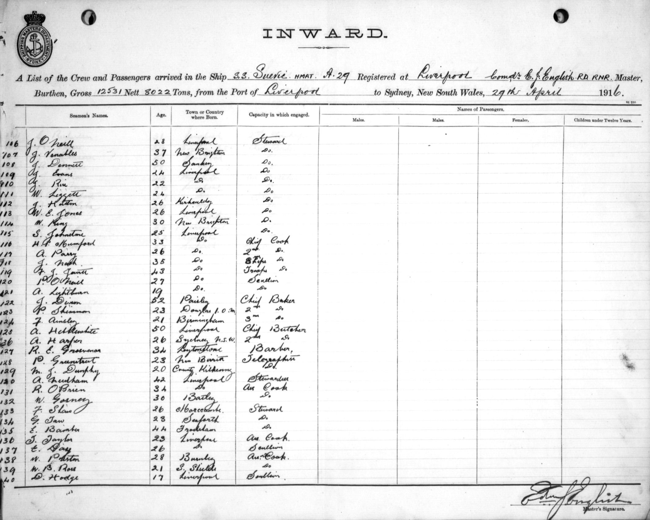 Mariners and ships in Australian Waters | SUEVICOF LIVERPOOL, E. J. ENGLISH, MASTER, BURTHEN 12531/8022 TONS FROM THE PORT OF LIVERPOOL TO SYDNEY, NEW SOUTH WALES, 29TH APRIL 1916 |