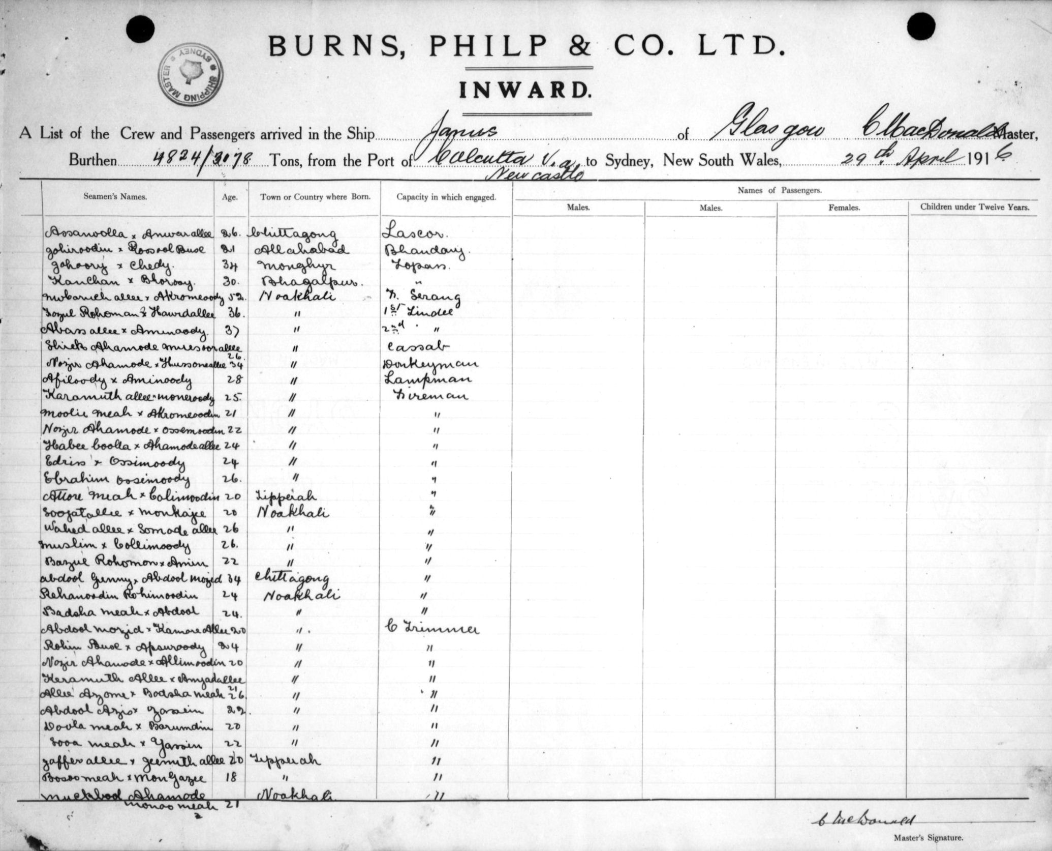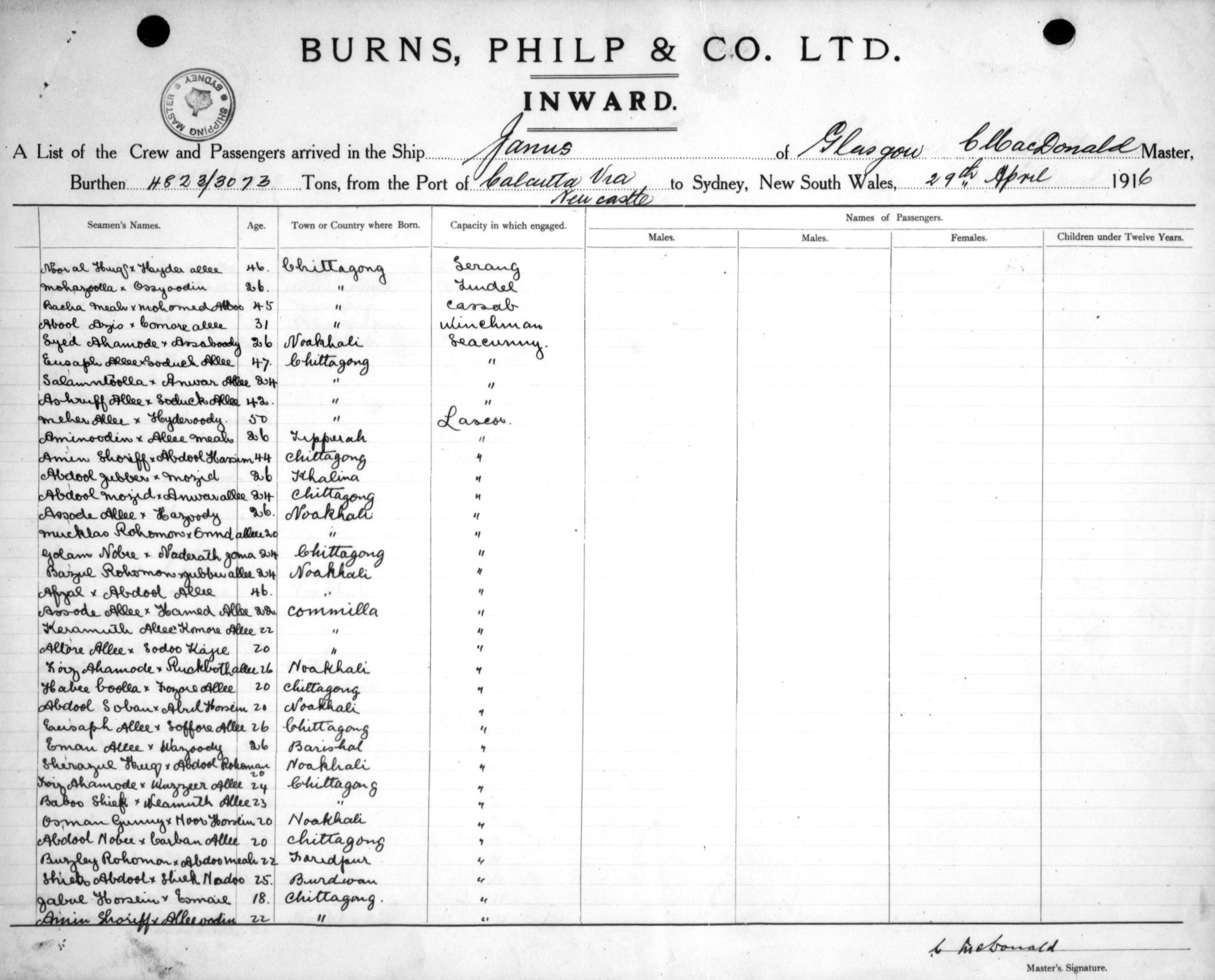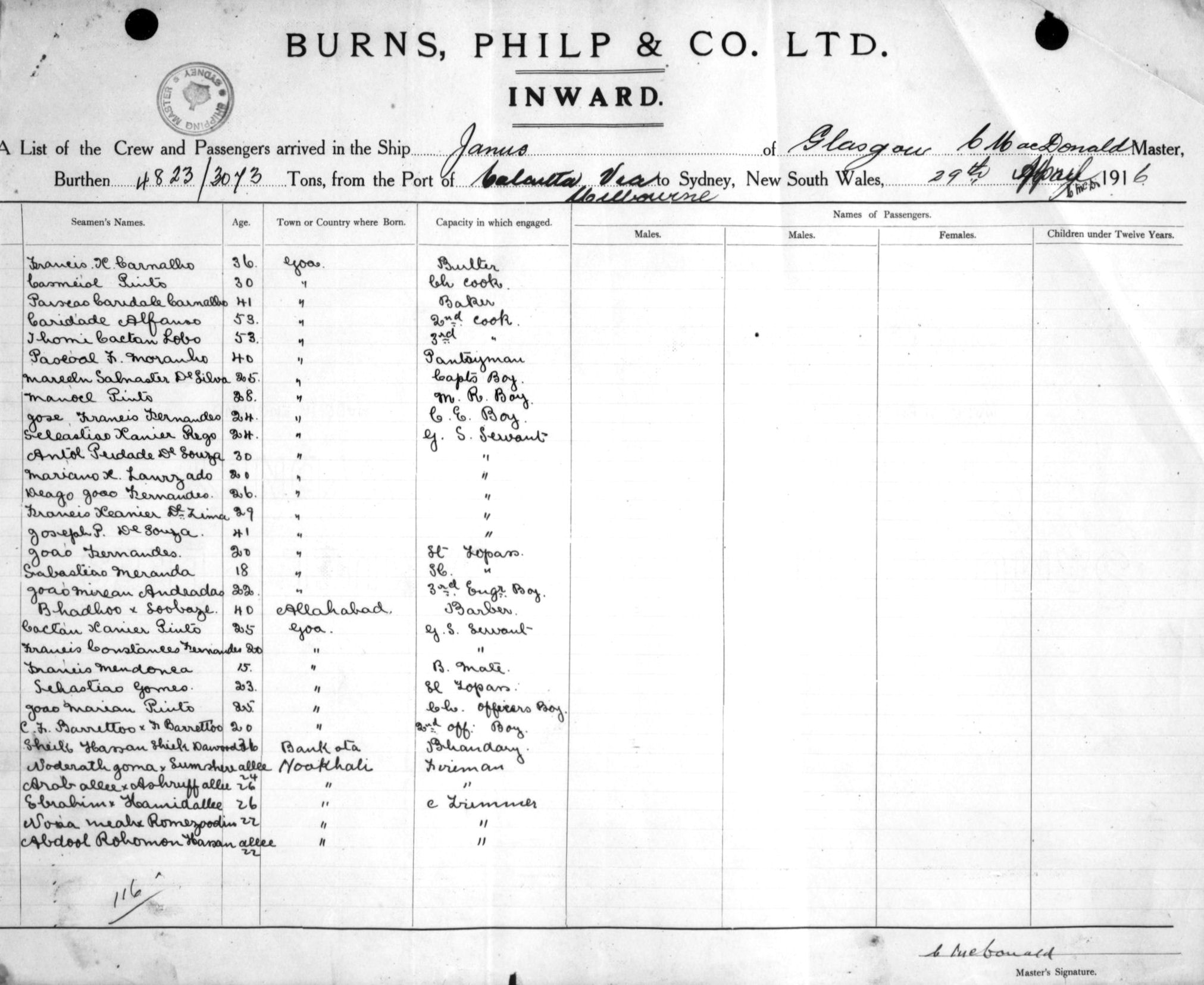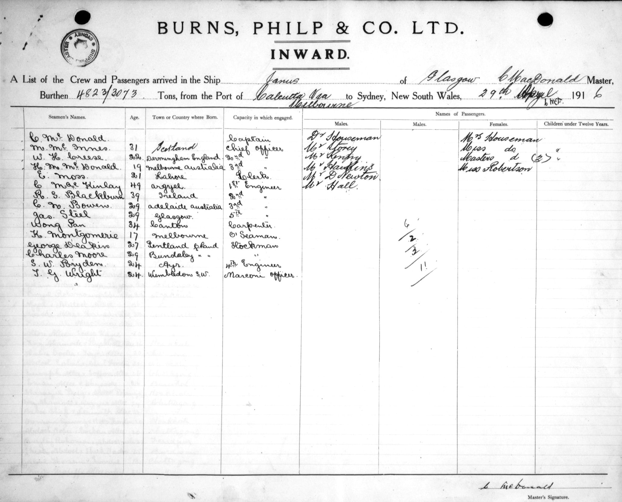 Mariners and ships in Australian Waters | JANUSOF GLASGOW, C. MACDONALD, MASTER, BURTHEN 4823/3073 TONS FROM THE PORT OF CALCUTTA via MELBOURNE TO SYDNEY, NEW SOUTH WALES, 29TH APRIL 1916 |
