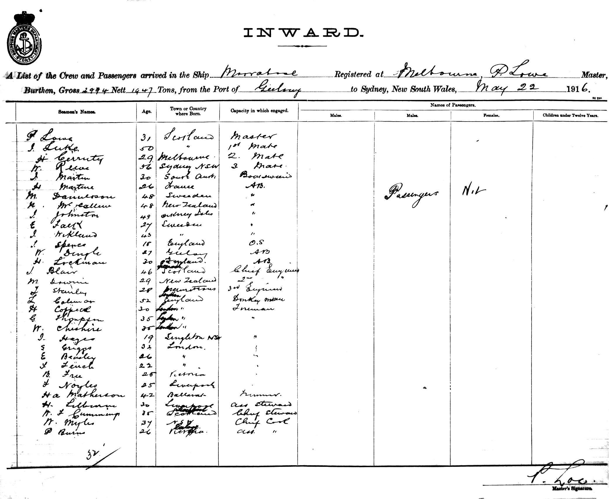 Mariners and ships in Australian Waters | MOORABOOLOF MELBOURNE, P. LOWE, MASTER, BURTHEN 2994/1947 TONS FROM THE PORT OF GEELONG TO SYDNEY, NEW SOUTH WALES, 22ND MAY 1916 |