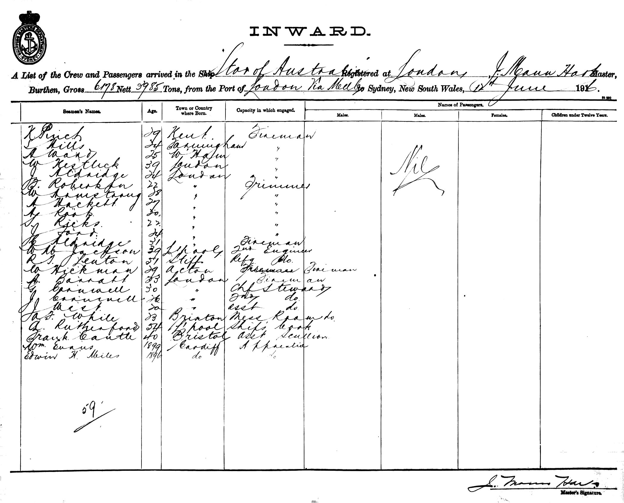 STAR OF AUSTRALIAOF LONDON, J. MANN HART, MASTER, BURTHEN 6178/3985 TONS FROM THE PORT OF LONDON via MELBOURNE TO SYDNEY, NEW SOUTH WALES, 12TH JUNE 1916 |