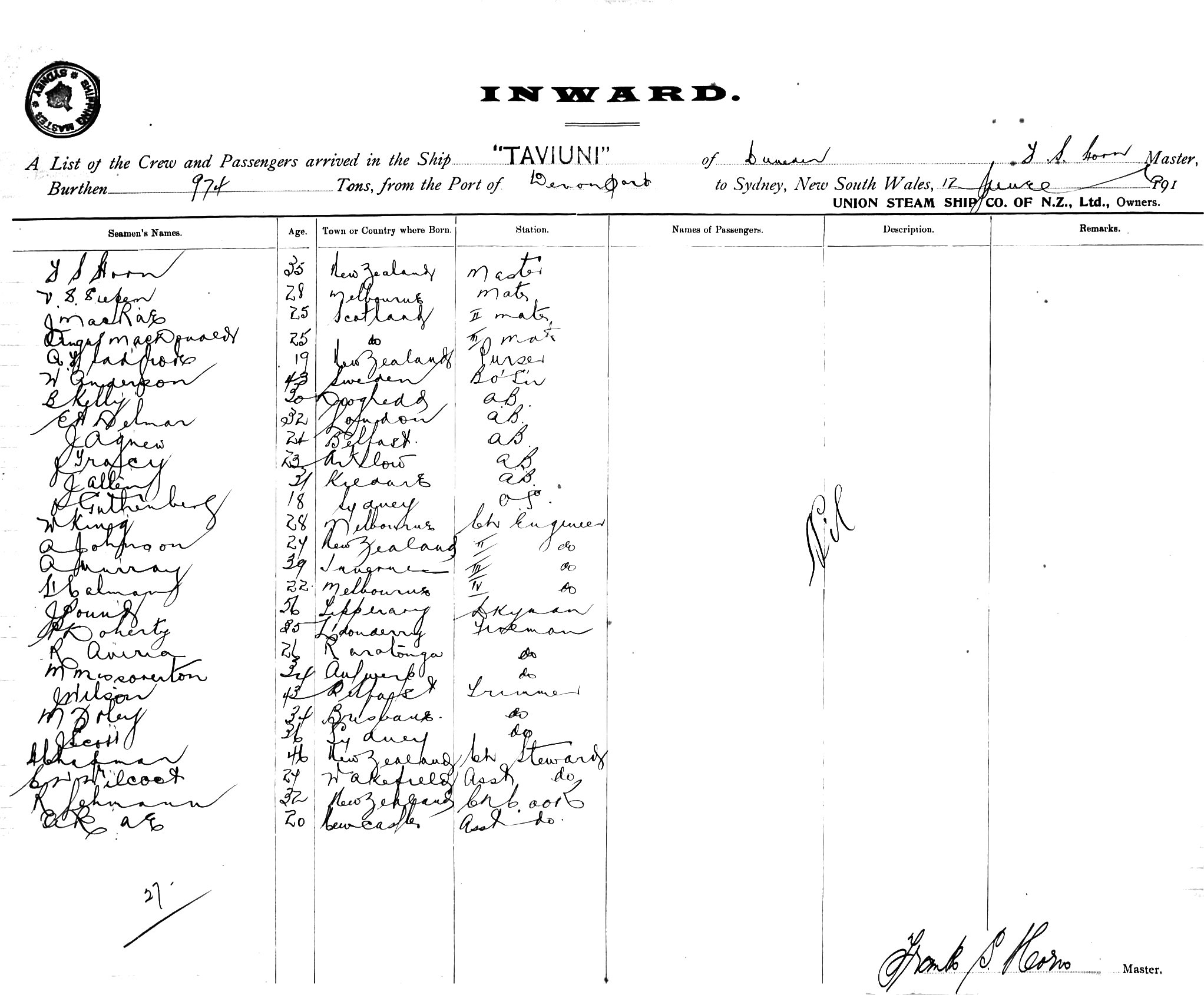 TAVIUNIOF DUNEDIN, FRANK S. HORN, MASTER, BURTHEN 974 TONS FROM THE PORT OF DEVONPORT TO SYDNEY, NEW SOUTH WALES, 12TH JUNE 1916 |