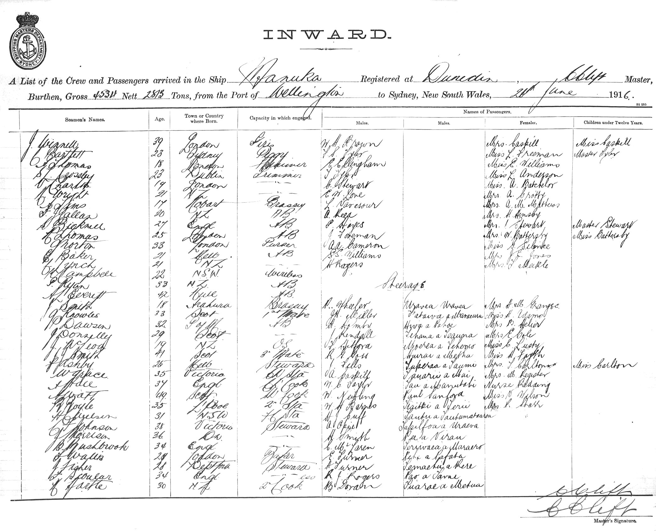 MANUKAOF DUNEDIN, C. CLIFT, MASTER, BURTHEN 4537/2813 TONS FROM THE PORT OF WELLINGTON TO SYDNEY, NEW SOUTH WALES, 26TH JUNE 1916 |