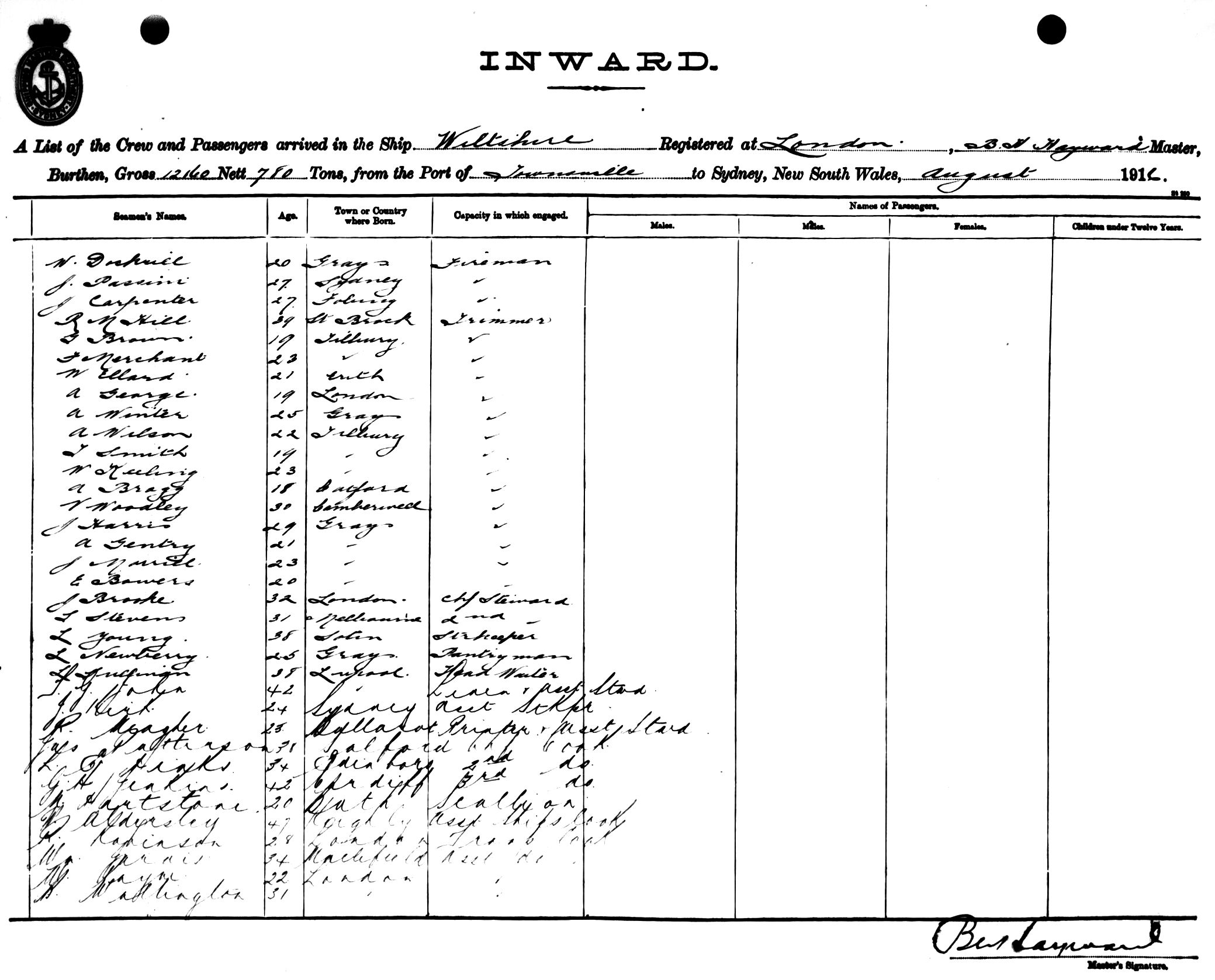 WILTSHIREOF LONDON, B. H. HAYWARD, MASTER, BURTHEN 12160/7801 TONS FROM THE PORT OF TOWNSVILLE TO SYDNEY, NEW SOUTH WALES, AUGUST 1916 |