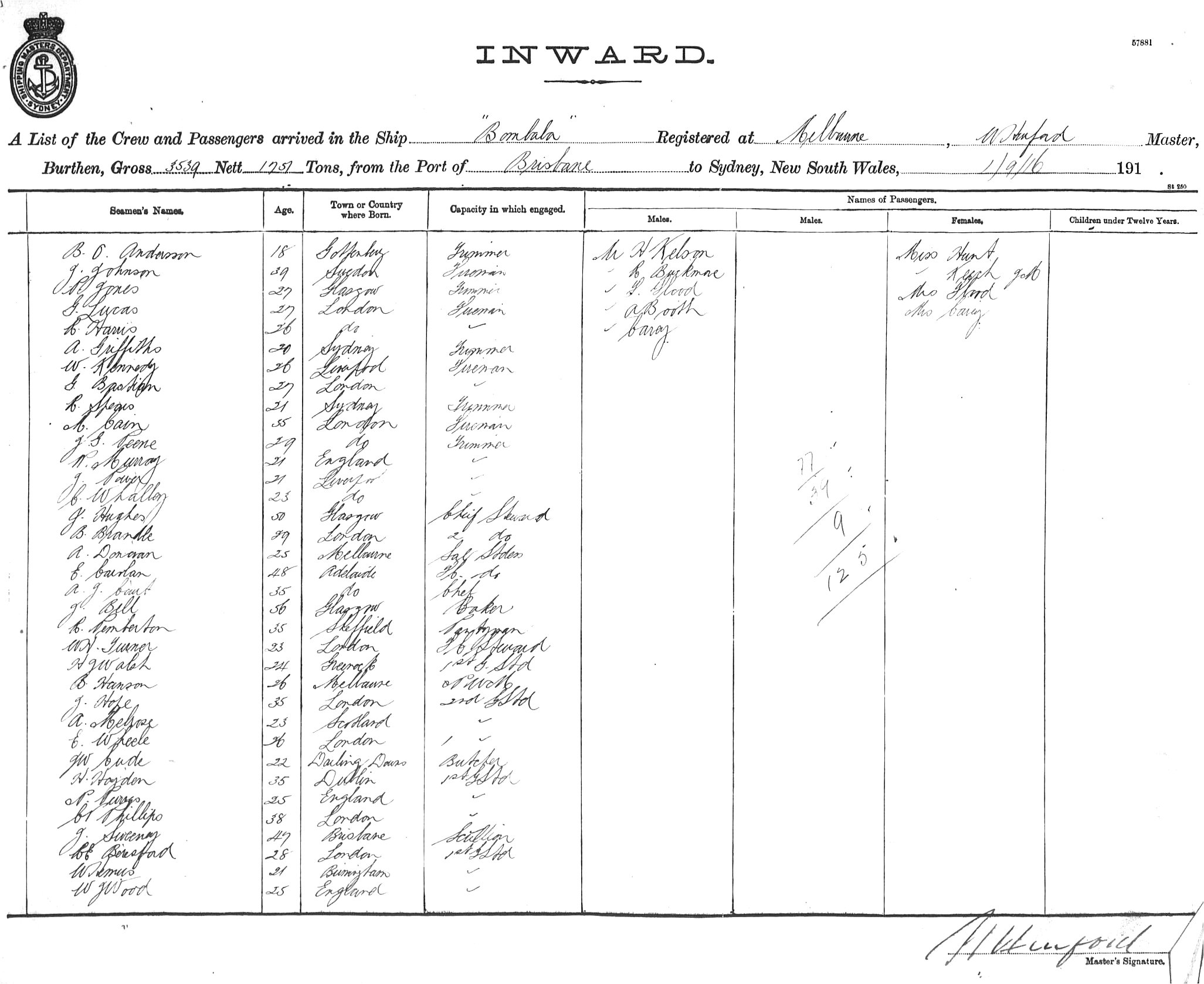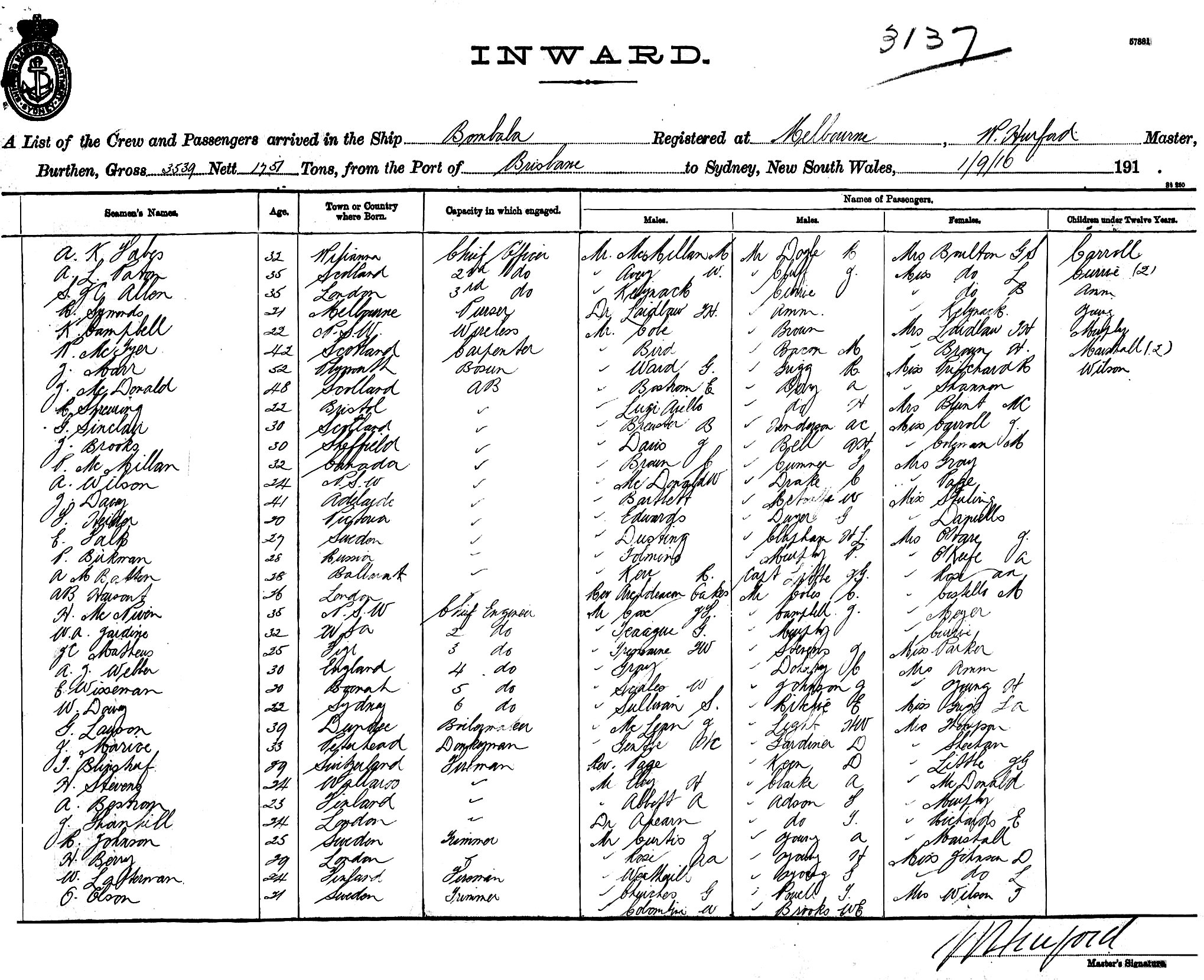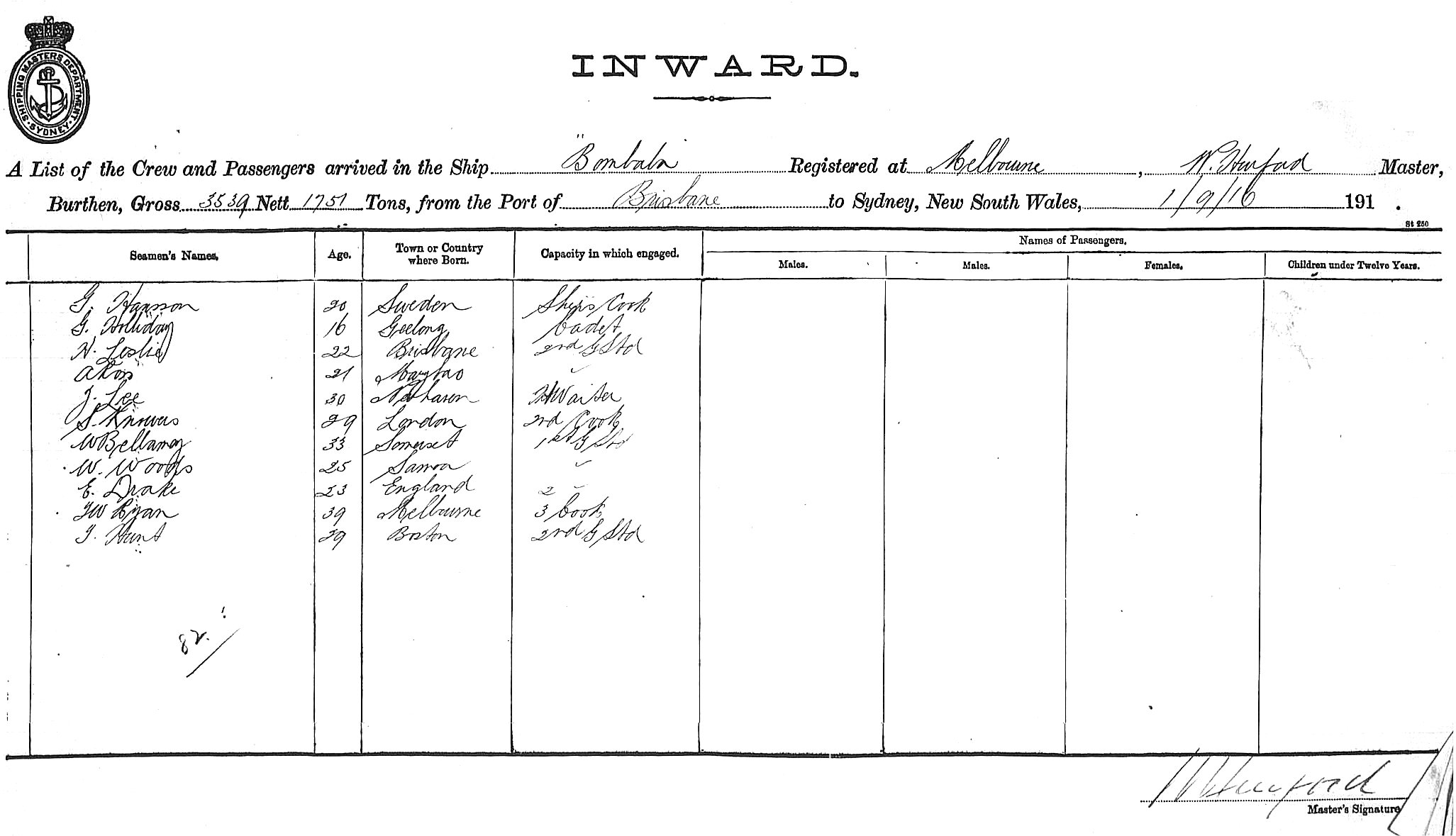 BOMBALAOF MELBOURNE, W. HURFORD, MASTER, BURTHEN 3539/1751 TONS FROM THE PORT OF BRISBANE TO SYDNEY, NEW SOUTH WALES, 01 SEPTEMBER 1916 |