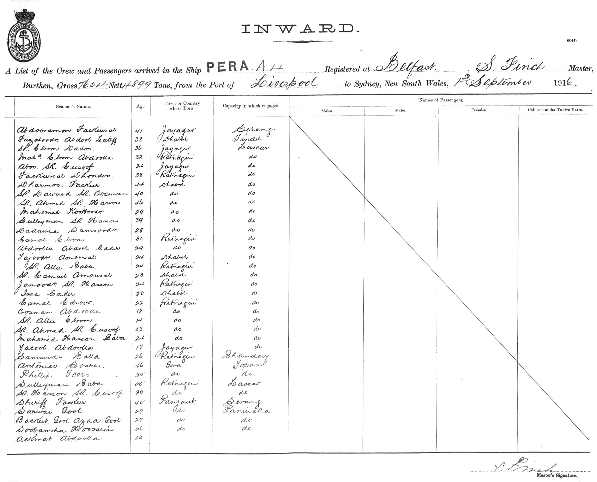 PERAOF BELFAST, S. FINCH, MASTER, BURTHEN 7654/4899 TONS FROM THE PORT OF LIVERPOOL TO SYDNEY, NEW SOUTH WALES, 01 SEPTEMBER 1916 |