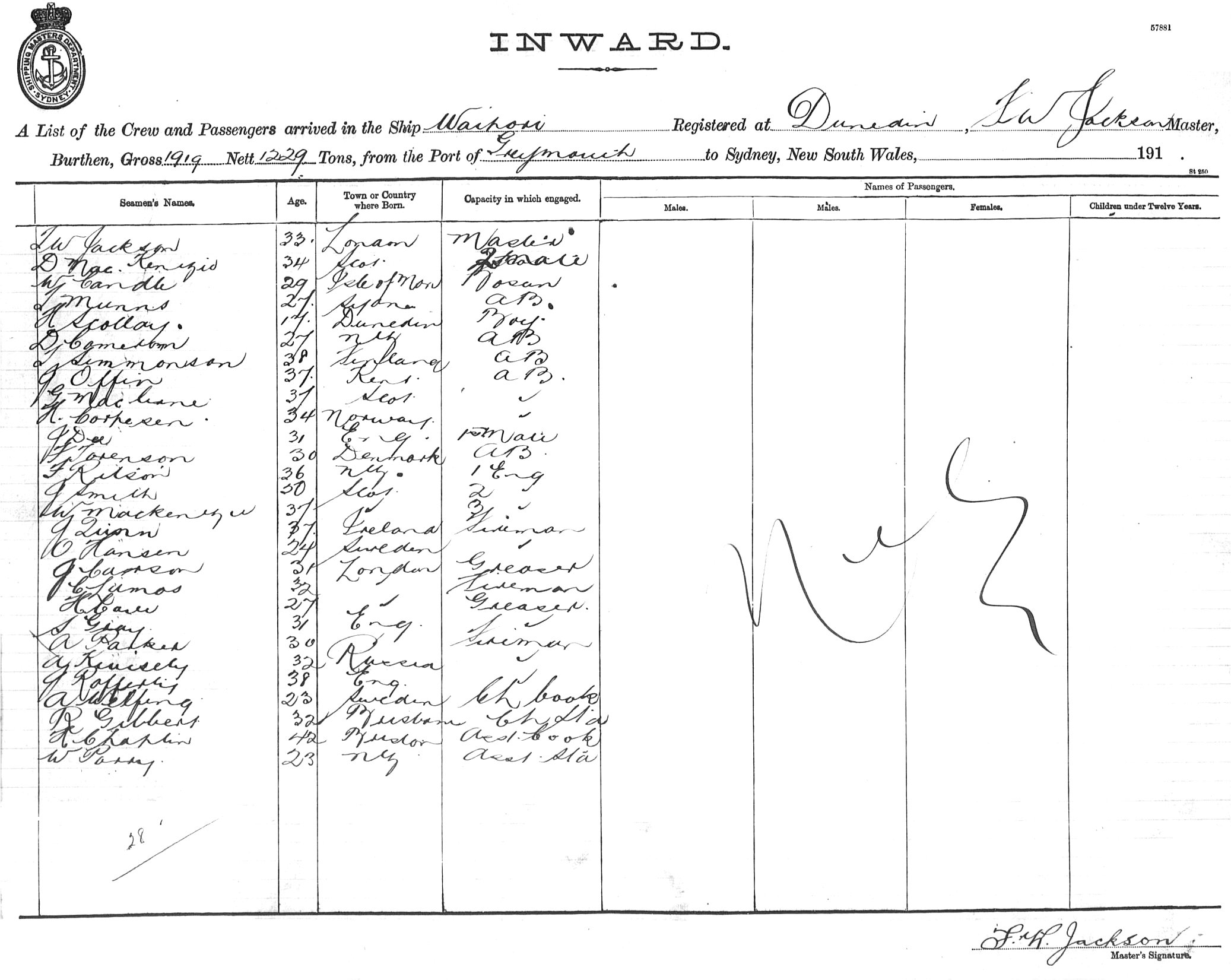 WAIPORIOF DUNEDIN, F.W. JACKSON, MASTER, BURTHEN 1919/1229 TONS FROM THE PORT OF GREYMOUTH TO SYDNEY, NEW SOUTH WALES, SEPTEMBER 1916 |