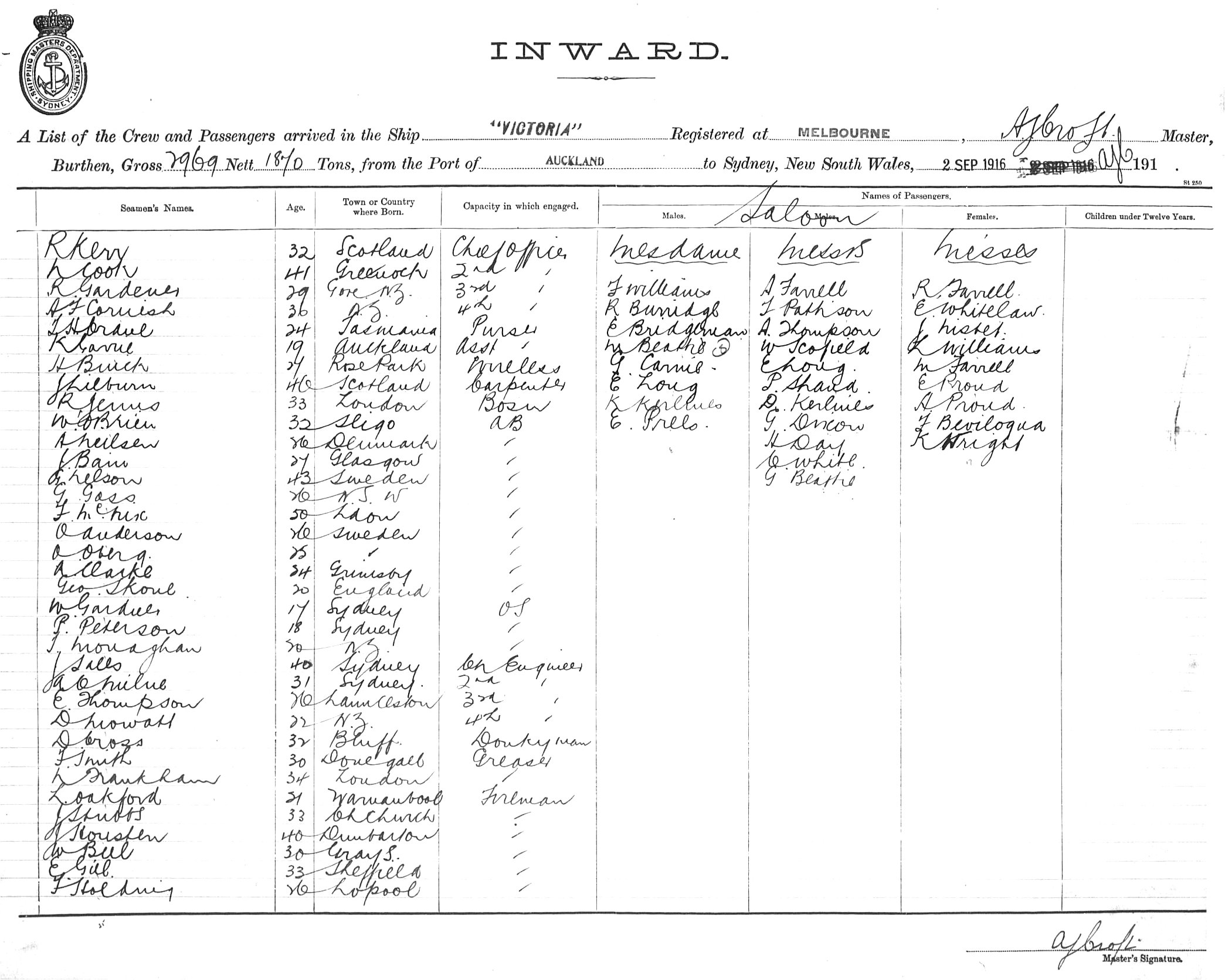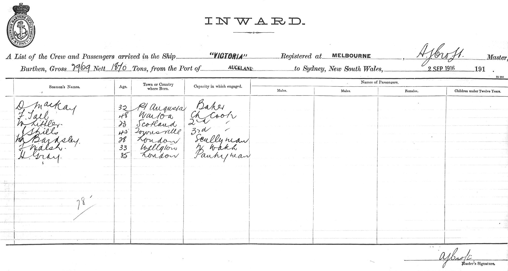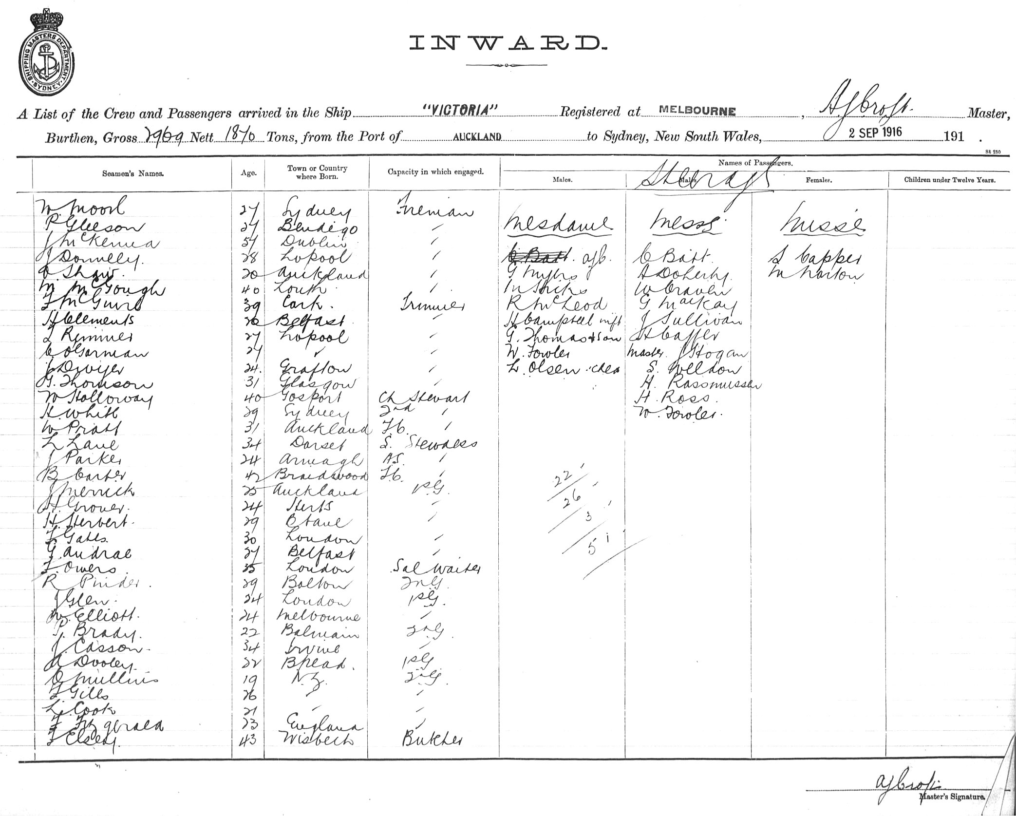 VICTORIAOF MELBOURNE, A.J. CROFT, MASTER, BURTHEN 2969/1870 TONS FROM THE PORT OF AUCKLAND TO SYDNEY, NEW SOUTH WALES, 02 SEPTEMBER 1916 |