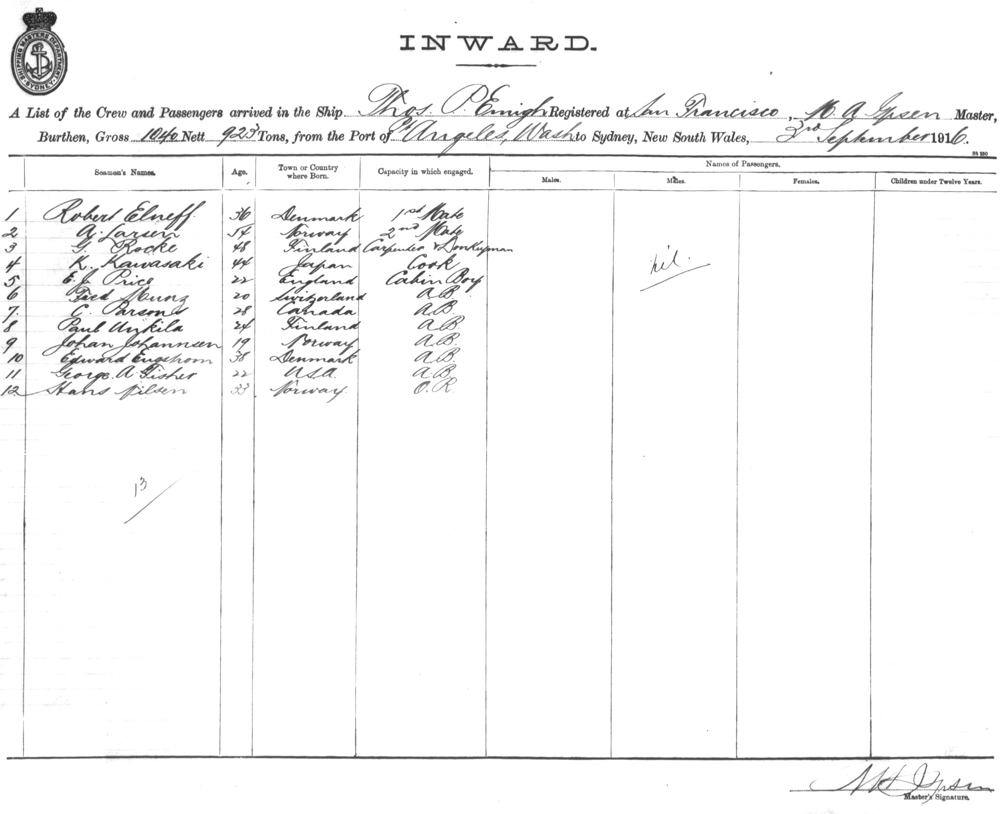 THOMAS P EMIGHOF SAN FRANCISCO, M.A. IPSEN, MASTER, BURTHEN 1046/923 TONS FROM THE PORT OF PORT ANGELES, WASHINGTON, U..S.A. TO SYDNEY, NEW SOUTH WALES, 03 SEPTEMBER 1916 |