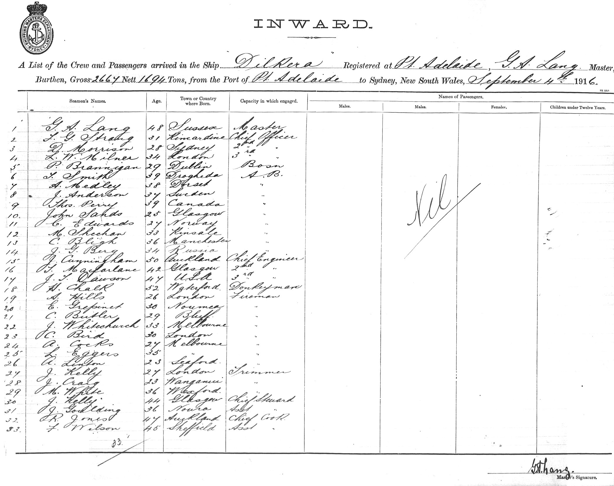 DILKERAOF PORT ADELAIDE, G.A. LANG, MASTER, BURTHEN 2667/1694 TONS FROM THE PORT OF PORT ADELAIDE TO SYDNEY, NEW SOUTH WALES, 04 SEPTEMBER 1916 |