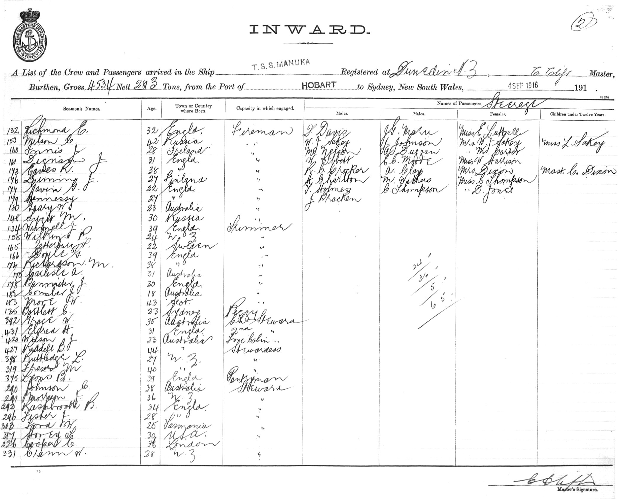 MANUKAOF DUNEDIN N.Z., C. CLIFT, MASTER, BURTHEN 4534/2813 TONS FROM THE PORT OF HOBART TO SYDNEY, NEW SOUTH WALES, 04 SEPTEMBER 1916 |
