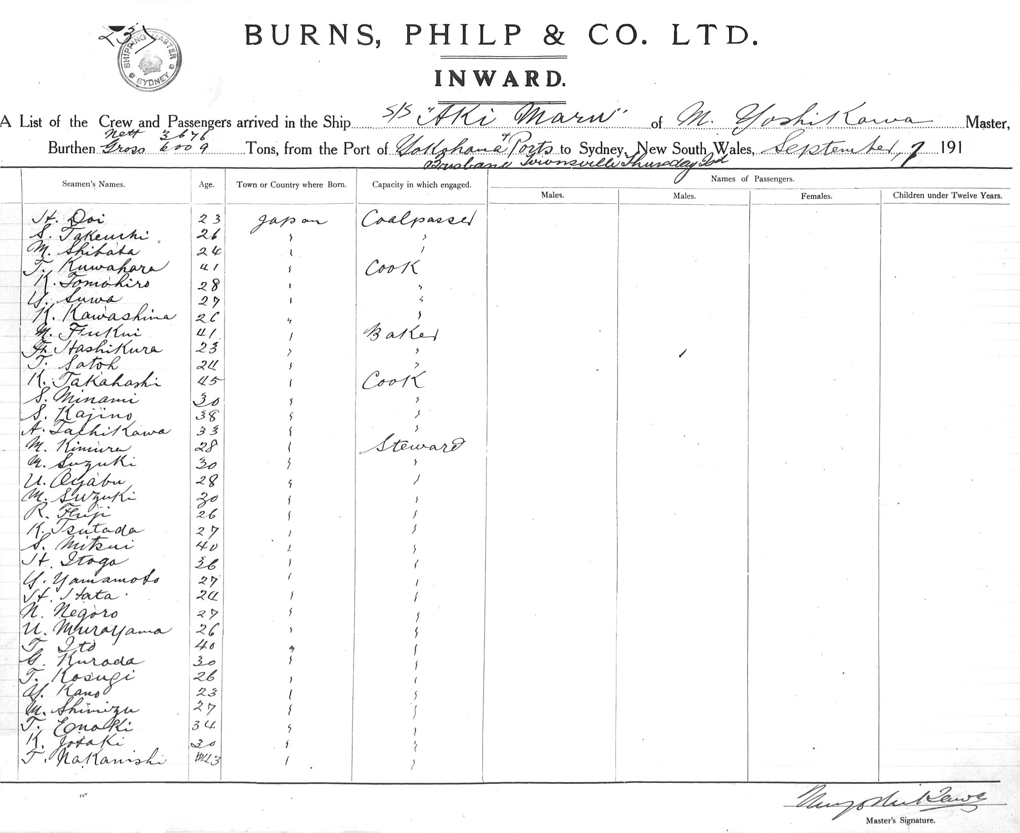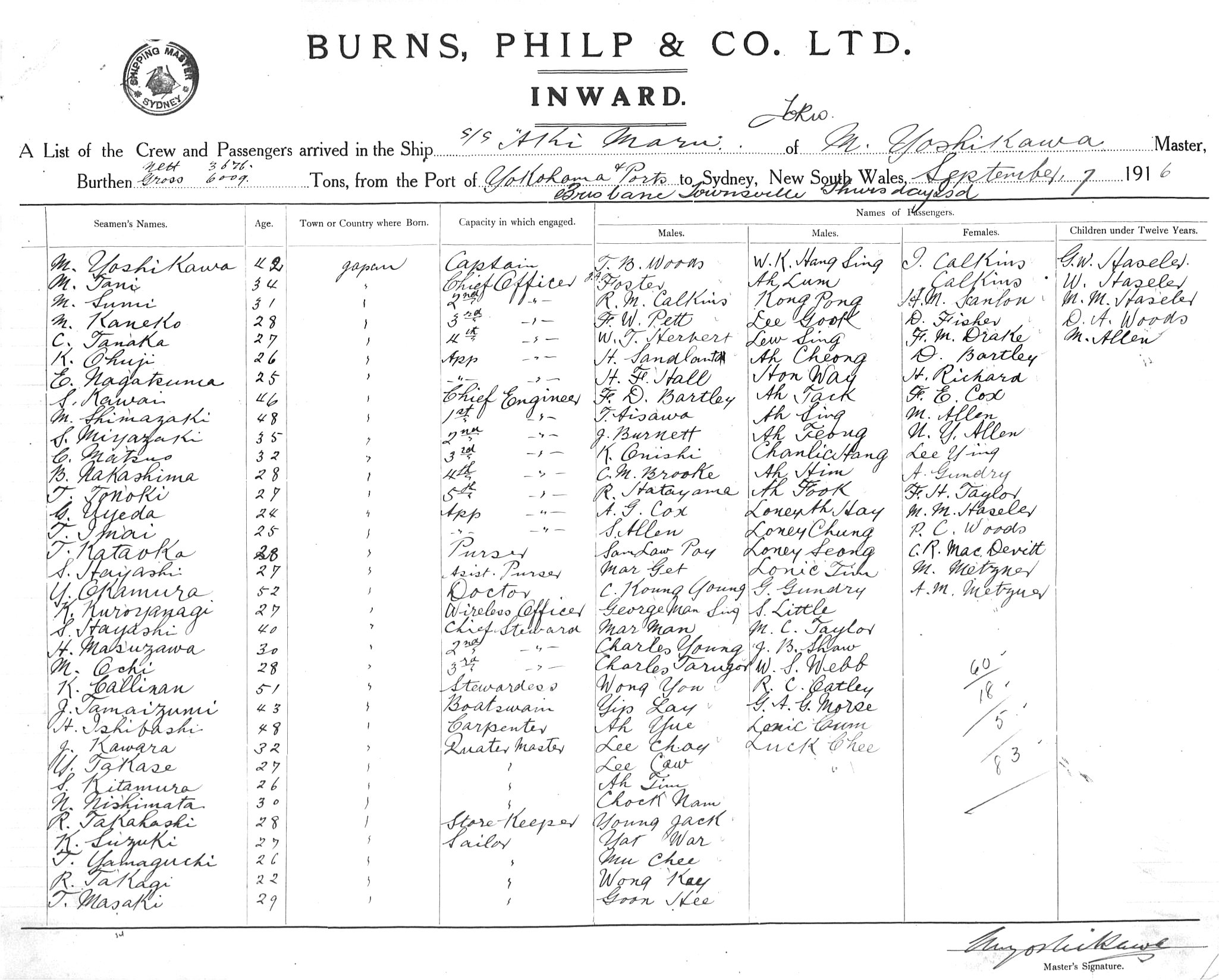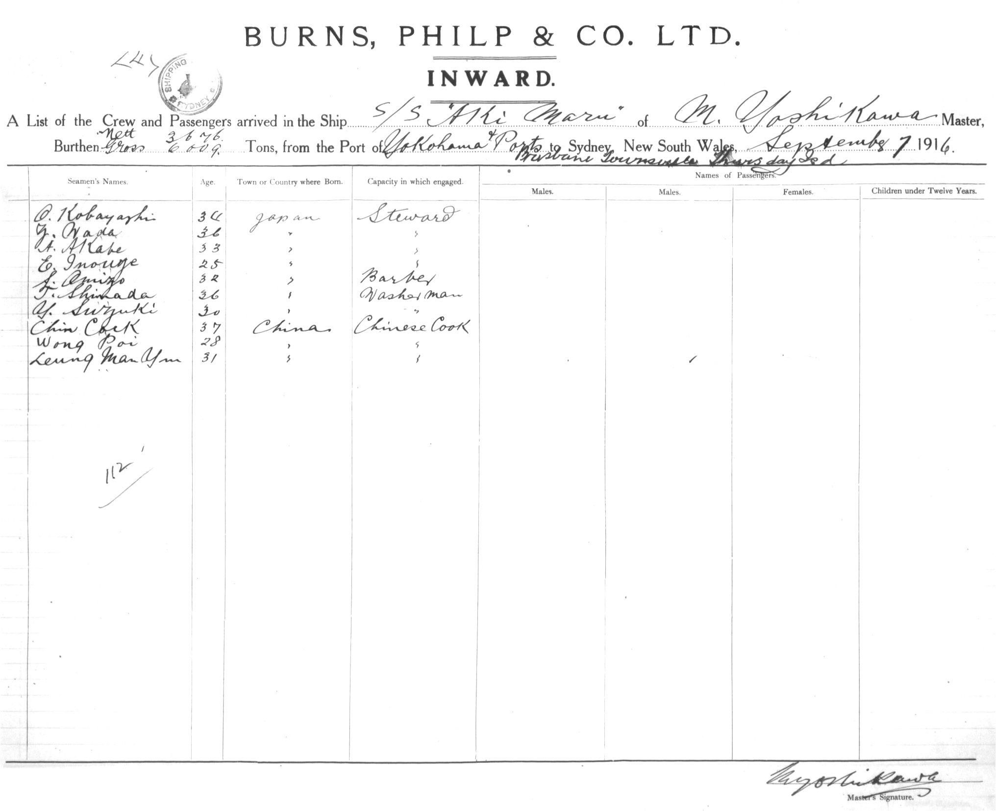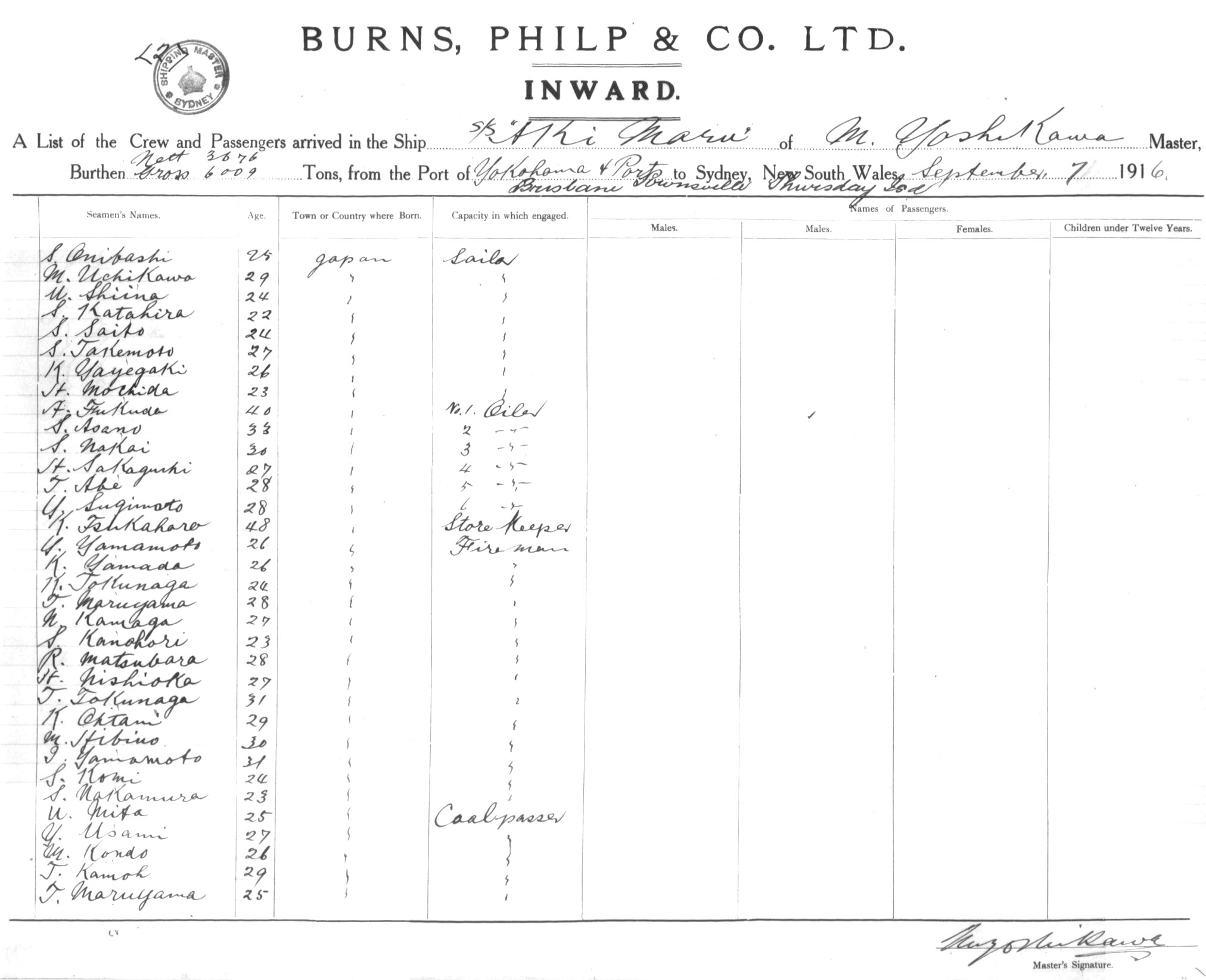 AKI MARUOF TOKYO, M. YOSHIKAWA, MASTER, BURTHEN 3676/6009 TONS FROM THE PORT OF YOKOHAMA & PORTS via THURSDAY IS. TOWNSVILLE & BRISBANE TO SYDNEY, NEW SOUTH WALES, 07 SEPTEMBER 1916 |