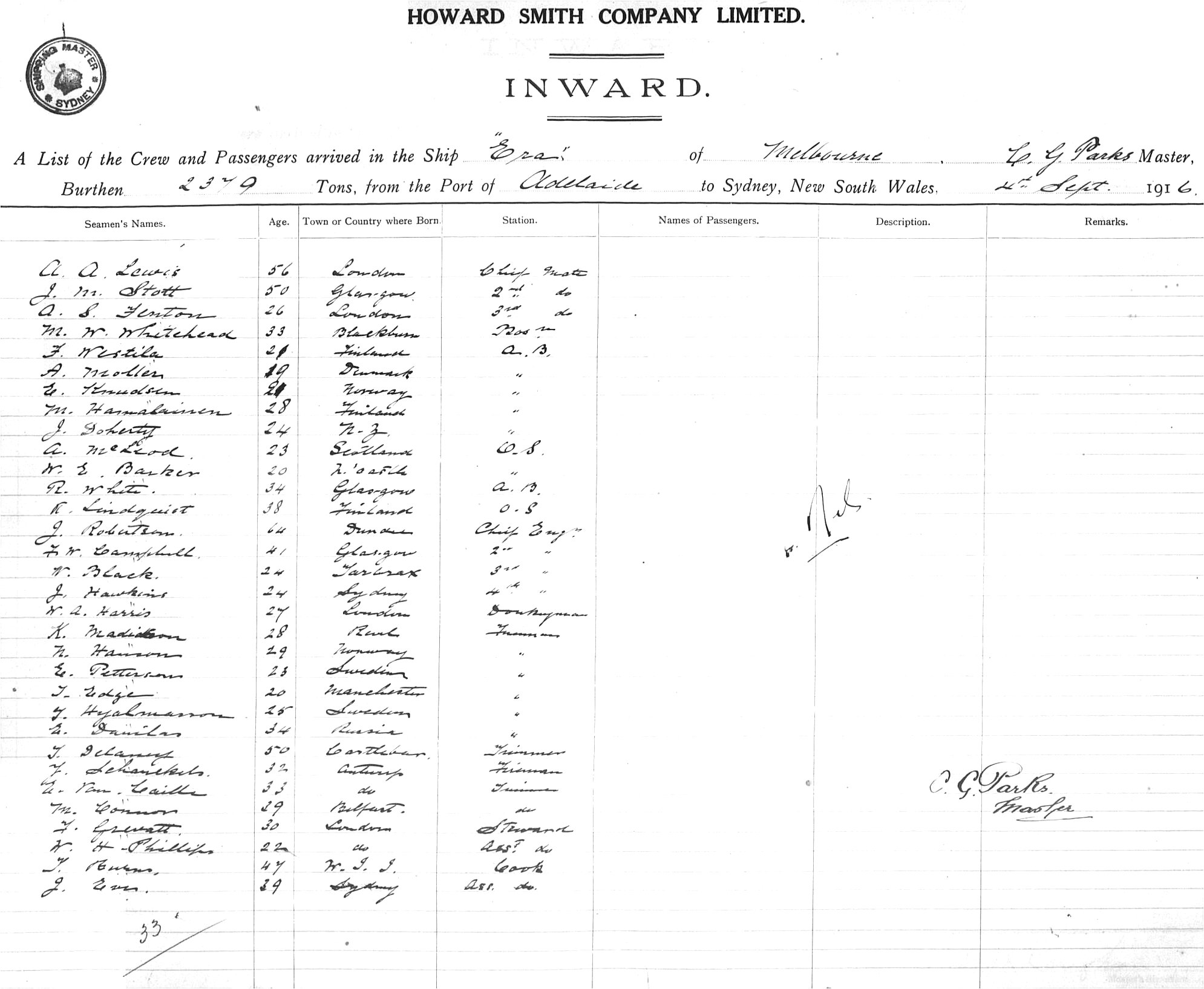 ERAOF MELBOURNE, C.G. PARKS, MASTER, BURTHEN 2379 TONS FROM THE PORT OF ADELAIDE TO SYDNEY, NEW SOUTH WALES, 04 SEPTEMBER 1916 |