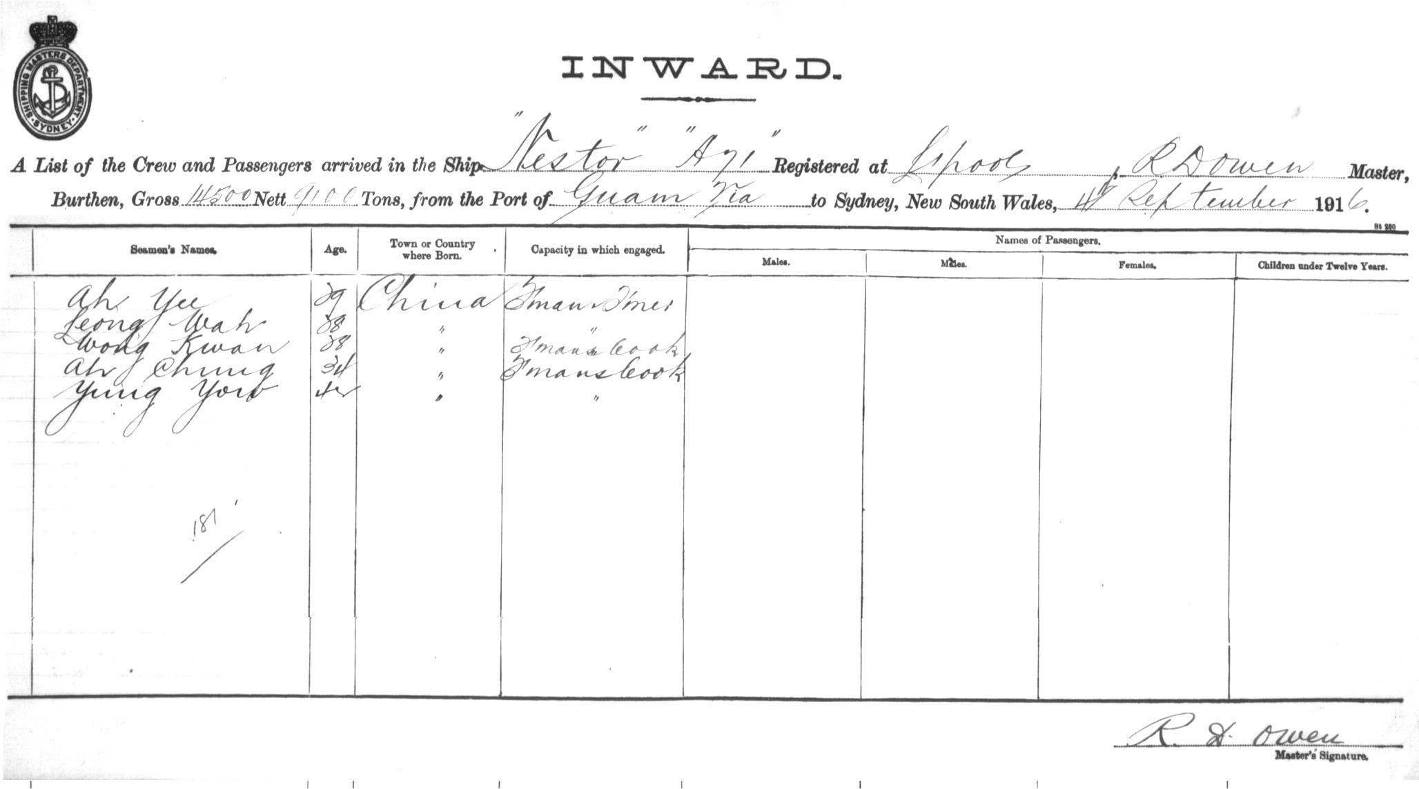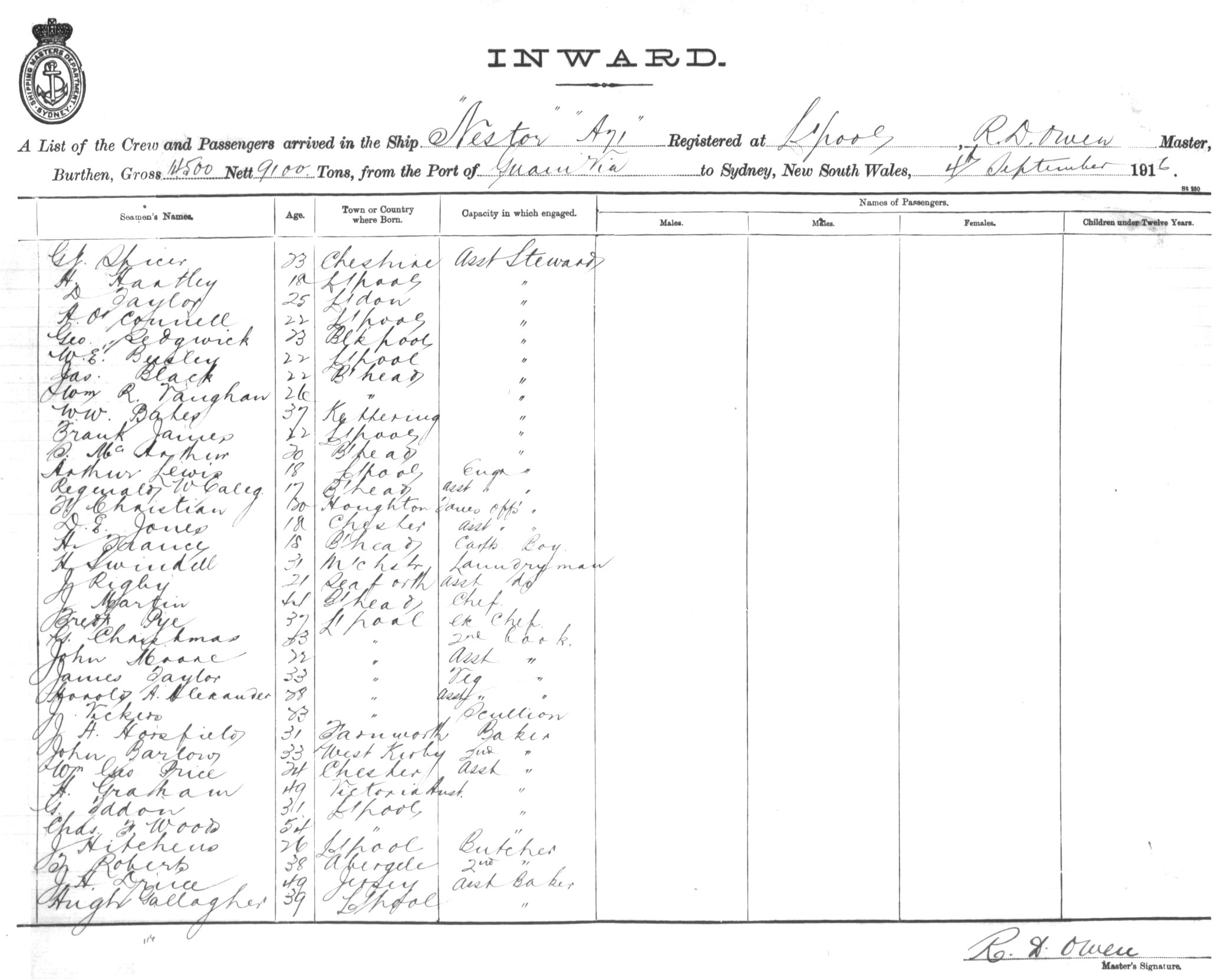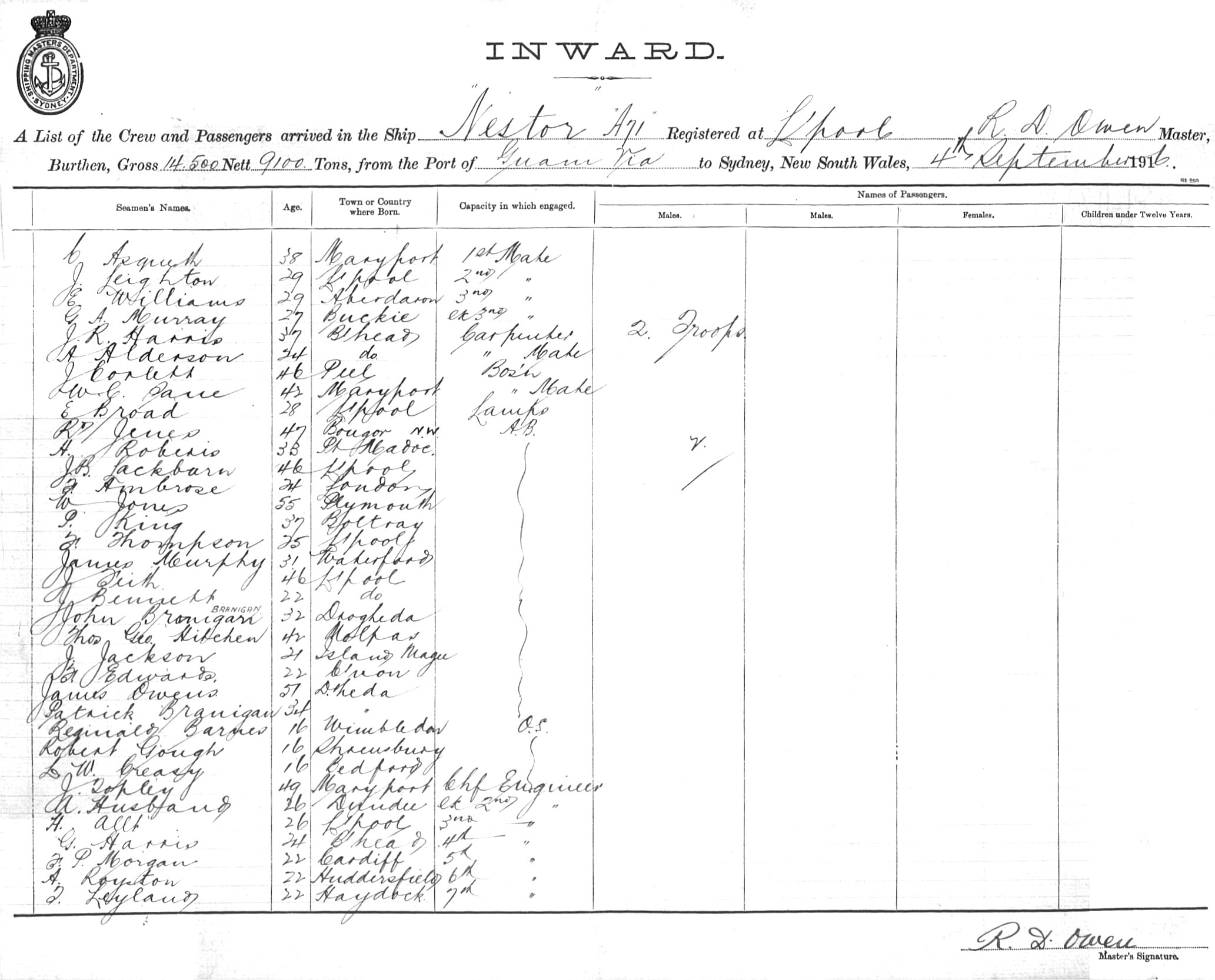 Mariners and ships in Australian Waters | NESTOROF LIVERPOOL, R. D. OWEN, MASTER, BURTHEN 14,500/9100 TONS FROM THE PORT OF GUAM TO SYDNEY, NEW SOUTH WALES, 4TH SEPTEMBER 1916 |