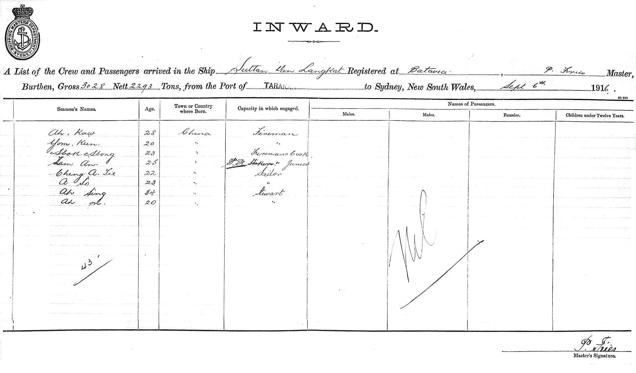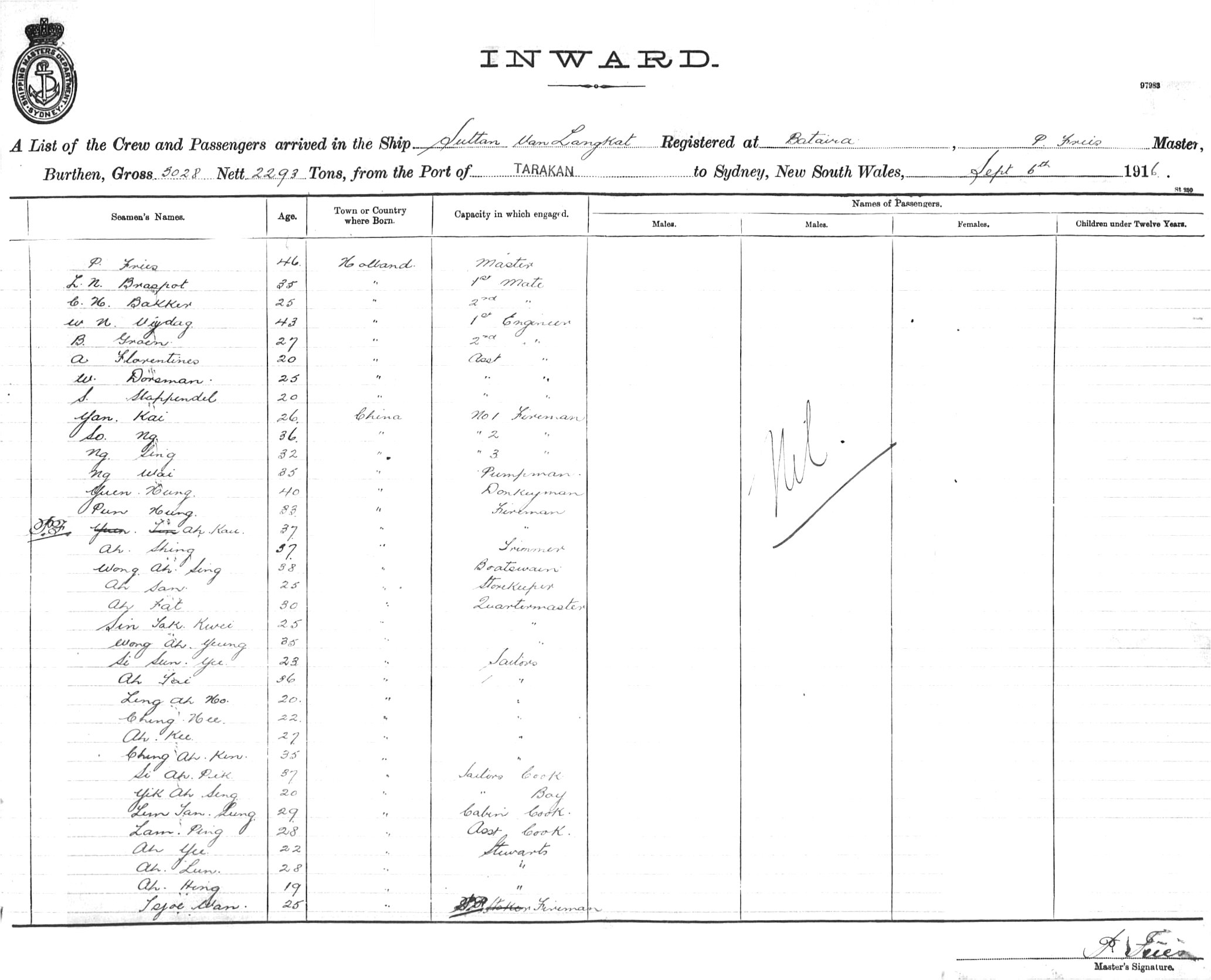 SULTAN VAN LANGKATOF BATAVIA, P. FRIES, MASTER, BURTHEN 5028/2293 TONS FROM THE PORT OF TARAKAN TO SYDNEY, NEW SOUTH WALES, 6TH SEPTEMBER 1916 |