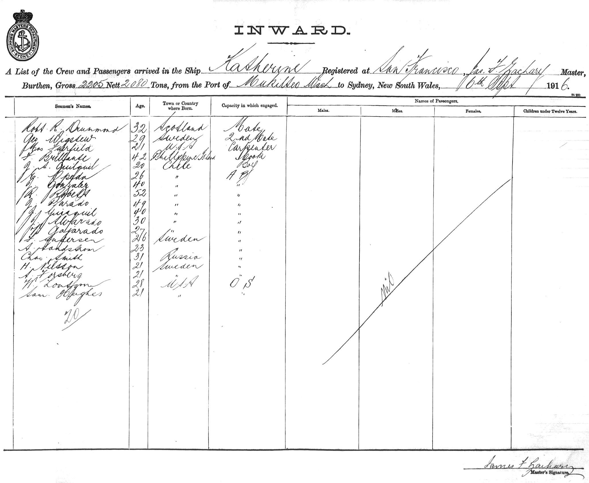 KATHERINEOF SAN FRANCISCO, JAMES F. ZACHARY, MASTER, BURTHEN 2205/2080 TONS FROM THE PORT OF MUKILTEO, WASHINGTON, U.S.A. TO SYDNEY, NEW SOUTH WALES, 6TH APRIL 1916 |