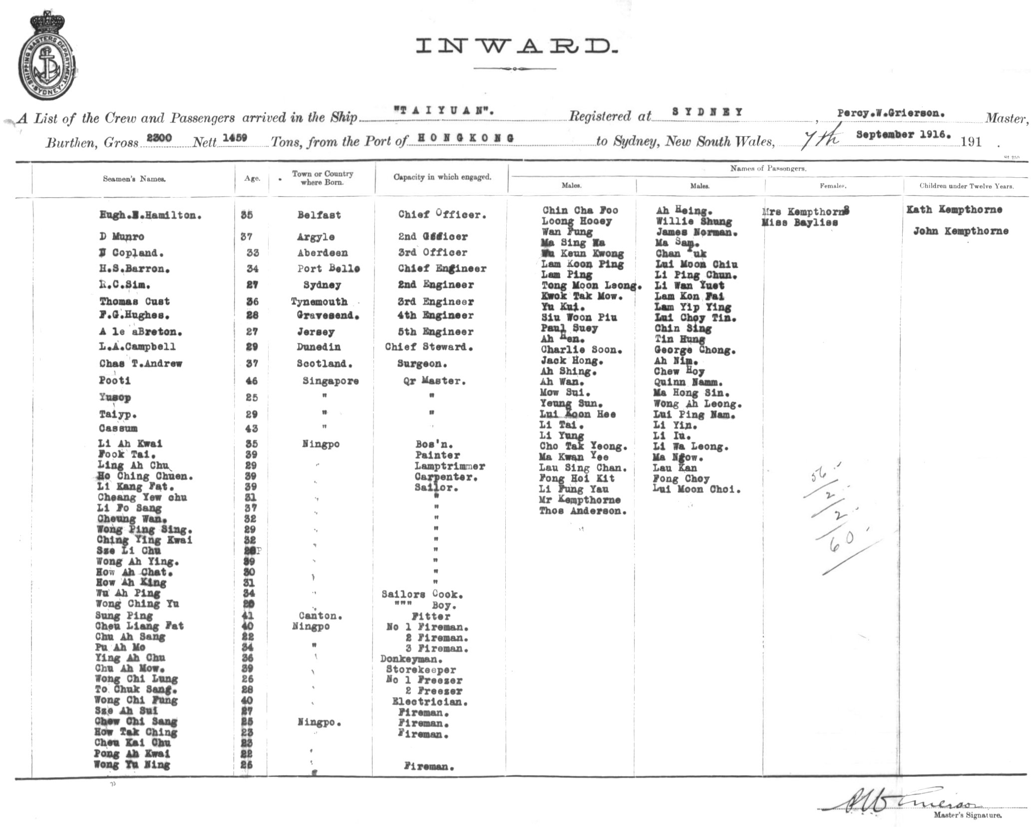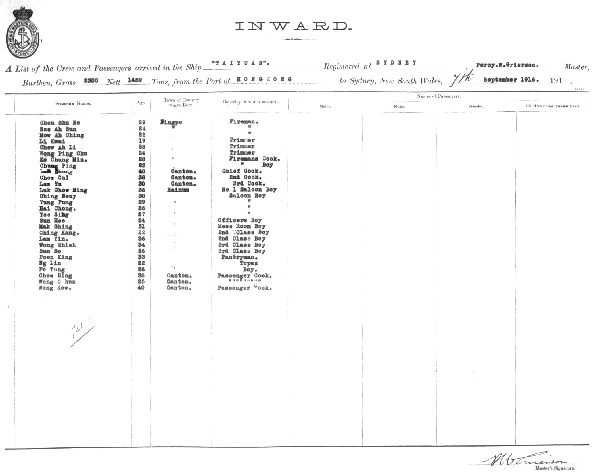 TAIYUANOF SYDNEY, PERCY W. GRIERSON, MASTER, BURTHEN 2300/1459 TONS FROM THE PORT OF HONG KONG TO SYDNEY, NEW SOUTH WALES, 7TH SEPTEMBER 1916 |