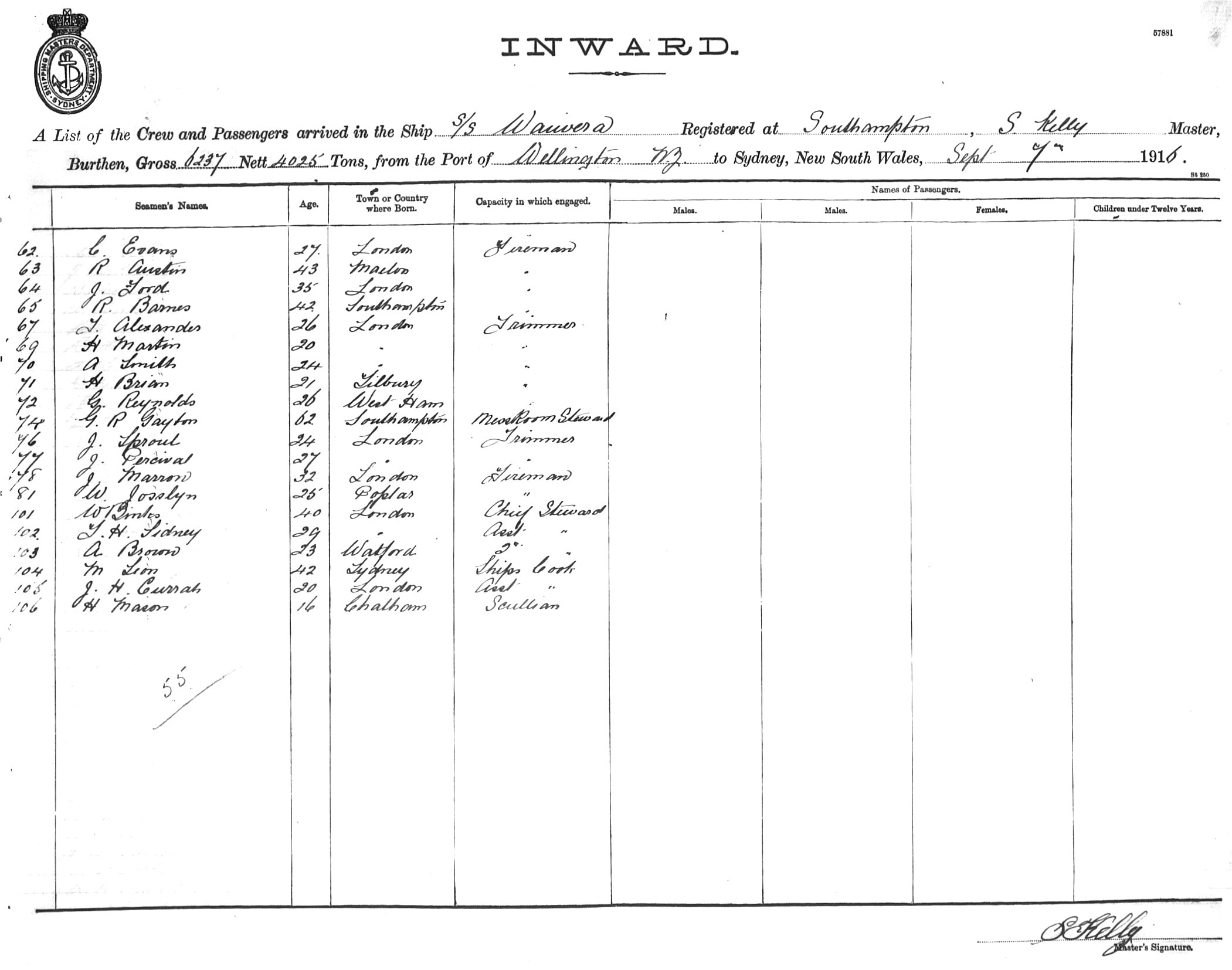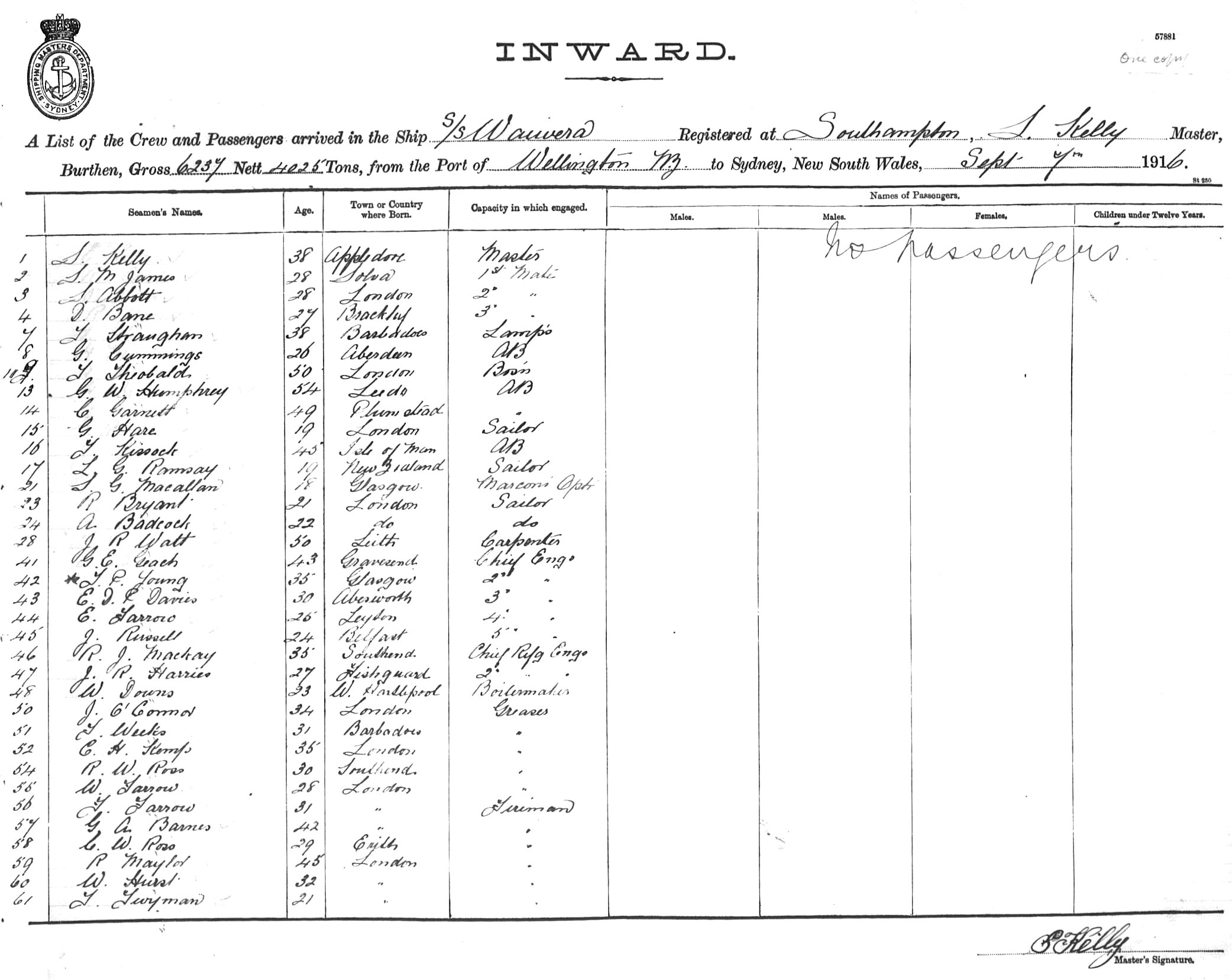WAIWERAOF SOUTHAMPTON, L. KELLY, MASTER, BURTHEN 6237/4025 TONS FROM THE PORT OF WELLINGTON, N.Z. TO SYDNEY, NEW SOUTH WALES, 7TH SEPTEMBER, 1916 |
