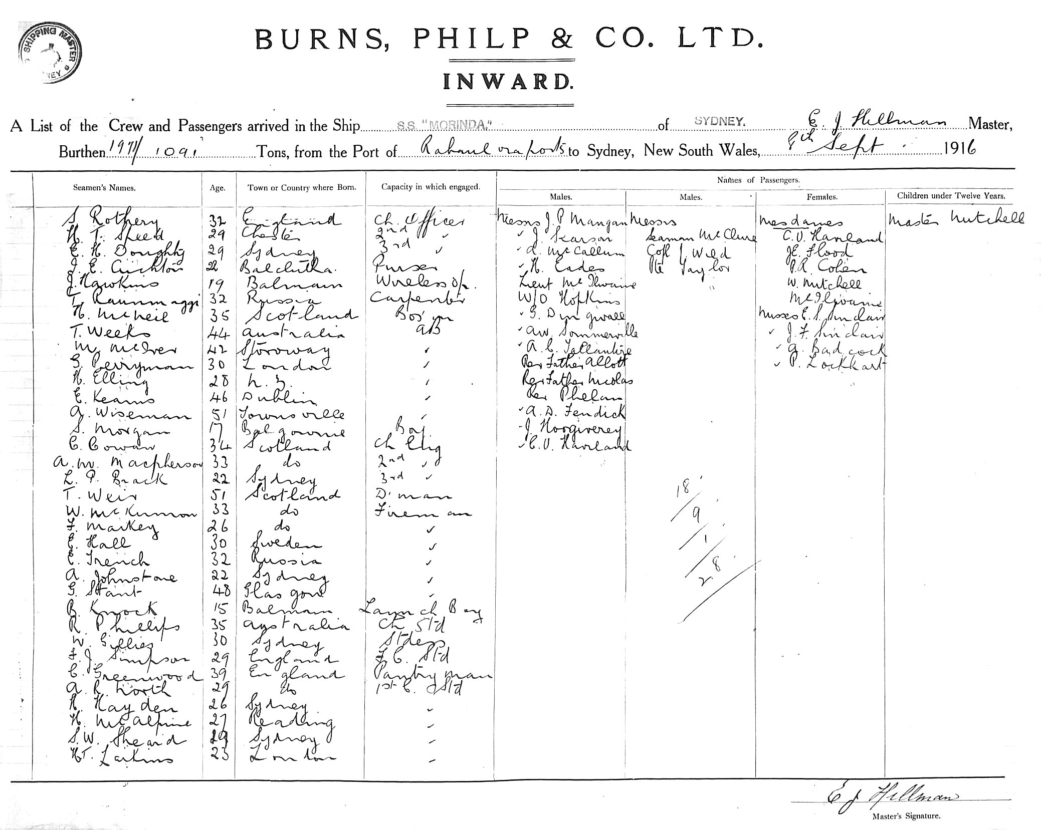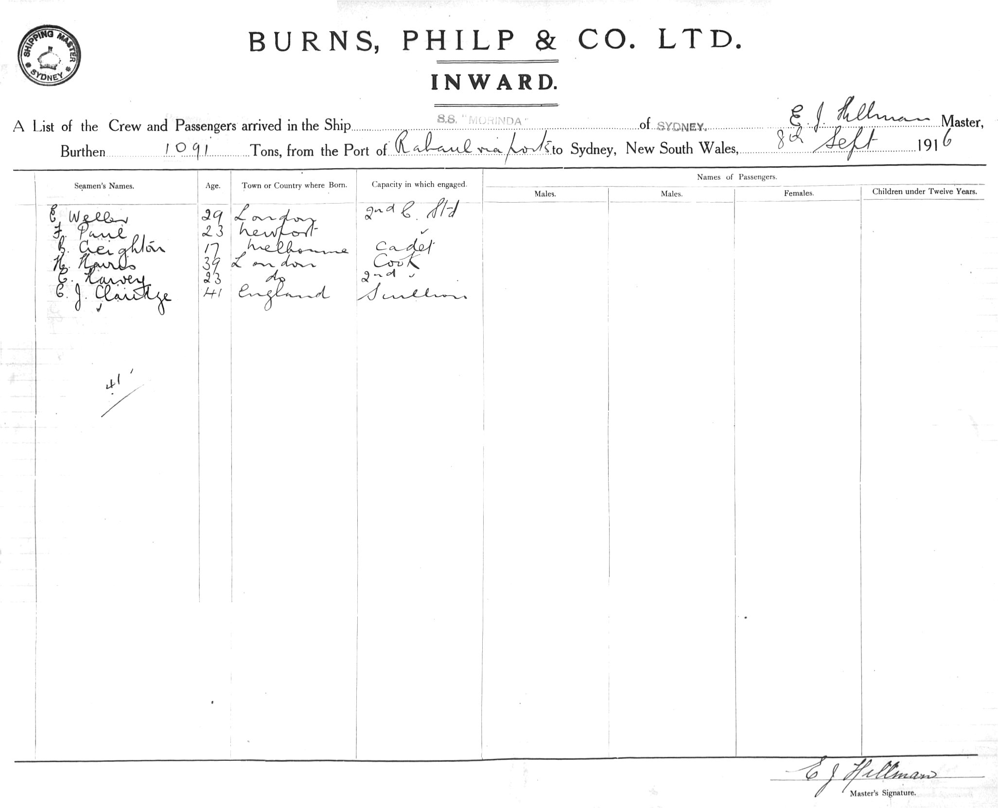 MORINDAOF SYDNEY, E. J. HILLMAN, MASTER, BURTHEN 1971/1091 TONS FROM THE PORT OF RABAUL via PORTS TO SYDNEY, NEW SOUTH WALES, 8TH SEPTEMBER 1916 |