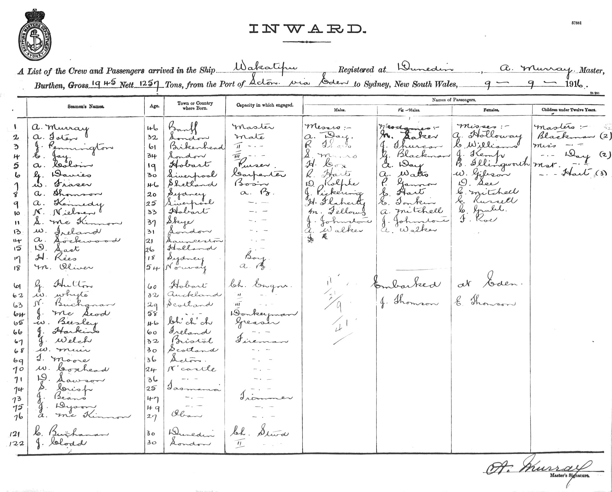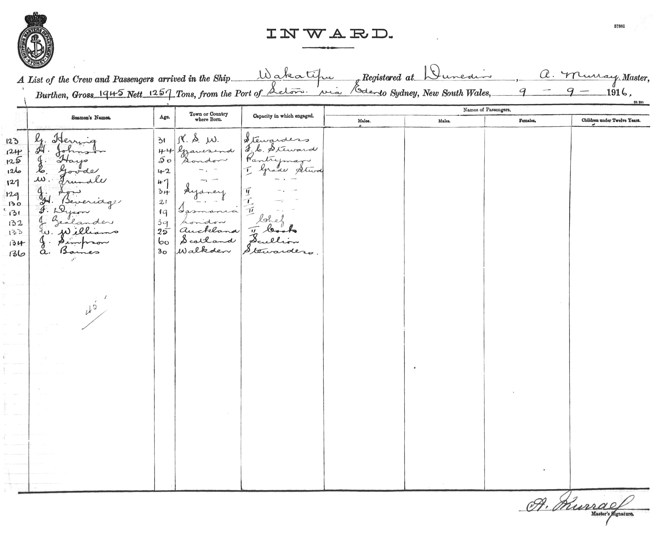 WAKATIPUOF DUNEDIN, A. MURRAY, MASTER, BURTHEN 1945/1257 TONS FROM THE PORT OF LAUNCESTON via EDEN TO SYDNEY, NEW SOUTH WALES, 9TH SEPTEMBER 1916 |